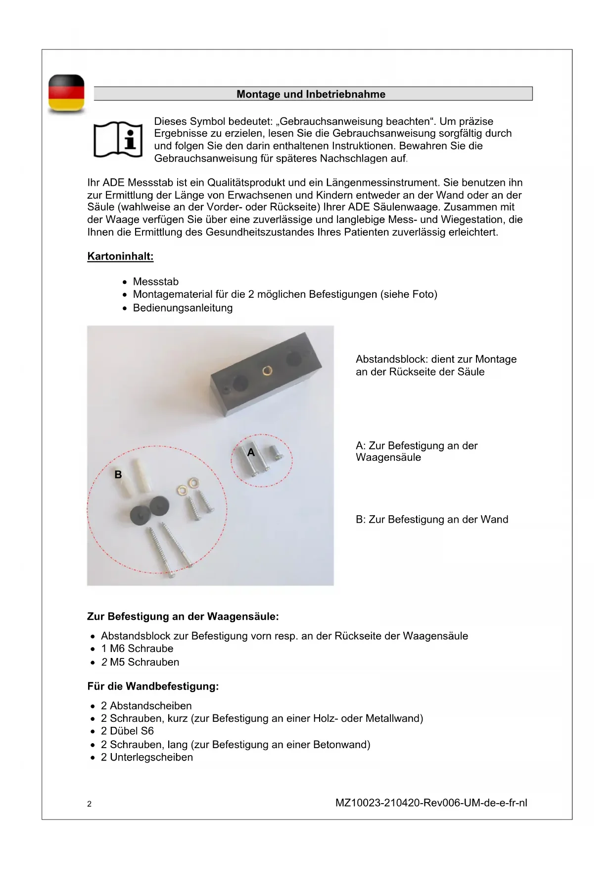 Montageanleitung Befestigung an der Waagensäule: Platzieren Sie den ausgewählten Abstandshalter (zur Befestigung des Messstabs an der Hinterseite der Säule) zunächst über die beiden Bohrungen an der Waagensäule und fixieren ihn mit den beiden M5 Schrauben. Ziehen Sie beiden Schrauben fest an. Führen Sie jetzt den Messstab mit den beiden Arretierungsbohrungen auf der bedruckten Seite des Messstabs auf den Abstandshalter und befestigen Sie ihn mit der M6 Schraube an der unteren Bohrung des Messstabes. Ziehen Sie auch hier die Schraube ganz fest. Befestigung an der Wand: Zunächst messen Sie sehr genau mit einem Zentimetermaß 56 cm vom Boden an der Wand ab. Markieren Sie diesen Punkt. Ziehen Sie den Messstab auf die volle Länge auseinander. Nachdem Sie das Loch der unteren Bohrung des Messstabes (bei ca. 60 cm auf der Skala) über den markierten Punkt gelegt haben markieren Sie jetzt mit einem Bleistift die Wand durch die obere Bohrung des Messstabes (bei ca. 122 cm auf der Skala). Benutzen Sie eine Wasserwaage. Die beiden Markierungen dienen zum Bohren der Löcher in der Wand. Stecken Sie die beiden Dübel in die gebohrten Löcher. Sie benötigen eine Unterlegscheibe für die untere Schraube. Führen Sie diese über die Schraube und danach in die untere Bohrung des Messstabes von der bedruckten Seite. Die zweite Schraube führen Sie durch die obere Bohrung. Jetzt führen Sie die beiden Abstandscheiben über die Schrauben und führen diese mit dem Messstab in die Dübel an der Wand ein. Ziehen Sie beide Schrauben sehr sorgfältig fest an. Sicherheitshinweise: Folgen Sie den Hinweisen der Bedienungsanleitung. Befestigen Sie den Messstab nur an ADE Säulenwaagen oder unter Zuhilfenahme von Zentimetermaß und Wasserwaage an der Wand. Nach dem Messvorgang klappen Sie die Messzunge bitte immer nach unten, um einer eventuellen Verletzungsgefahr vorzubeugen. Bedienung: