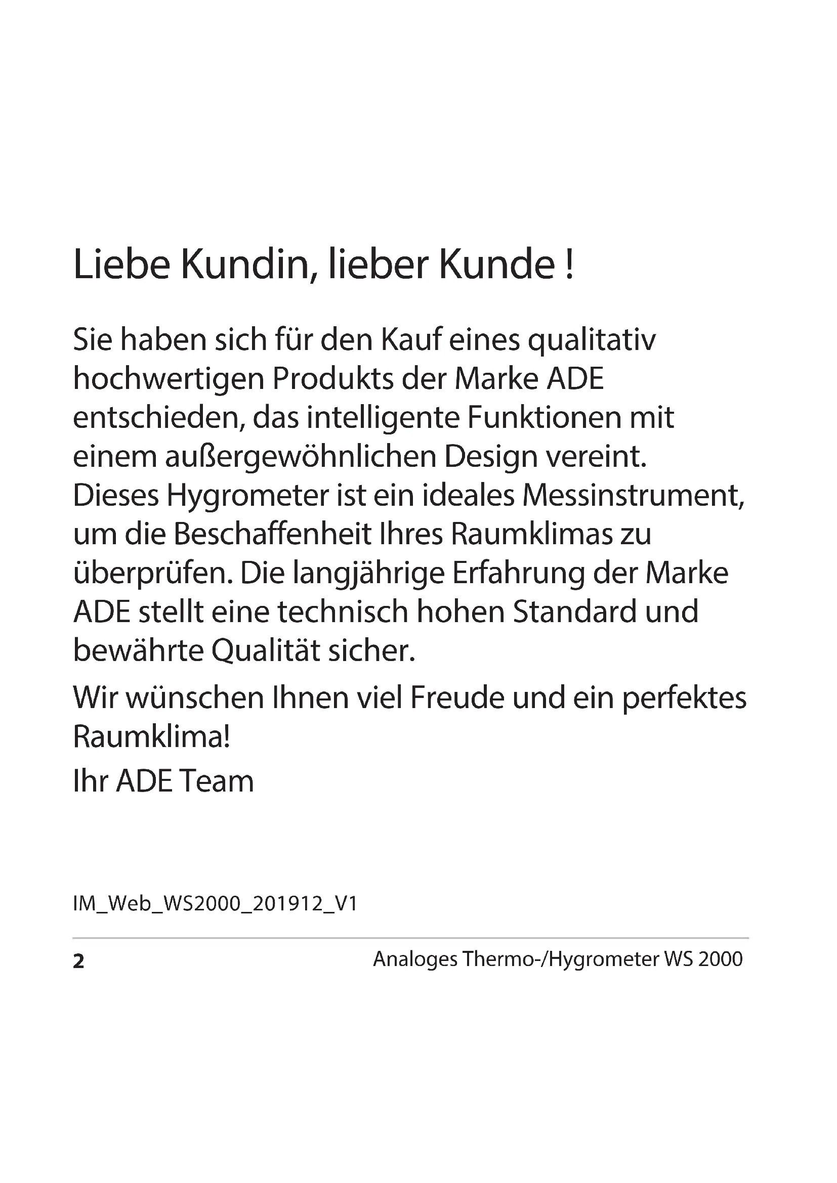 - Analoges Thermo-/Hygrometer Analogue thermometer/hygrometer | Termohigrómetro analógico | Thermomètre/ hygromètre analogique | Termoigrometro analogico | Termometr/higrometr analogowy Deutsch English Español Français Italiano Polski Bedienungsanleitung WS 2000 Operating instructions | Instrucciones de operación Mode d‘emploi | Istruzioni per l‘uso | Instrukcja obsługi2 Analoges Thermo-/Hygrometer WS 2000 Liebe Kundin, lieber Kunde ! Sie haben sich für den Kauf eines qualitativ hochwertigen Produkts der Marke ADE entschieden, das intelligente Funktionen mit einem außergewöhnlichen Design vereint. Dieses Hygrometer ist ein ideales Messinstrument, um die Beschaffenheit Ihres Raumklimas zu überprüfen. Die langjährige Erfahrung der Marke ADE stellt eine technisch hohen Standard und bewährte Qualität sicher. Wir wünschen Ihnen viel Freude und ein perfektes Raumklima! Ihr ADE Team IM_Web_WS2000_201912_V13 Deutsch Analoges Thermo-/Hygrometer WS 2000 Diese Bedienungsanleitung beschreibt den siche- ren Umgang und die Pflege des Artikels. Bewahren Sie diese Bedienungsanleitung auf, falls Sie später etwas nachlesen möchten. Wenn Sie den Artikel an jemand anderen weitergeben, geben Sie auch diese Anleitung mit. Die Nichtbeachtung dieser Bedienungsanleitung kann zu Verletzungen oder Schäden am Artikel führen. Inhaltsverzeichnis Bestimmungsgemäßer Gebrauch p. 4