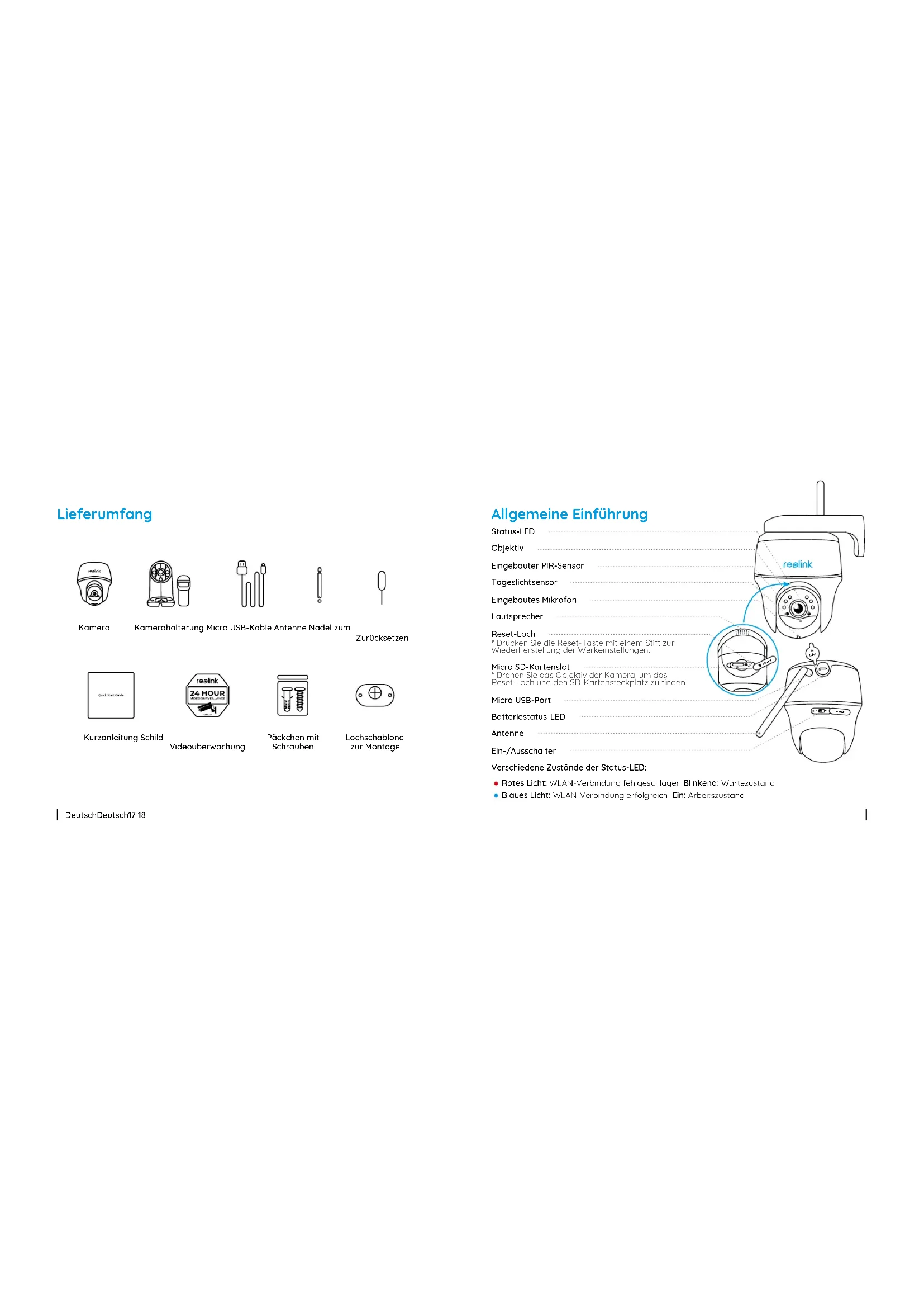 Content Lieferumfang 17 Allgemeine Einführung 18 Kamera-Einrichtung 19 AuadenderBatterie 21 Installation der Kamera 22 Wichtige Hinweise zur Verwendung der Batterie 26 Fehlerbehebung 27 Spezikationen 28 Konformitätserklärung 28Deutsch Deutsch17 18 Lieferumfang Kamera Kurzanleitung Schild Videoüberwachung Päckchen mit Schrauben Lochschablone zur Montage Kamerahalterung Micro USB-Kable Antenne Nadel zum Zurücksetzen OFF OPEN