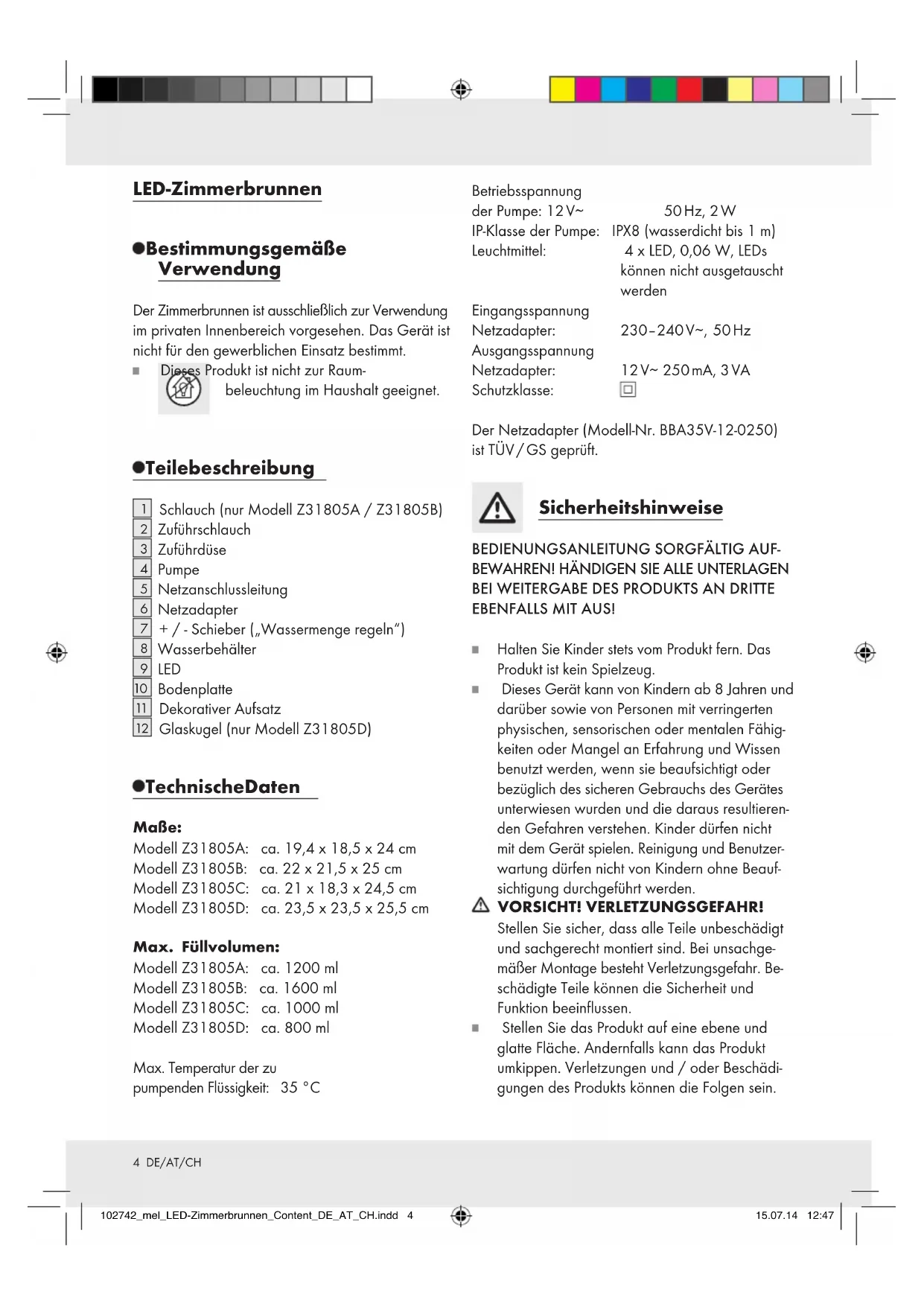 Glaskugel (nur Modell Z31805D) Technische Daten Maße: Modell Z31805A: ca. 19,4 x 18,5 x 24 cm Modell Z31805B: ca. 22 x 21,5 x 25 cm Modell Z31805C: ca. 21 x 18,3 x 24,5 cm Modell Z31805D: ca. 23,5 x 23,5 x 25,5 cm Max. Füllvolumen: Modell Z31805A: ca. 1200 ml Modell Z31805B: ca. 1600 ml Modell Z31805C: ca. 1000 ml Modell Z31805D: ca. 800 ml Max. Temperatur der zu pumpenden Flüssigkeit: 35 °C Betriebsspannung der Pumpe: 12 V∼ 50 Hz, 2 W IP-Klasse der Pumpe: IPX8 (wasserdicht bis 1 m) Leuchtmittel: 4 x LED, 0,06 W, LEDs können nicht ausgetauscht werden Eingangsspannung Netzadapter: 230–240 V∼, 50 Hz Ausgangsspannung Netzadapter: 12 V∼ 250 mA, 3 VA Schutzklasse: Der Netzadapter (Modell-Nr. BBA35V-12-0250) ist TÜV / GS geprüft. Sicherheitshinweise
