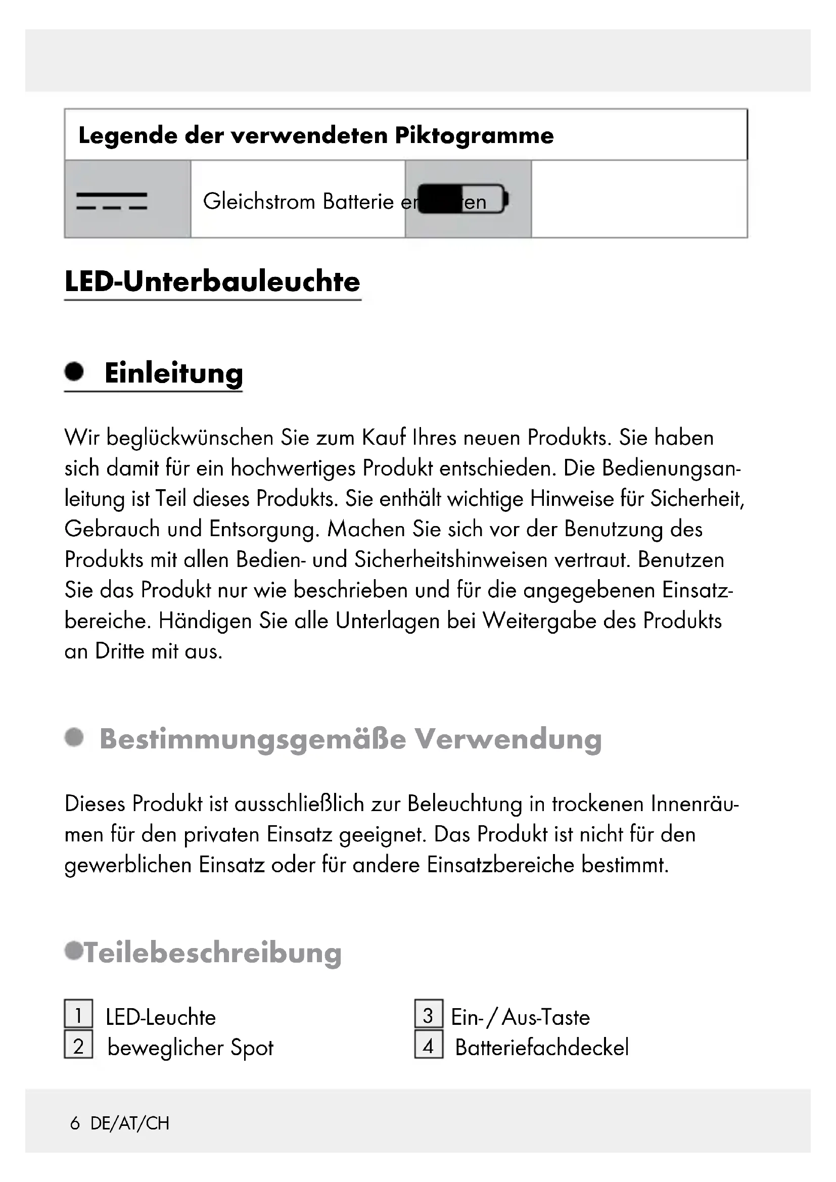 35 DE/AT/CH Legende der verwendeten Piktogramme ....Seite 6 Einleitung ................................................................................ Seite 6 Bestimmungsgemäße Verwendung ...........................................Seite 6 Teilebeschreibung ......................................................................Seite 6 Technische Daten ....................................................................... Seite 7 Lieferumfang ............................................................................... Seite 7 Allgemeine Sicherheitshinweise .........................Seite 7 Sicherheitshinweise für Batterien / Akkus ..................................Seite 8 Gebrauch ................................................................................Seite 10 Montage .....................................................................................Seite 10 Vor der Inbetriebnahme .............................................................Seite 10 Inbetriebnahme ..........................................................................Seite 10 Bewegliche Spots ein- / ausschalten .........................................Seite 11 Batterien wechseln .....................................................................Seite 11 Reinigung und Pflege ...................................................Seite 12 Entsorgung ............................................................................ Seite 12 Garantie .................................................................................. Seite 13 Abwicklung im Garantiefall .......................................................Seite 14 Service ........................................................................................Seite 156 DE/AT/CH Legende der verwendeten Piktogramme Gleichstrom Batterie enthalten LED-Unterbauleuchte Einleitung Wir beglückwünschen Sie zum Kauf Ihres neuen Produkts. Sie haben sich damit für ein hochwertiges Produkt entschieden. Die Bedienungsan- leitung ist Teil dieses Produkts. Sie enthält wichtige Hinweise für Sicherheit, Gebrauch und Entsorgung. Machen Sie sich vor der Benutzung des Produkts mit allen Bedien- und Sicherheitshinweisen vertraut. Benutzen Sie das Produkt nur wie beschrieben und für die angegebenen Einsatz- bereiche. Händigen Sie alle Unterlagen bei Weitergabe des Produkts an Dritte mit aus. Bestimmungsgemäße Verwendung Dieses Produkt ist ausschließlich zur Beleuchtung in trockenen Innenräu- men für den privaten Einsatz geeignet. Das Produkt ist nicht für den gewerblichen Einsatz oder für andere Einsatzbereiche bestimmt. Teilebeschreibung