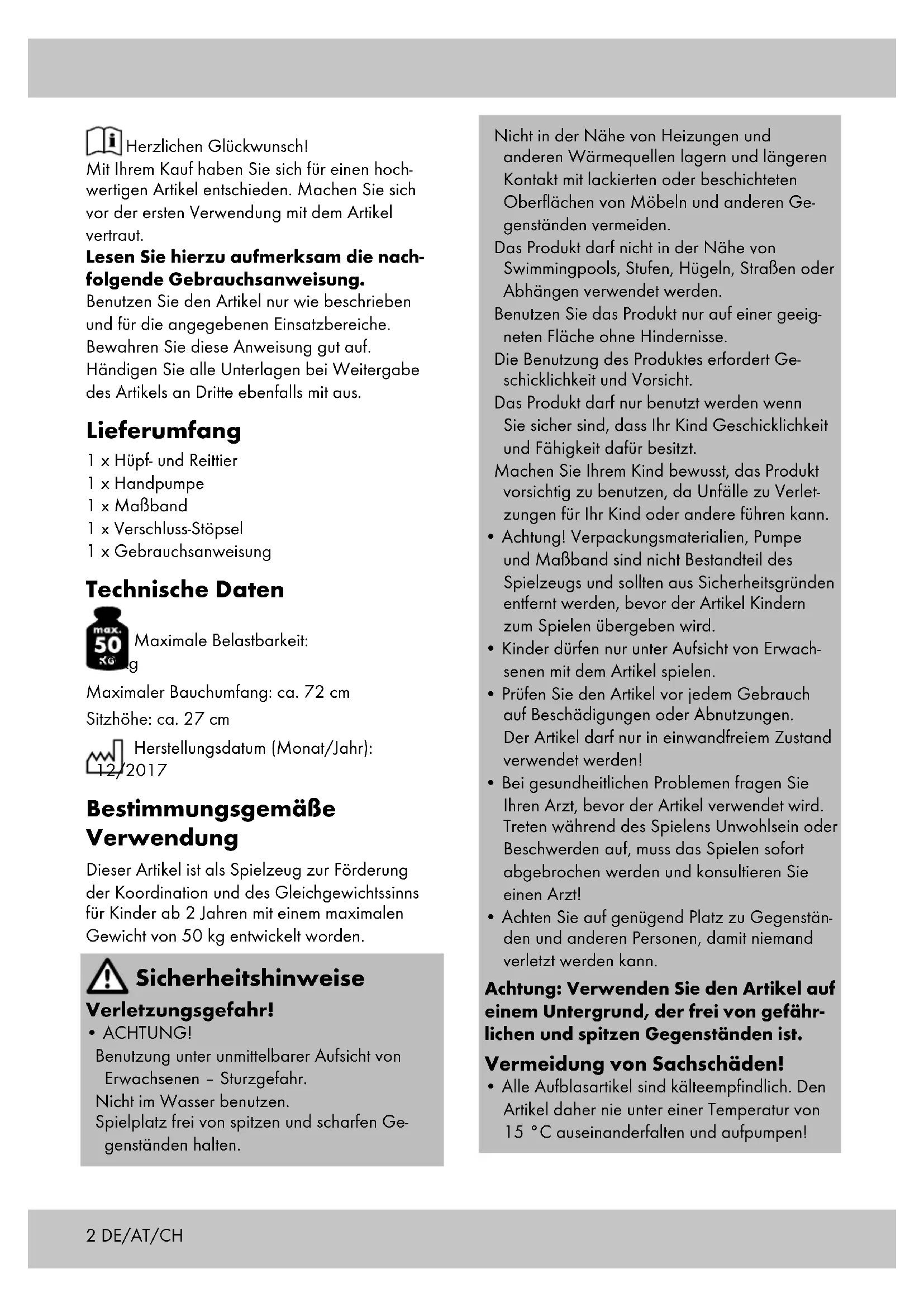 - Alle Aufblasartikel sind kälteempfindlich. Den Artikel daher nie unter einer Temperatur von 15 °C auseinanderfalten und aufpumpen! Herzlichen Glückwunsch! Mit Ihrem Kauf haben Sie sich für einen hoch- wertigen Artikel entschieden. Machen Sie sich vor der ersten Verwendung mit dem Artikel vertraut. Lesen Sie hierzu aufmerksam die nach- folgende Gebrauchsanweisung. Benutzen Sie den Artikel nur wie beschrieben und für die angegebenen Einsatzbereiche. Bewahren Sie diese Anweisung gut auf. Händigen Sie alle Unterlagen bei Weitergabe des Artikels an Dritte ebenfalls mit aus. Lieferumfang 1 x Hüpf- und Reittier 1 x Handpumpe 1 x Maßband 1 x Verschluss-Stöpsel 1 x Gebrauchsanweisung Technische Daten Maximale Belastbarkeit: 50 kg Maximaler Bauchumfang: ca. 72 cm Sitzhöhe: ca. 27 cm Herstellungsdatum (Monat/Jahr): 12/2017 Bestimmungsgemäße Verwendung Dieser Artikel ist als Spielzeug zur Förderung der Koordination und des Gleichgewichtssinns für Kinder ab 2 Jahren mit einem maximalen Gewicht von 50 kg entwickelt worden. Sicherheitshinweise Verletzungsgefahr!