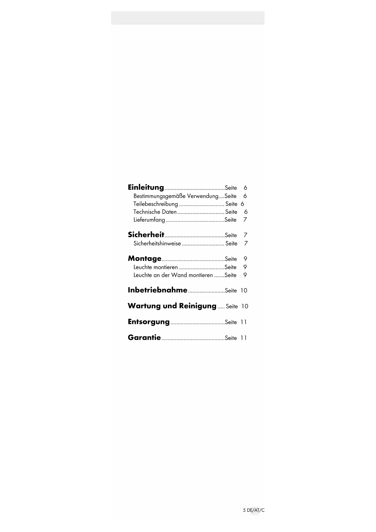 65 DE/AT/CH Einleitung .........................................Seite 6 Bestimmungsgemäße Verwendung ....Seite 6 Teilebeschreibung ............................... Seite 6 Technische Daten ................................ Seite 6 Lieferumfang ........................................Seite 7 Sicherheit .........................................Seite 7 Sicherheitshinweise ............................. Seite 7 Montage ...........................................Seite 9 Leuchte montieren ...............................Seite 9 Leuchte an der Wand montieren .......Seite 9 Inbetriebnahme .........................Seite 10 Wartung und Reinigung ..... Seite 10 Entsorgung .....................................Seite 11 Garantie ...........................................Seite 116 DE/AT/CH LED-Aufbauleuchte Einleitung Wir beglückwünschen Sie zum Kauf Ihres neuen Produkts. Sie haben sich damit für ein hochwertiges Produkt entschieden. Die Bedienungsanleitung ist Teil dieses Produkts. Sie enthält wichtige Hinweise für Sicherheit, Gebrauch und Entsorgung. Machen Sie sich vor der Benutzung des Produkts mit allen Bedien- und Sicherheitshinweisen vertraut. Benutzen Sie das Produkt nur wie beschrieben und für die angegebenen Einsatzbereiche. Händigen Sie alle Unterlagen bei Weitergabe des Produkts an Dritte mit aus. Bestimmungsgemäße Verwendung Diese Leuchte ist ausschließlich zur Verwendung im Innenbereich, in trockenen und geschlossenen Räumen vorgesehen. Das Produkt ist nicht für den gewerblichen Einsatz bestimmt.