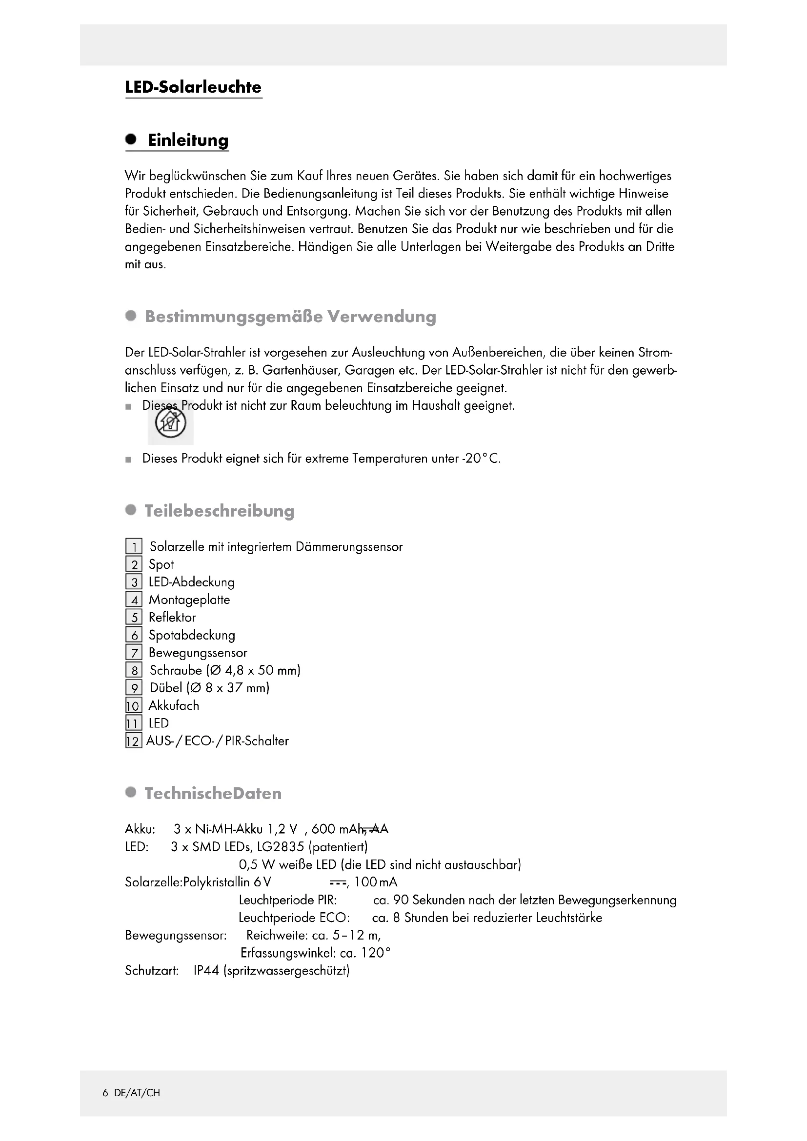 125 DE/AT/CH Einleitung Bestimmungsgemäße Verwendung ............................................................................................Seite 6 Teilebeschreibung .......................................................................................................................Seite 6 Technische Daten ........................................................................................................................Seite 6 Lieferumfang ................................................................................................................................Seite 7 Allgemeine Sicherheitshinweise ..........................................................................Seite 7 Sicherheitshinweise für Akkus ..............................................................................Seite 7 Funktion....................................................................................................................................Seite 7 Vor der ersten Inbetriebnahme Akkus aufladen ............................................................................................................................Seite 8 Montage Leuchte montieren .......................................................................................................................Seite 8 Inbetriebnahme .................................................................................................................Seite 8 Wartung / Akkus wechseln ......................................................................................Seite 9 Winterbetrieb ......................................................................................................................Seite 9 Reinigung und Pflege ....................................................................................................Seite 9 Fehlerbehebung ................................................................................................................Seite 10 Entsorgung .............................................................................................................................Seite 10 Garantie ...................................................................................................................................Seite 116 DE/AT/CH LED-Solarleuchte Einleitung Wir beglückwünschen Sie zum Kauf Ihres neuen Gerätes. Sie haben sich damit für ein hochwertiges Produkt entschieden. Die Bedienungsanleitung ist Teil dieses Produkts. Sie enthält wichtige Hinweise für Sicherheit, Gebrauch und Entsorgung. Machen Sie sich vor der Benutzung des Produkts mit allen Bedien- und Sicherheitshinweisen vertraut. Benutzen Sie das Produkt nur wie beschrieben und für die angegebenen Einsatzbereiche. Händigen Sie alle Unterlagen bei Weitergabe des Produkts an Dritte mit aus. Bestimmungsgemäße Verwendung Der LED-Solar-Strahler ist vorgesehen zur Ausleuchtung von Außenbereichen, die über keinen Strom- anschluss verfügen, z. B. Gartenhäuser, Garagen etc. Der LED-Solar-Strahler ist nicht für den gewerb- lichen Einsatz und nur für die angegebenen Einsatzbereiche geeignet. Dieses Produkt ist nicht zur Raum beleuchtung im Haushalt geeignet. Dieses Produkt eignet sich für extreme Temperaturen unter -20°C. Teilebeschreibung