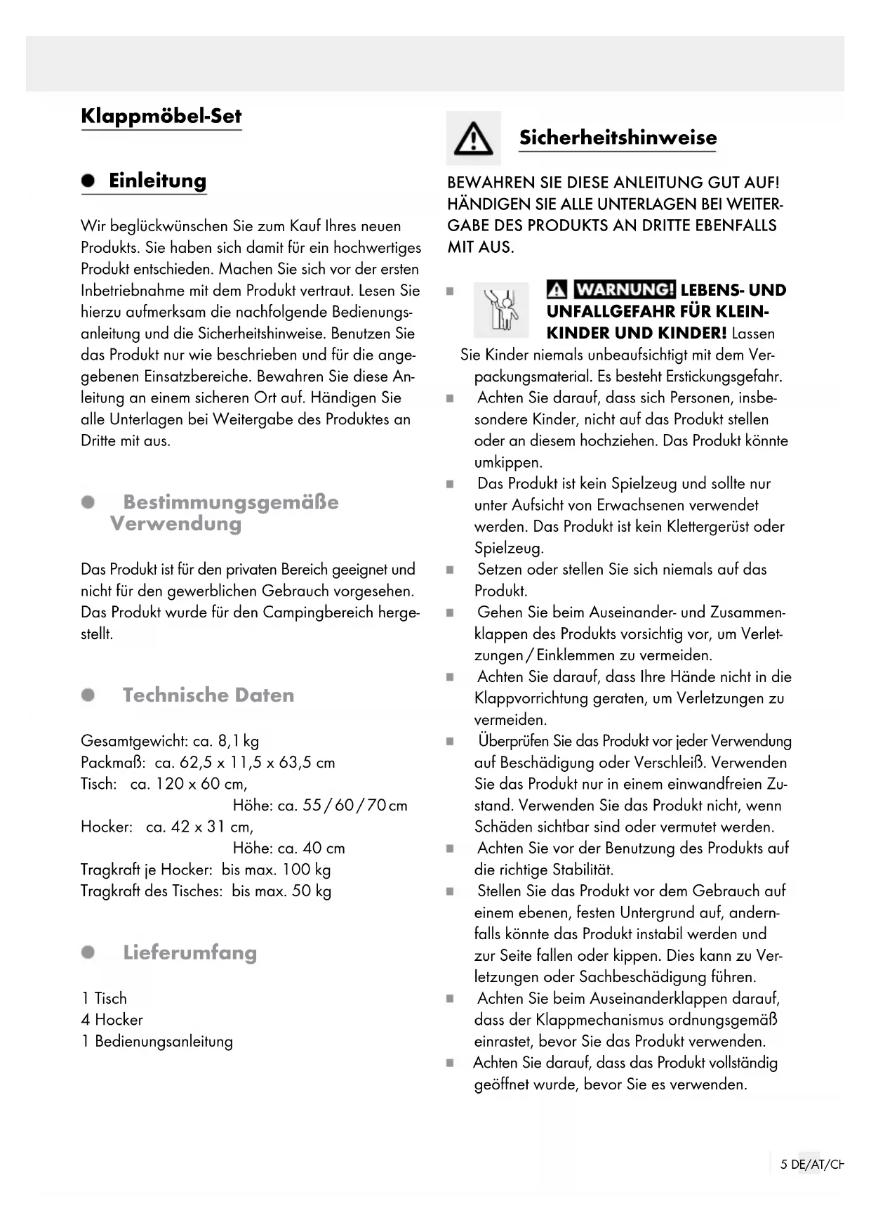 BRUG: SKAL LÆSES OMHYGGELIGT!5 DE/AT/CH Klappmöbel-Set Einleitung Wir beglückwünschen Sie zum Kauf Ihres neuen Produkts. Sie haben sich damit für ein hochwertiges Produkt entschieden. Machen Sie sich vor der ersten Inbetriebnahme mit dem Produkt vertraut. Lesen Sie hierzu aufmerksam die nachfolgende Bedienungs- anleitung und die Sicherheitshinweise. Benutzen Sie das Produkt nur wie beschrieben und für die ange- gebenen Einsatzbereiche. Bewahren Sie diese An- leitung an einem sicheren Ort auf. Händigen Sie alle Unterlagen bei Weitergabe des Produktes an Dritte mit aus. Bestimmungsgemäße Verwendung Das Produkt ist für den privaten Bereich geeignet und nicht für den gewerblichen Gebrauch vorgesehen. Das Produkt wurde für den Campingbereich herge- stellt. Technische Daten Gesamtgewicht: ca. 8,1 kg Packmaß: ca. 62,5 x 11,5 x 63,5 cm Tisch: ca. 120 x 60 cm, Höhe: ca. 55 / 60 / 70 cm Hocker: ca. 42 x 31 cm, Höhe: ca. 40 cm Tragkraft je Hocker: bis max. 100 kg Tragkraft des Tisches: bis max. 50 kg Lieferumfang 1 Tisch 4 Hocker 1 Bedienungsanleitung Sicherheitshinweise BEWAHREN SIE DIESE ANLEITUNG GUT AUF! HÄNDIGEN SIE ALLE UNTERLAGEN BEI WEITER-