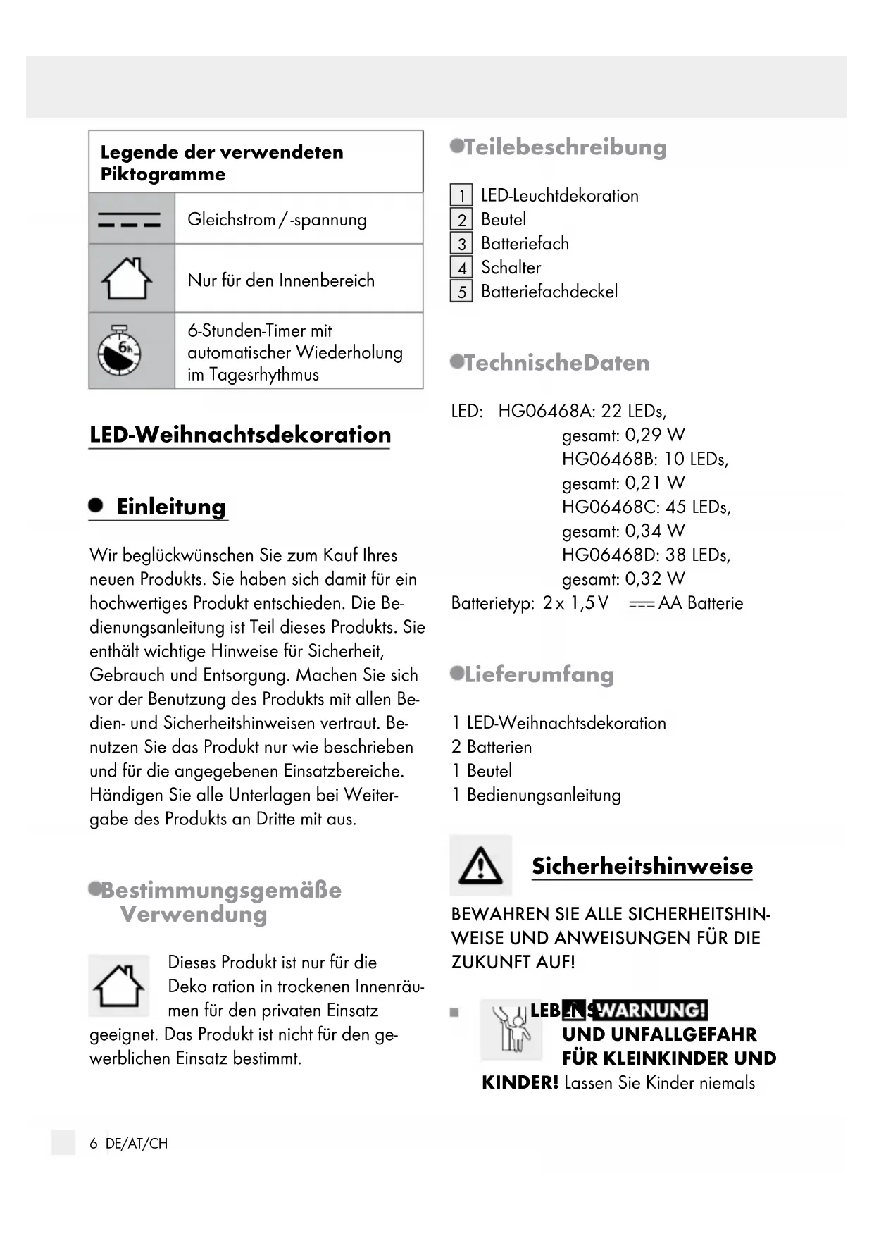 15 DE/AT/CH Legende der verwendeten Piktogramme ......................................Seite 6 Einleitung ....................................................................................................................Seite 6 Bestimmungsgemäße Verwendung ...............................................................................Seite 6 Teilebeschreibung .......................................................................................................... Seite 6 Technische Daten ........................................................................................................... Seite 6 Lieferumfang ................................................................................................................... Seite 6 Sicherheitshinweise ...........................................................................................Seite 6 Sicherheitshinweise für Batterien / Akkus ......................................................................Seite 7 Inbetriebnahme .................................................................................................... Seite 8 Batterien einlegen / wechseln ........................................................................................Seite 8 Ein- und ausschalten .......................................................................................................Seite 8 Reinigung und Pflege .......................................................................................Seite 8 Entsorgung ................................................................................................................ Seite 9 Garantie und Service .......................................................................................Seite 9 Abwicklung im Garantiefall ...........................................................................................Seite 9 Service ............................................................................................................................Seite 106 DE/AT/CH Legende der verwendeten Piktogramme Gleichstrom / -spannung Nur für den Innenbereich 6-Stunden-Timer mit automatischer Wiederholung im Tagesrhythmus LED-Weihnachtsdekoration Einleitung Wir beglückwünschen Sie zum Kauf Ihres neuen Produkts. Sie haben sich damit für ein hochwertiges Produkt entschieden. Die Be- dienungsanleitung ist Teil dieses Produkts. Sie enthält wichtige Hinweise für Sicherheit, Gebrauch und Entsorgung. Machen Sie sich vor der Benutzung des Produkts mit allen Be- dien- und Sicherheitshinweisen vertraut. Be- nutzen Sie das Produkt nur wie beschrieben und für die angegebenen Einsatzbereiche. Händigen Sie alle Unterlagen bei Weiter- gabe des Produkts an Dritte mit aus. Bestimmungsgemäße Verwendung Dieses Produkt ist nur für die Deko ration in trockenen Innenräu- men für den privaten Einsatz geeignet. Das Produkt ist nicht für den ge- werblichen Einsatz bestimmt. Teilebeschreibung