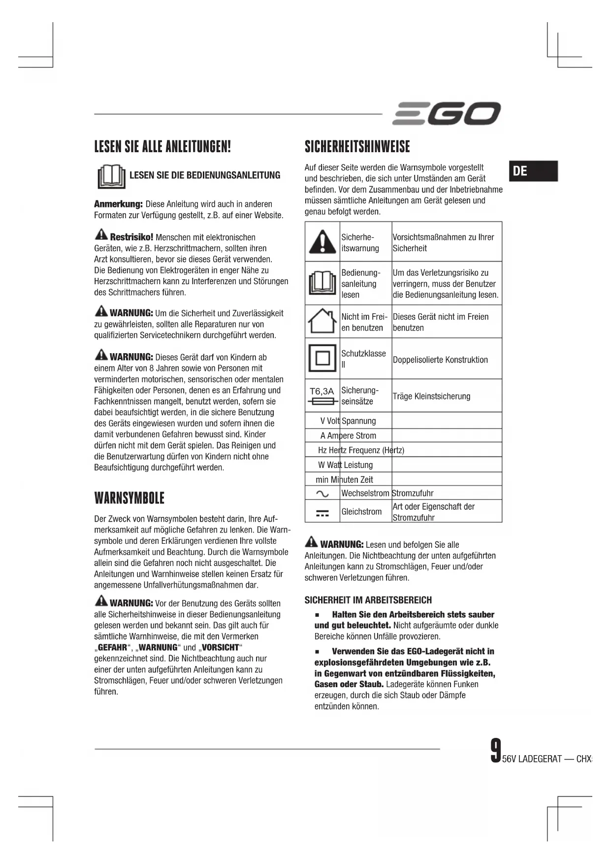 - Verwenden Sie das EGO-Ladegerät nicht in explosionsgeführdaten Umgebungen wie z.B. in Gegenwart von entzündbaren Flüssigkeiten, Gasen oder Staub. Ladegeräte können Funken erzeugen, durch die sich Staub oder Dämpfe entzünden können.