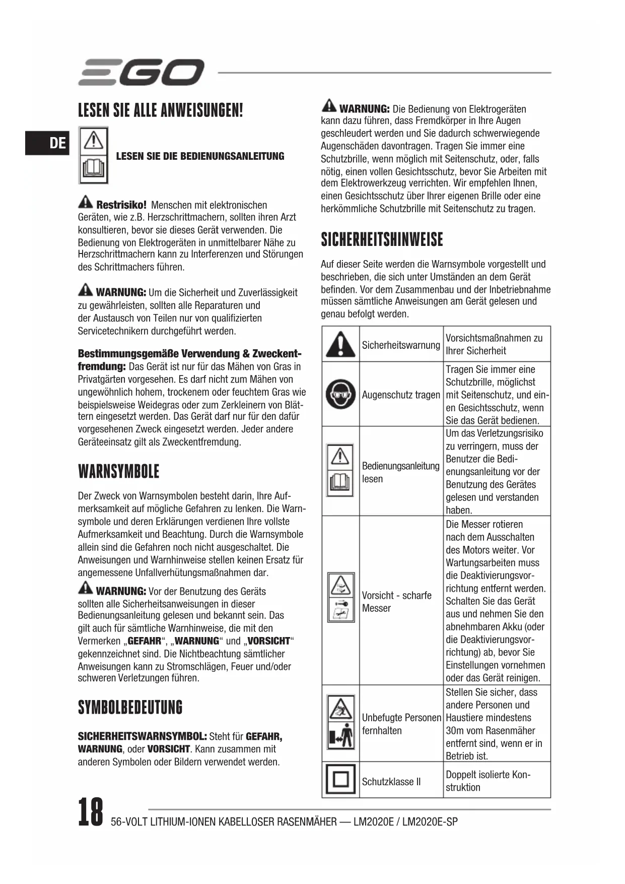 Restrisiko! Menschen mit elektronischen Geräten, wie z.B. Herzschrittmachern, sollten ihren Arzt konsultieren, bevor sie dieses Gerät verwenden. Die Bedienung von Elektrogeräten in unmittelbarer Nähe zu Herzschrittmachern kann zu Interferenzen und Störungen des Schrittmachers führen. WARNUNG: Um die Sicherheit und Zuverlässigkeit zu gewährleisten, sollten alle Reparaturen und der Austausch von Teilen nur von qualizierten Servicetechnikern durchgeführt werden. Bestimmungsgemäße Verwendung & Zweckent- fremdung: Das Gerät ist nur für das Mähen von Gras in Privatgärten vorgesehen. Es darf nicht zum Mähen von ungewöhnlich hohem, trockenem oder feuchtem Gras wie beispielsweise Weidegras oder zum Zerkleinern von Blät-tern eingesetzt werden. Das Gerät darf nur für den dafür vorgesehenen Zweck eingesetzt werden. Jeder andere Geräteeinsatz gilt als Zweckentfremdung. WARNSYMBOLE Der Zweck von Warnsymbolen besteht darin, Ihre Auf-merksamkeit auf mögliche Gefahren zu lenken. Die Warn-symbole und deren Erklärungen verdienen Ihre vollste Aufmerksamkeit und Beachtung. Durch die Warnsymbole allein sind die Gefahren noch nicht ausgeschaltet. Die Anweisungen und Warnhinweise stellen keinen Ersatz für angemessene Unfallverhütungsmaßnahmen dar. WARNUNG: Vor der Benutzung des Geräts sollten alle Sicherheitsanweisungen in dieser Bedienungsanleitung gelesen und bekannt sein. Das gilt auch für sämtliche Warnhinweise, die mit den Vermerken „GEFAHR“, „WARNUNG“ und „VORSICHT“ gekennzeichnet sind. Die Nichtbeachtung sämtlicher Anweisungen kann zu Stromschlägen, Feuer und/oder schweren Verletzungen führen. SYMBOLBEDEUTUNG SICHERHEITSWARNSYMBOL: Steht für GEFAHR, WARNUNG, oder VORSICHT. Kann zusammen mit anderen Symbolen oder Bildern verwendet werden. WARNUNG: Die Bedienung von Elektrogeräten kann dazu führen, dass Fremdkörper in Ihre Augen geschleudert werden und Sie dadurch schwerwiegende Augenschäden davontragen. Tragen Sie immer eine Schutzbrille, wenn möglich mit Seitenschutz, oder, falls nötig, einen vollen Gesichtsschutz, bevor Sie Arbeiten mit dem Elektrowerkzeug verrichten. Wir empfehlen Ihnen, einen Gesichtsschutz über Ihrer eigenen Brille oder eine herkömmliche Schutzbrille mit Seitenschutz zu tragen. SICHERHEITSHINWEISE Auf dieser Seite werden die Warnsymbole vorgestellt und beschrieben, die sich unter Umständen an dem Gerät benden. Vor dem Zusammenbau und der Inbetriebnahme müssen sämtliche Anweisungen am Gerät gelesen und genau befolgt werden.SicherheitswarnungVorsichtsmaßnahmen zu Ihrer SicherheitAugenschutz tragenTragen Sie immer eine Schutzbrille, möglichst mit Seitenschutz, und ein-en Gesichtsschutz, wenn Sie das Gerät bedienen.Bedienungsanleitung lesenUm das Verletzungsrisiko zu verringern, muss der Benutzer die Bedi-enungsanleitung vor der Benutzung des Gerätes gelesen und verstanden haben.Vorsicht - scharfe MesserDie Messer rotieren nach dem Ausschalten des Motors weiter. Vor Wartungsarbeiten muss die Deaktivierungsvor-richtung entfernt werden. Schalten Sie das Gerät aus und nehmen Sie den abnehmbaren Akku (oder die Deaktivierungsvor-richtung) ab, bevor Sie Einstellungen vornehmen oder das Gerät reinigen.Unbefugte Personen fernhaltenStellen Sie sicher, dass andere Personen und Haustiere mindestens 30m vom Rasenmäher entfernt sind, wenn er in Betrieb ist.Schutzklasse IIDoppelt isolierte Kon-struktion19 56-VOLT LITHIUM-IONEN KABELLOSER RASENMÄHER — LM2020E / LM2020E-SP