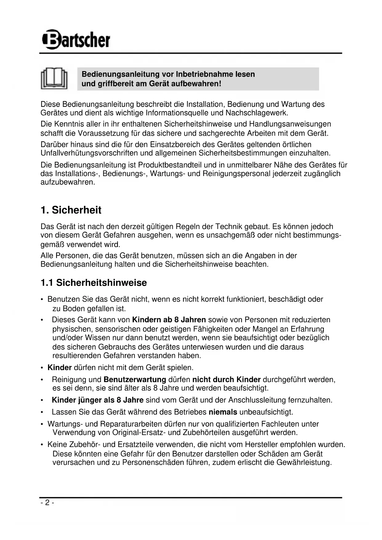 Bartscher GmbH Franz-Kleine-Str. 28 D-33154 Salzkotten Tel.: +49 (0) 5258 971-0 Service-Hotline: 0180 5 971 197 Germany Fax: +49 (0) 5258 971- 120 (14ct/Min. aus dem deutschen Festnetz) D/A/CH- 2 -