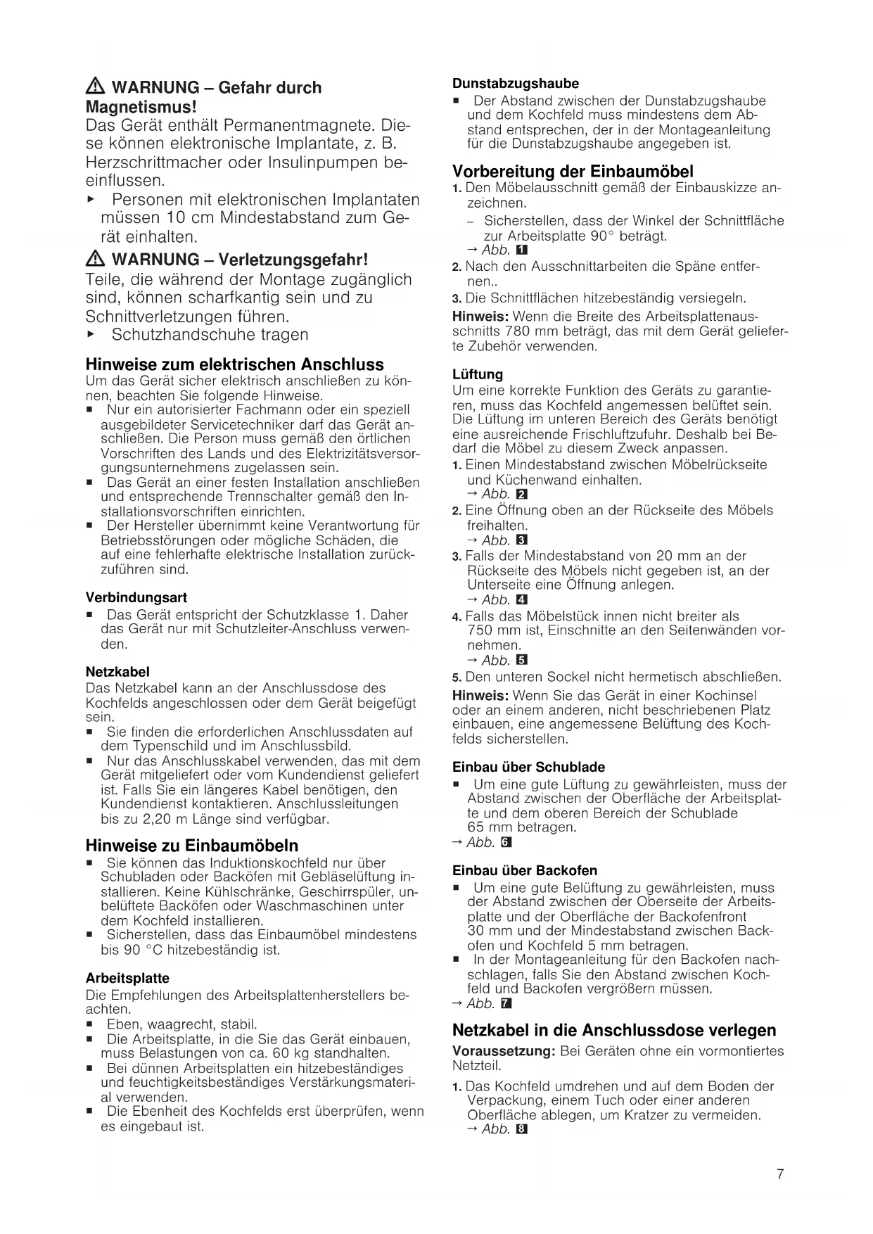 Allgemeine Hinweise ¡ Lesen Sie diese Anleitung sorgfältig. ¡ Nur eine konzessionierte Fachkraft darf das Gerät anschließen. ¡ Eine unsachgemäße Installation, Öffnung des Geräts, Verbindung oder Montage führt zum Verlust der Gültigkeit der Pro- duktgarantie. ¡ Vor der Durchführung jeglicher Arbeiten die Stromzufuhr abstellen. ¡ Nach der Installation sicherstellen, dass der Benutzer keinen Zugang zu den elek- trischen Bauteilen hat. ¡ Nie dieses Gerät in Booten oder Fahrzeu- gen verwenden. Sichere Montage Beachten Sie diese Sicherheitshinweise, wenn Sie das Gerät montieren. Nur bei fachgerechtem Einbau entspre- chend der Montageanleitung ist die Sicher- heit beim Gebrauch gewährleistet. Der In- stallateur ist für das einwandfreie Funktio- nieren am Aufstellungsort verantwortlich.7 WARNUNG‒Gefahr durch Magnetismus! Das Gerät enthält Permanentmagnete. Die- se können elektronische Implantate, z.B. Herzschrittmacher oder Insulinpumpen be- einflussen. ▶ Personen mit elektronischen Implantaten müssen 10cm Mindestabstand zum Ge- rät einhalten. WARNUNG‒Verletzungsgefahr! Teile, die während der Montage zugänglich sind, können scharfkantig sein und zu Schnittverletzungen führen. ▶ Schutzhandschuhe tragen Hinweise zum elektrischen Anschluss Um das Gerät sicher elektrisch anschließen zu kön- nen, beachten Sie folgende Hinweise. ¡ Nur ein autorisierter Fachmann oder ein speziell ausgebildeter Servicetechniker darf das Gerät an- schließen. Die Person muss gemäß den örtlichen Vorschriften des Lands und des Elektrizitätsversor- gungsunternehmens zugelassen sein. ¡ Das Gerät an einer festen Installation anschließen und entsprechende Trennschalter gemäß den In- stallationsvorschriften einrichten. ¡ Der Hersteller übernimmt keine Verantwortung für Betriebsstörungen oder mögliche Schäden, die auf eine fehlerhafte elektrische Installation zurück- zuführen sind. Verbindungsart ¡ Das Gerät entspricht der Schutzklasse 1. Daher das Gerät nur mit Schutzleiter-Anschluss verwen- den. Netzkabel Das Netzkabel kann an der Anschlussdose des Kochfelds angeschlossen oder dem Gerät beigefügt sein. ¡ Sie finden die erforderlichen Anschlussdaten auf dem Typenschild und im Anschlussbild. ¡ Nur das Anschlusskabel verwenden, das mit dem Gerät mitgeliefert oder vom Kundendienst geliefert ist. Falls Sie ein längeres Kabel benötigen, den Kundendienst kontaktieren. Anschlussleitungen bis zu 2,20m Länge sind verfügbar. Hinweise zu Einbaumöbeln ¡ Sie können das Induktionskochfeld nur über Schubladen oder Backöfen mit Gebläselüftung in- stallieren. Keine Kühlschränke, Geschirrspüler, un- belüftete Backöfen oder Waschmaschinen unter dem Kochfeld installieren. ¡ Sicherstellen, dass das Einbaumöbel mindestens bis 90°C hitzebeständig ist. Arbeitsplatte Die Empfehlungen des Arbeitsplattenherstellers be- achten. ¡ Eben, waagrecht, stabil. ¡ Die Arbeitsplatte, in die Sie das Gerät einbauen, muss Belastungen von ca. 60kg standhalten. ¡ Bei dünnen Arbeitsplatten ein hitzebeständiges und feuchtigkeitsbeständiges Verstärkungsmateri- al verwenden. ¡ Die Ebenheit des Kochfelds erst überprüfen, wenn es eingebaut ist. Dunstabzugshaube ¡ Der Abstand zwischen der Dunstabzugshaube und dem Kochfeld muss mindestens dem Ab- stand entsprechen, der in der Montageanleitung für die Dunstabzugshaube angegeben ist. Vorbereitung der Einbaumöbel