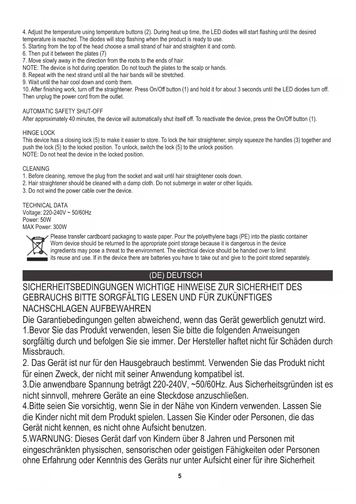 SCHARNIERSCHLOSS 2. Der Haarglätter sollte mit einem feuchten Tuch gereinigt werden. Nicht in Wasser oder andere Flüssigkeiten eintauchen. Leistung: 50W Nach ca. 40 Minuten schaltet sich das Gerät automatisch ab. Um das Gerät wieder zu aktivieren, drücken Sie die Ein-/Aus-Taste (1). Spannung: 220-240V ~ 50/60Hz MAX Leistung: 300W Dieses Gerät verfügt über ein Schließschloss (5), um die Aufbewahrung zu erleichtern. Um den Haarglätter zu verriegeln, drücken Sie einfach die Griffe (3) zusammen und schieben Sie die Verriegelung (5) in die verriegelte Position. Zum Entriegeln schalten Sie das Schloss (5) in die Entriegelungsposition. REINIGUNG TECHNISCHE DATEN