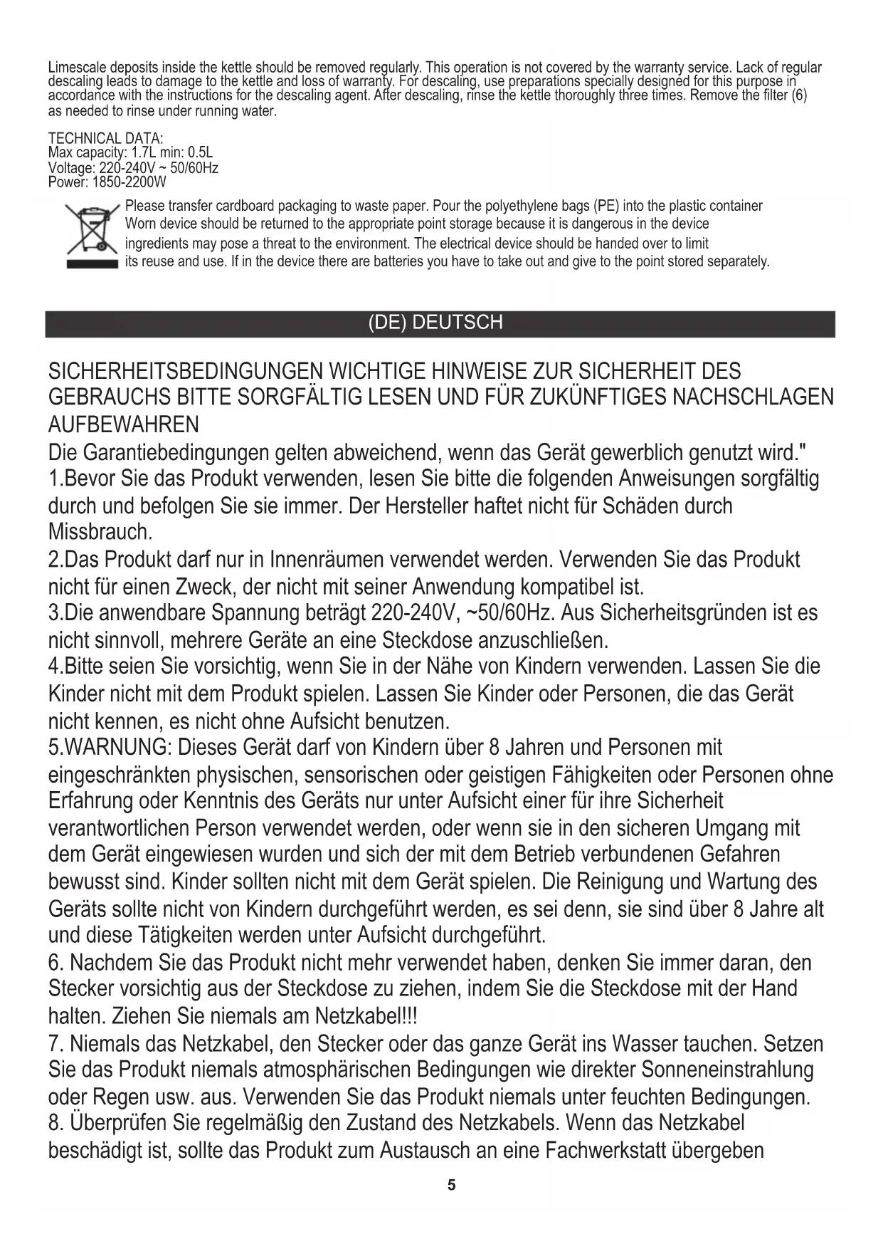 Wasserkocher das Wasser zyklisch auf und zeigt ständig die gewählte Temperatur an, die beibehalten werden soll. Wenn die Wassertemperatur um 5 in Bezug auf die ausgewählte Temperaturstufe von 40 ℃ (oder 50 ℃ / 60 ℃ / 70 ℃ / 80 ℃ / 90 ℃) sinkt, schaltet sich das Gerät automatisch ein und heizt es auf. Hinweis: Nur während dieses Vorgangs ist die Warmhaltefunktion aktiv. Nachdem Sie den Wasserkocher vom Sockel genommen haben, werden die Einstellungen der Warmhaltefunktion zurückgesetzt. SCHUTZVORRICHTUNGEN Max. Kapazität: 1.7L min: 0.5L Das Gerät ist mit einer automatischen Sicherung gegen Überhitzung ausgestattet, die Sicherung löst aus, wenn der Wasserkocher mit zu wenig Wasser verwendet wurde. Stellen Sie immer sicher, dass die Wassermenge im Gerät über dem Mindeststand liegt. Wenn die Sicherung einschaltet, schalten Sie den Wasserkocher durch Drücken des Netzschalters (7) aus, ziehen Sie dann den Stecker aus der Steckdose und lassen Sie den Wasserkocher 5-10 Minuten abkühlen. Füllen Sie dann den Wasserkocher mit Wasser und schalten Sie das Gerät ein, das normal funktioniert. TECHNISCHE DATEN: Leistung: 1850-2200W Spannung: 220-240V ~ 50/60Hz