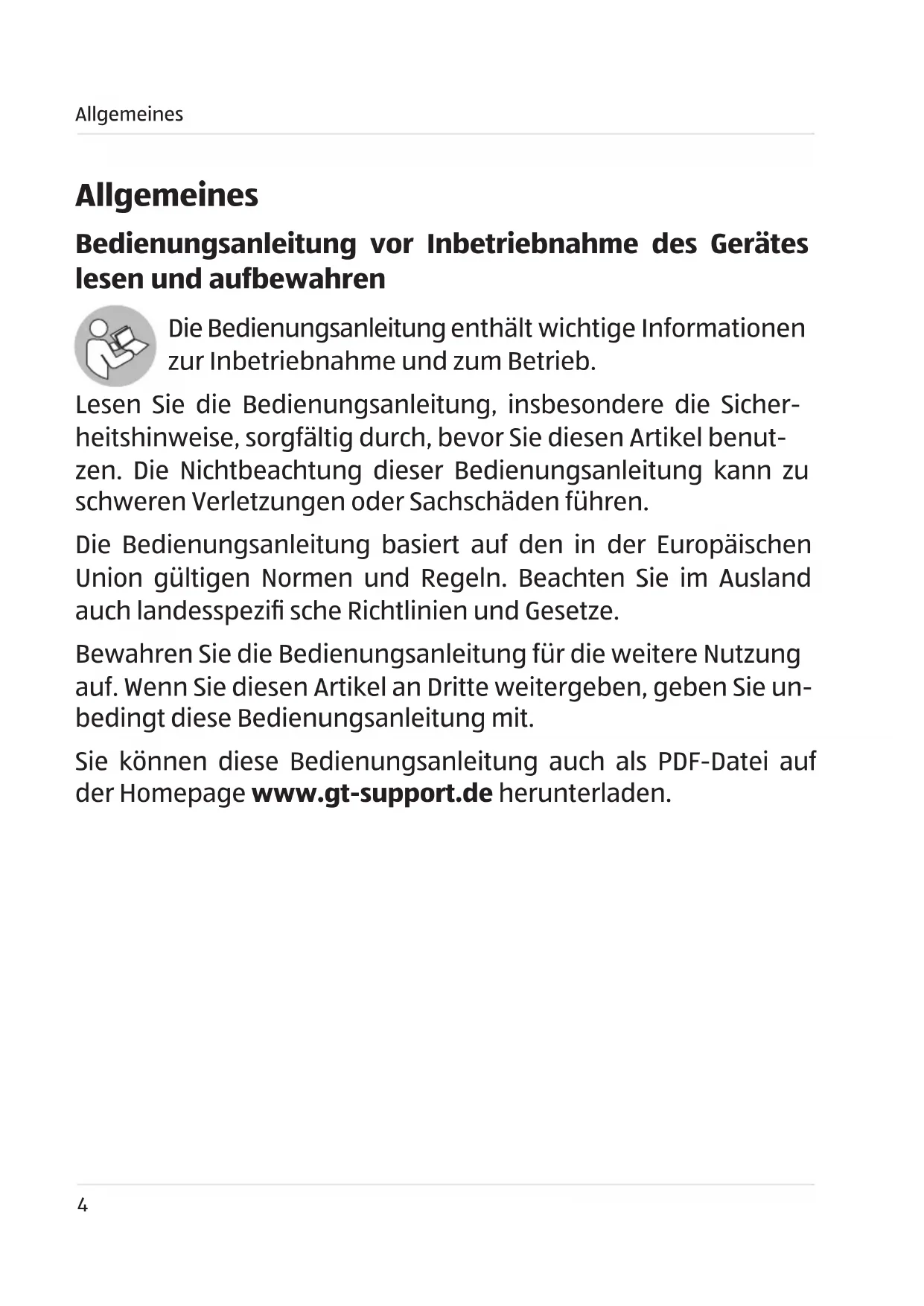 - Bedienungsanleitung vor Inbetriebnahme des Gerätes lesen und aufbewahren p. 4