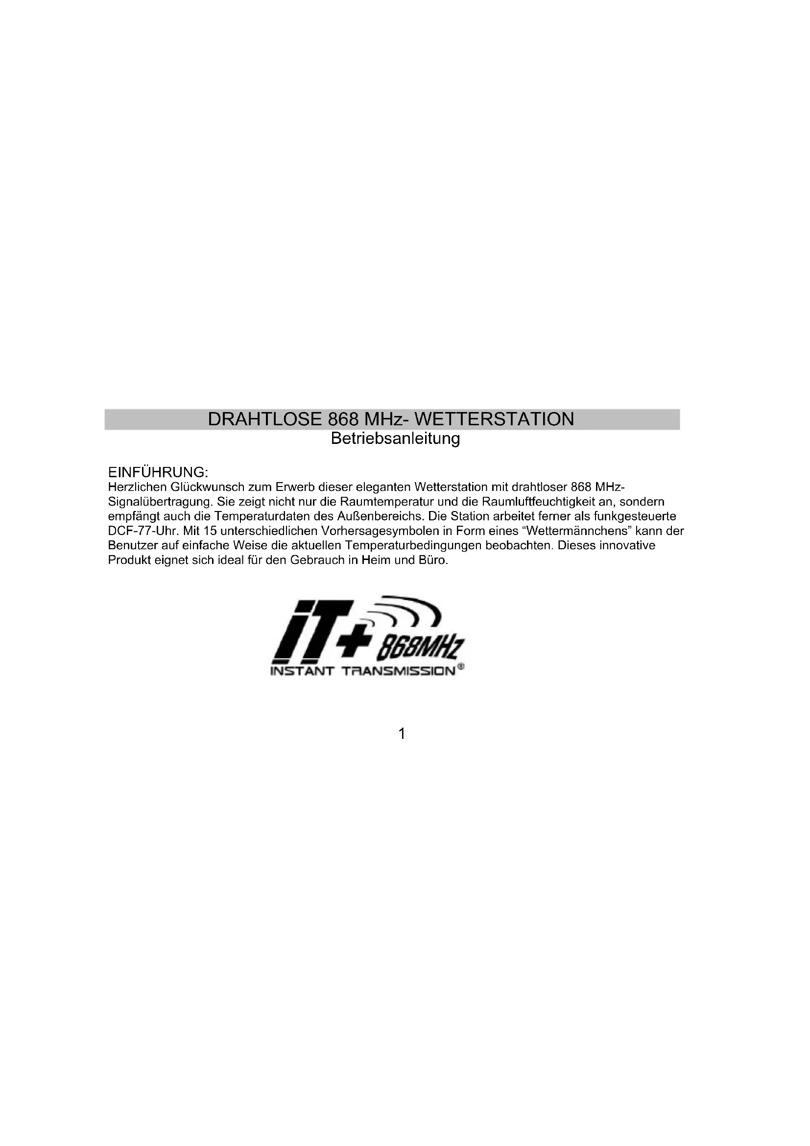 Betriebsanleitung EINFÜHRUNG: Herzlichen Glückwunsch zum Erwerb dieser eleganten Wetterstation mit drahtloser 868 MHz-Signalübertragung. Sie zeigt nicht nur die Raumtemperatur und die Raumluftfeuchtigkeit an, sondern empfängt auch die Temperaturdaten des Außenbereichs. Die Station arbeitet ferner als funkgesteuerte DCF-77-Uhr. Mit 15 unterschiedlichen Vorhersagesymbolen in Form eines “Wettermännchens” kann der Benutzer auf einfache Weise die aktuellen Temperaturbedingungen beobachten. Dieses innovative Produkt eignet sich ideal für den Gebrauch in Heim und Büro.2 MERKMALE: Die Wetterstation