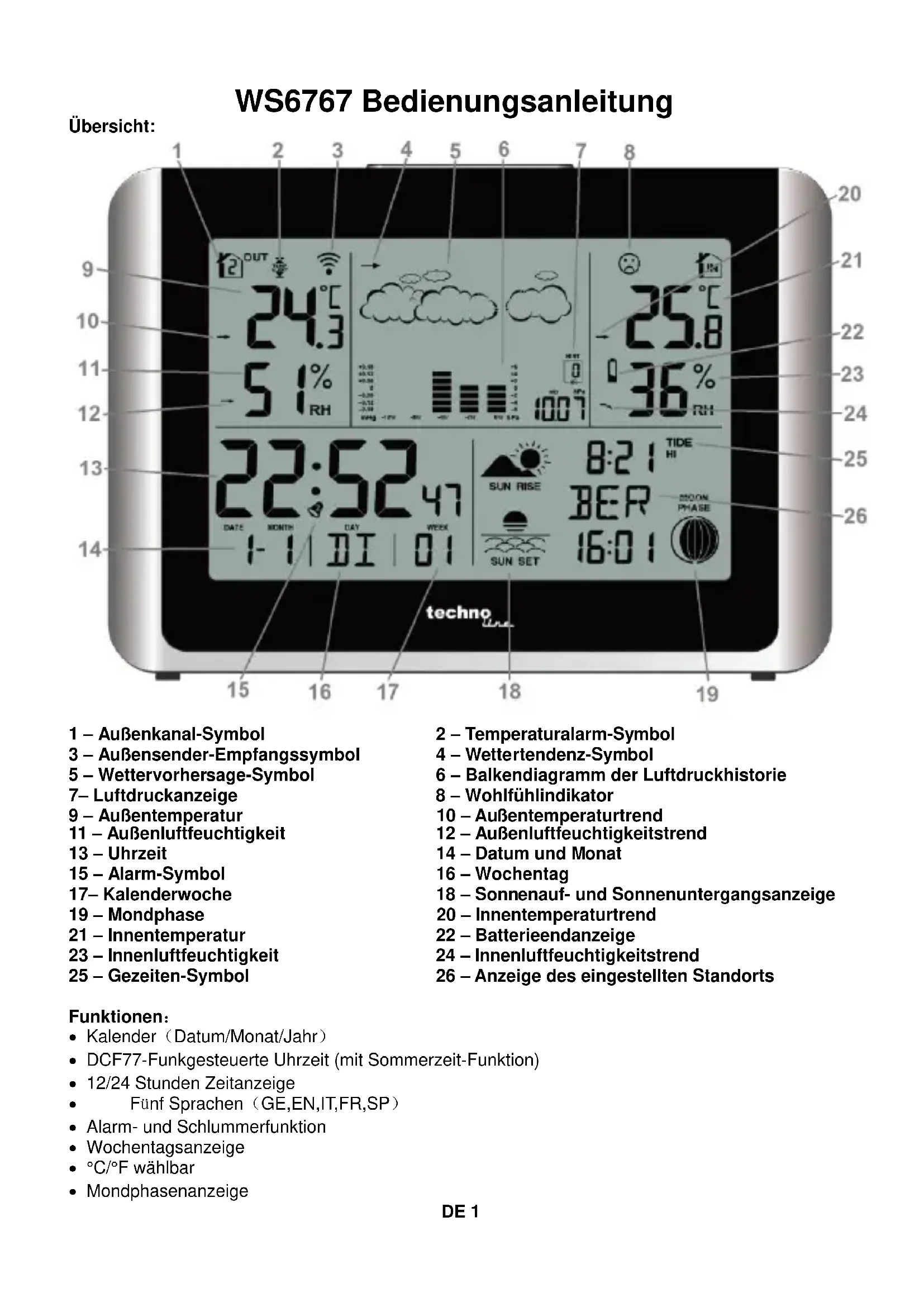1 – Außenkanal-Symbol 2 – Temperaturalarm-Symbol 3 – Außensender-Empfangssymbol 4 – Wettertendenz-Symbol 5 – Wettervorhersage-Symbol 6 – Balkendiagramm der Luftdruckhistorie 7– Luftdruckanzeige 8 – Wohlfühlindikator 9 – Außentemperatur 10 – Außentemperaturtrend 11 – Außenluftfeuchtigkeit 12 – Außenluftfeuchtigkeitstrend 13 – Uhrzeit 14 – Datum und Monat 15 – Alarm-Symbol 16 – Wochentag 17– Kalenderwoche 18 – Sonnenauf- und Sonnenuntergangsanzeige 19 – Mondphase 20 – Innentemperaturtrend 21 – Innentemperatur 22 – Batterieendanzeige 23 – Innenluftfeuchtigkeit 24 – Innenluftfeuchtigkeitstrend 25 – Gezeiten-Symbol 26 – Anzeige des eingestellten Standorts Funktionen: Kalender(Datum/Monat/Jahr) DCF77-Funkgesteuerte Uhrzeit (mit Sommerzeit-Funktion) 12/24 Stunden Zeitanzeige Fünf Sprachen(GE,EN,IT,FR,SP) Alarm- und Schlummerfunktion Wochentagsanzeige °C/°F wählbar MondphasenanzeigeDE 2 Temperatur und Luftfeuchtigkeit in Innen- und Außenbereichen Temperatur- und Luftfeuchtigkeitstrend in Innen- und Außenbereichen Sonnenaufgangs- / Sonnenuntergangsanzeige Batterieendanzeige für Station und Sender Wohlfühlindikator für Innenräume Zeitzoneneinstellung Kalenderwochen-Nummer Gezeitenanzeige: Springtide / Mittelerer Wasserstand / Niipptide Balkendiagramm für Luftdruck Wettervorhersage Aufzeichnung minimaler und maximaler Innen-/Außentemperatur / Luftfeuchtigkeit Auswahl des Außensenderkanals Standortwahl Temperaturalarm Frostalarm Batterien: Station (WS6767): 2XAA Sender(TX960-TH): 2XAAA Vollständige Anzeige: