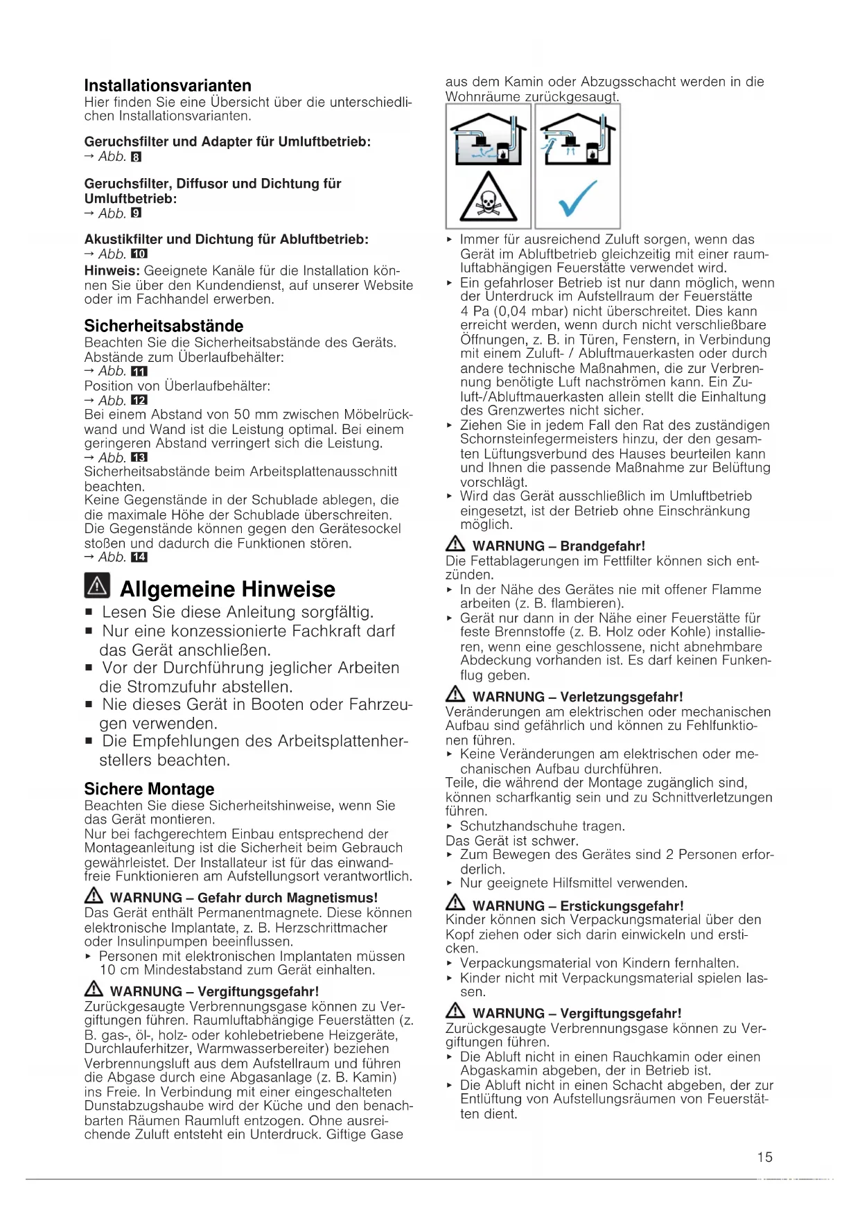 Allgemeine Hinweise ¡ Lesen Sie diese Anleitung sorgfältig. ¡ Nur eine konzessionierte Fachkraft darf das Gerät anschließen. ¡ Vor der Durchführung jeglicher Arbeiten die Stromzufuhr abstellen. ¡ Nie dieses Gerät in Booten oder Fahrzeu- gen verwenden. ¡ Die Empfehlungen des Arbeitsplattenher- stellers beachten. Sichere Montage Beachten Sie diese Sicherheitshinweise, wenn Sie das Gerät montieren. Nur bei fachgerechtem Einbau entsprechend der Montageanleitung ist die Sicherheit beim Gebrauch gewährleistet. Der Installateur ist für das einwand- freie Funktionieren am Aufstellungsort verantwortlich. WARNUNG‒Gefahr durch Magnetismus! Das Gerät enthält Permanentmagnete. Diese können elektronische Implantate, z.B. Herzschrittmacher oder Insulinpumpen beeinflussen. ▶ Personen mit elektronischen Implantaten müssen 10cm Mindestabstand zum Gerät einhalten. WARNUNG‒Vergiftungsgefahr! Zurückgesaugte Verbrennungsgase können zu Ver- giftungen führen. Raumluftabhängige Feuerstätten (z. B. gas-, öl-, holz- oder kohlebetriebene Heizgeräte, Durchlauferhitzer, Warmwasserbereiter) beziehen Verbrennungsluft aus dem Aufstellraum und führen die Abgase durch eine Abgasanlage (z. B. Kamin) ins Freie. In Verbindung mit einer eingeschalteten Dunstabzugshaube wird der Küche und den benach- barten Räumen Raumluft entzogen. Ohne ausrei- chende Zuluft entsteht ein Unterdruck. Giftige Gase aus dem Kamin oder Abzugsschacht werden in die Wohnräume zurückgesaugt. ▶ Immer für ausreichend Zuluft sorgen, wenn das Gerät im Abluftbetrieb gleichzeitig mit einer raum- luftabhängigen Feuerstätte verwendet wird. ▶ Ein gefahrloser Betrieb ist nur dann möglich, wenn der Unterdruck im Aufstellraum der Feuerstätte 4Pa(0,04mbar) nicht überschreitet. Dies kann erreicht werden, wenn durch nicht verschließbare Öffnungen, z. B. in Türen, Fenstern, in Verbindung mit einem Zuluft- / Abluftmauerkasten oder durch andere technische Maßnahmen, die zur Verbren- nung benötigte Luft nachströmen kann. Ein Zu- luft-/Abluftmauerkasten allein stellt die Einhaltung des Grenzwertes nicht sicher. ▶ Ziehen Sie in jedem Fall den Rat des zuständigen Schornsteinfegermeisters hinzu, der den gesam- ten Lüftungsverbund des Hauses beurteilen kann und Ihnen die passende Maßnahme zur Belüftung vorschlägt. ▶ Wird das Gerät ausschließlich im Umluftbetrieb eingesetzt, ist der Betrieb ohne Einschränkung möglich. WARNUNG‒Brandgefahr! Die Fettablagerungen im Fettfilter können sich ent- zünden. ▶ In der Nähe des Gerätes nie mit offener Flamme arbeiten (z.B. flambieren). ▶ Gerät nur dann in der Nähe einer Feuerstätte für feste Brennstoffe (z.B. Holz oder Kohle) installie- ren, wenn eine geschlossene, nicht abnehmbare Abdeckung vorhanden ist. Es darf keinen Funken- flug geben. WARNUNG‒Verletzungsgefahr! Veränderungen am elektrischen oder mechanischen Aufbau sind gefährlich und können zu Fehlfunktio- nen führen. ▶ Keine Veränderungen am elektrischen oder me- chanischen Aufbau durchführen. Teile, die während der Montage zugänglich sind, können scharfkantig sein und zu Schnittverletzungen führen. ▶ Schutzhandschuhe tragen. Das Gerät ist schwer. ▶ Zum Bewegen des Gerätes sind 2 Personen erfor- derlich. ▶ Nur geeignete Hilfsmittel verwenden. WARNUNG‒Erstickungsgefahr! Kinder können sich Verpackungsmaterial über den Kopf ziehen oder sich darin einwickeln und ersti- cken. ▶ Verpackungsmaterial von Kindern fernhalten. ▶ Kinder nicht mit Verpackungsmaterial spielen las- sen. WARNUNG‒Vergiftungsgefahr! Zurückgesaugte Verbrennungsgase können zu Ver- giftungen führen. ▶ Die Abluft nicht in einen Rauchkamin oder einen Abgaskamin abgeben, der in Betrieb ist. ▶ Die Abluft nicht in einen Schacht abgeben, der zur Entlüftung von Aufstellungsräumen von Feuerstät- ten dient.16 ▶ Soll die Abluft in einen Rauchkamin oder Abgas- kamin geführt werden, der nicht in Betrieb ist, muss die Zustimmung des zuständigen Schorn- steinfegermeisters eingeholt werden. Zurückgesaugte Verbrennungsgase können zu Ver- giftungen führen. ▶ Wenn eine Dunstabzugshaube mit einer raumluft- abhängigen Feuerstätte installiert wird, muss die Stromzuführung der Dunstabzugshaube mit einer geeigneten Sicherheitsschaltung versehen wer- den. Hinweise zum elektrischen Anschluss Um das Gerät sicher elektrisch anschließen zu kön- nen, beachten Sie diese Hinweise. WARNUNG‒Stromschlaggefahr! Die Trennung des Geräts vom Stromnetz muss je- derzeit möglich sein. Das Gerät darf nur an eine vor- schriftsmäßig installierte Anschlussdose angeschlos- sen werden. ▶ In der festverlegten elektrischen Installation muss eine allpolige Trennvorrichtung nach den Bedin- gungen der Überspannungskategorie III und nach den Errichtungsbestimmungen eingebaut werden. ▶ Nur eine Elektrofachkraft darf die festverlegte elek- trische Installation ausführen. Wir empfehlen einen Fehlerstromschutzschalter (FI-Schalter) im Strom- kreis der Geräteversorgung zu installieren. ¡ Das Anschlusskabel nicht knicken oder einklem- men und von scharfen Kanten fernhalten. ¡ Das Anschlusskabel so verlegen, dass es nicht das heiße Gerätegehäuse berührt. ¡ Nur das mit dem Gerät mitgelieferte oder vom technischen Kundendienst gelieferte Anschlusska- bel verwenden. ¡ Dieses Gerät entspricht den EG-Funkentstörbe- stimmungen. ¡ Das Gerät entspricht der Schutzklasse 1. Daher das Gerät nur mit Schutzleiter-Anschluss verwen- den. ¡ Der Hersteller übernimmt keine Verantwortung für Betriebsstörungen oder mögliche Schäden, die auf eine fehlerhafte elektrische Installation zurück- zuführen sind. Elektrischen Anschluss vorbereiten Voraussetzung:Nur der dafür ausgebildete Kunden- dienst darf Arbeiten am Geräteinneren durchführen oder das Netzkabel tauschen.
