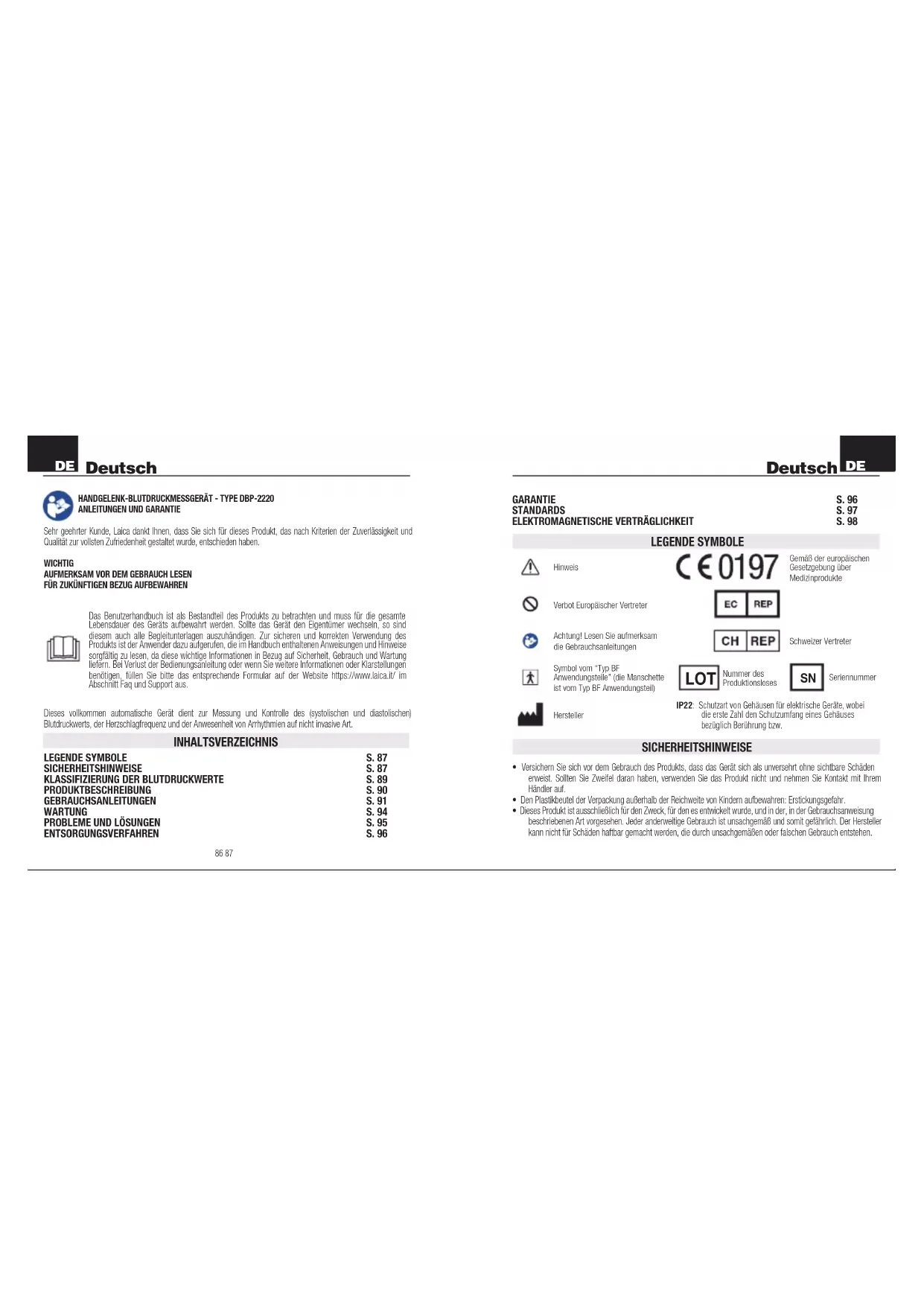 Deutsch HANDGELENK-BLUTDRUCKMESSGERÄT - TYPE DBP-2220 ANLEITUNGEN UND GARANTIESehr geehrter Kunde, Laica dankt Ihnen, dass Sie sich für dieses Produkt, das nach Kriterien der Zuverlässigkeit und Qualität zur vollsten Zufriedenheit gestaltet wurde, entschieden haben. WICHTIGAUFMERKSAM VOR DEM GEBRAUCH LESENFÜR ZUKÜNFTIGEN BEZUG AUFBEWAHRENDas Benutzerhandbuch ist als Bestandteil des Produkts zu betrachten und muss für die gesamte Lebensdauer des Geräts aufbewahrt werden. Sollte das Gerät den Eigentümer wechseln, so sind diesem auch alle Begleitunterlagen auszuhändigen. Zur sicheren und korrekten Verwendung des Produkts ist der Anwender dazu aufgerufen, die im Handbuch enthaltenen Anweisungen und Hinweise sorgfältig zu lesen, da diese wichtige Informationen in Bezug auf Sicherheit, Gebrauch und Wartung liefern. Bei Verlust der Bedienungsanleitung oder wenn Sie weitere Informationen oder Klarstellungen benötigen, füllen Sie bitte das entsprechende Formular auf der Website https://www.laica.it/ im Abschnitt Faq und Support aus.Dieses vollkommen automatische Gerät dient zur Messung und Kontrolle des (systolischen und diastolischen) Blutdruckwerts, der Herzschlagfrequenz und der Anwesenheit von Arrhythmien auf nicht invasive Art. INHALTSVERZEICHNIS LEGENDE SYMBOLESICHERHEITSHINWEISEKLASSIFIZIERUNG DER BLUTDRUCKWERTEPRODUKTBESCHREIBUNGGEBRAUCHSANLEITUNGENWARTUNGPROBLEME UND LÖSUNGENENTSORGUNGSVERFAHRENS. 87S. 87S. 89S. 90S. 91S. 94S. 95S. 96 Deutsch DE88 89