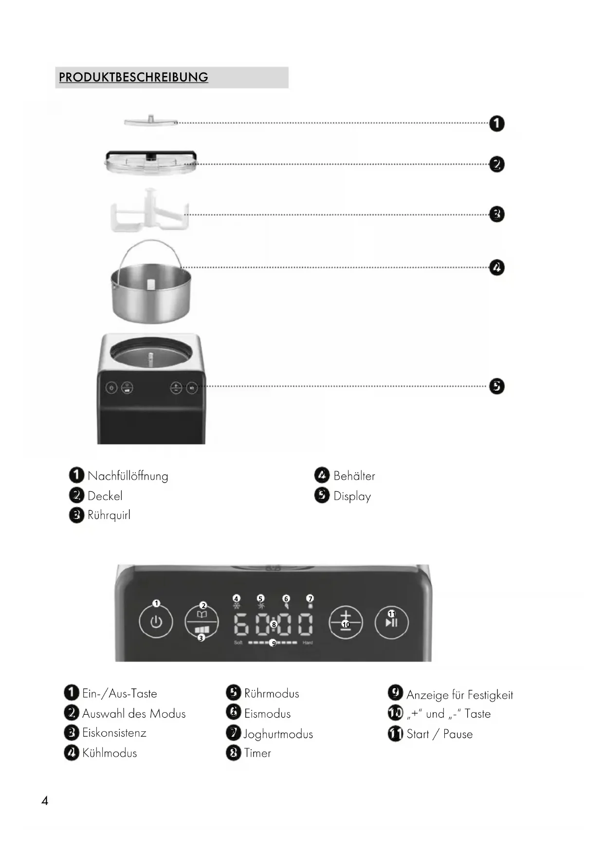 Wird das Eis nach der Produktion nicht entnommen, hält das Gerät dieses noch 120 Minuten kühl. Anschließend schaltet sich das Gerät nach 10 Minuten Nichtbenutzung aus. „- -“ erscheint auf dem Display. Möchten Sie das Eis noch weiter kühlen, schalten Sie das Gerät wieder ein und gehen in den Kühlmodus (siehe Kühlmodus).14 JOGHURTMODUS WICHTIG! Anders als bei der Zubereitung von Eis wird hier die eingefüllte Masse (max. 2L) auf einer für die Joghurtzubereitung optimalen Temperatur erwärmt und dann konstant gehalten. ● Schalten Sie das Gerät ein . ● Rührquirl nur einsetzen, wenn man nach der Zubereitung weitere Zutaten in den Joghurt ein- rühren möchte. Ansonsten kann man den Quirl bei der Zubereitung von Joghurt weg lassen. ● Wählen Sie den Joghurtmodus durch Drücken der Taste. ● Die Werkseinstellung beträgt 8 Stunden. ● Über die “+” und “-” Tasten können Sie die Zeit in Stunden-Schritten einstellen. Das Maxi- mum beträgt 24 Stunden. ● Betätigen Sie die Taste. ● Der Rührquirl dreht sich nicht, da sonst die Joghurtherstellung gehindert würde. ● Schalten Sie das Gerät nach Ablauf der Zeit aus oder wechseln Sie, wenn der Quirl vorher eingesetzt wurde, in den Rührmodus um weitere Zutaten zu dem Joghurt hinzuzufügen. WICHTIG! Beachten Sie, dass der Behälter beim Zugeben von Zutaten nur zu maximal 2/3 befüllt wer- den darf, da die Masse sonst überlaufen kann. RÜHRMODUS ● Schalten Sie das Gerät ein . ● Wählen Sie den Rührmodus durch Drücken der Taste. ● Die Werkseinstellung sind 30 Minuten. ● Über die “+” und “-” Tasten können Sie die Zeit einstellen. Maximal 60 Minuten. ● Geben Sie die Zutaten in den Behälter. ● Drücken Sie die Taste. ● In diesem Modus kühlt das Gerät nicht. ● Nach Ablauf der Zeit schaltet sich das Gerät nach 10 Minuten Nichtbenutzung aus. „- -“ erscheint auf dem Display. ● Entnehmen Sie den Behälter und füllen Sie den Inhalt um. MOTORSCHUTZ Wenn das Eis härter wird, hört das Gerät auf zu rühren, um den Motor zu schützen. REINIGUNG Vorsicht! Vor der Reinigung muss der Stecker gezogen werden, um einen Stromschlag zu ver- meiden. ● Nehmen Sie den Rührquirl und den Behälter heraus und reinigen Sie diese mit ein wenig15