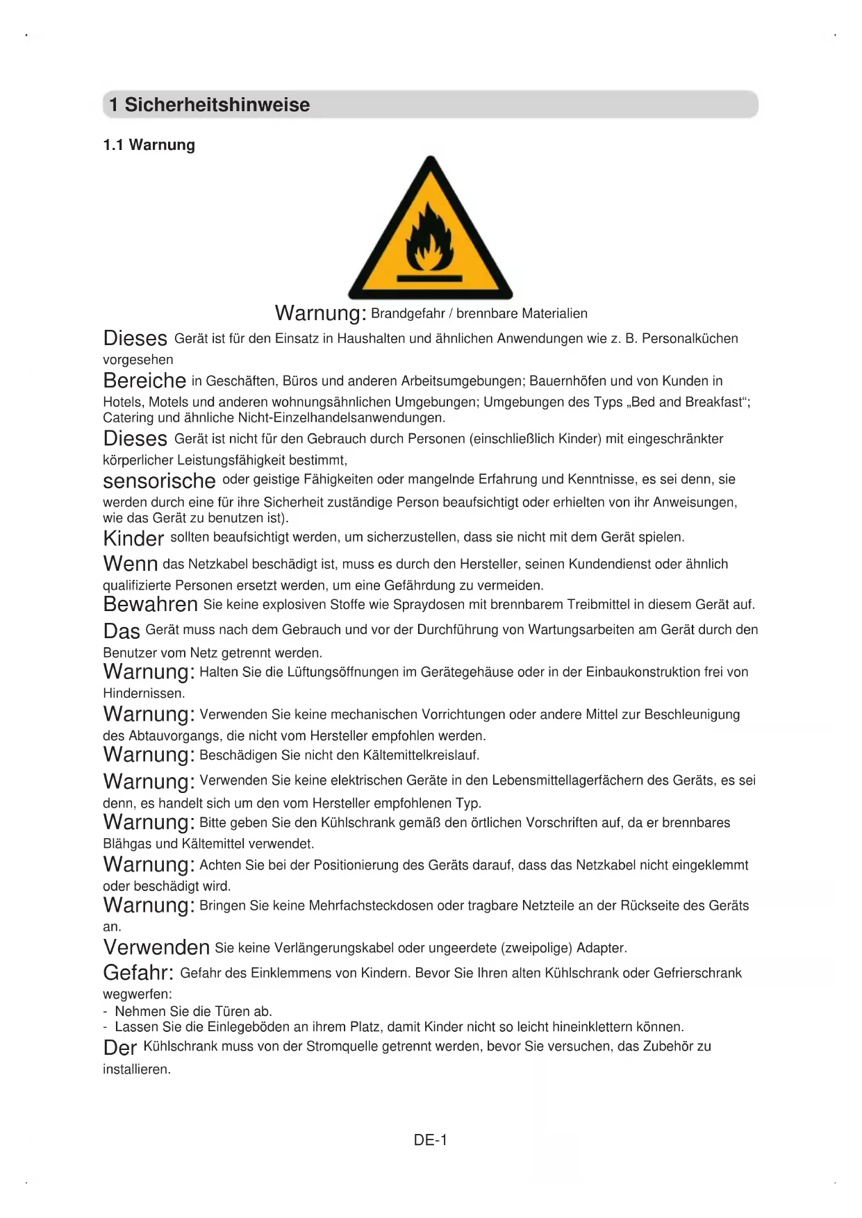 Warning: Bitinge geben Sie den Kuhlschrank gemäß den örtlichen Vorschriften auf, da er brennbares Blähgas und Kätemittel verwendet.