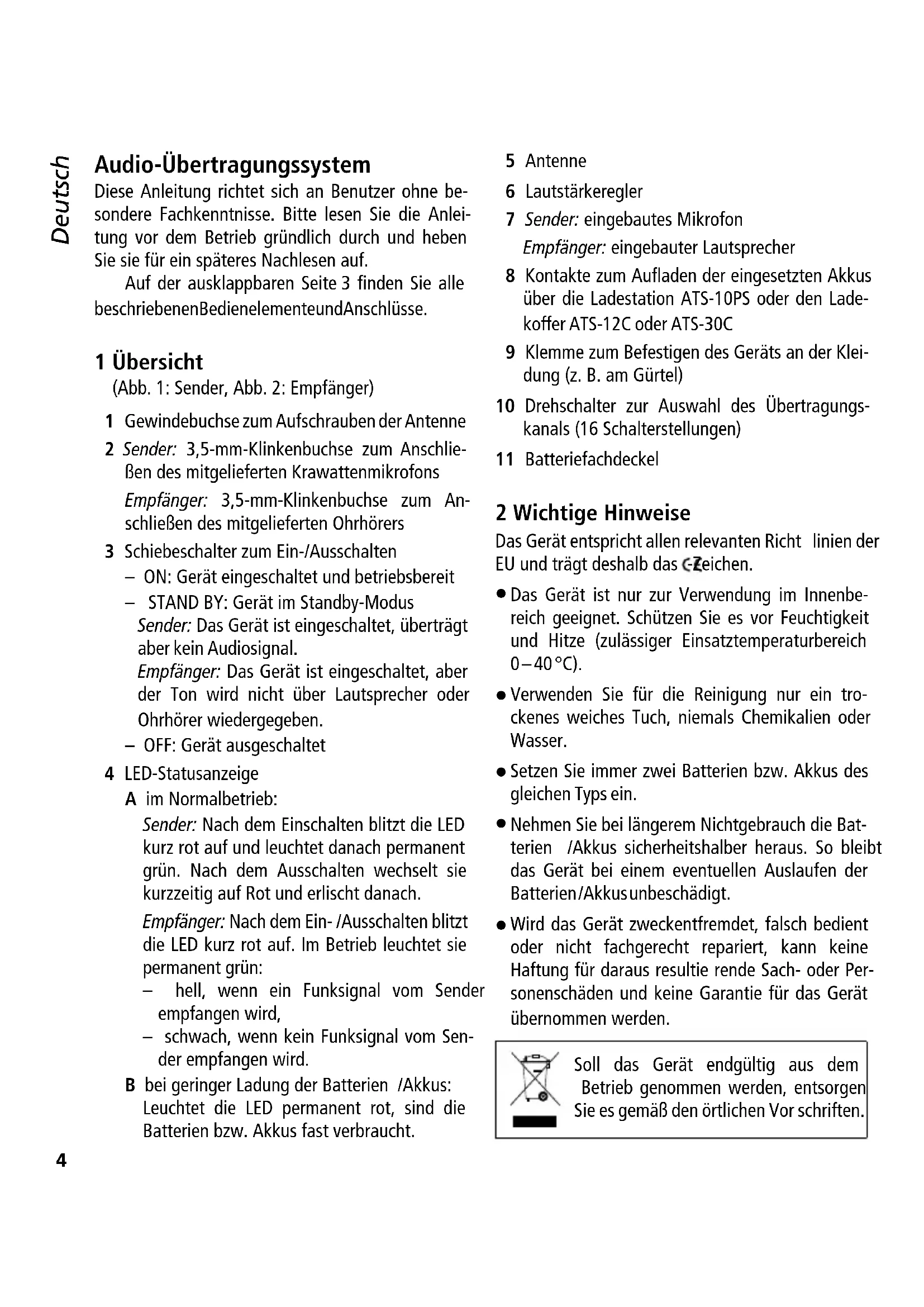 Deutsch English English Page Contents Français Français Page Table des matières Italiano Italiano Pagina Indice Español Español Página Contenidos Nederlands Nederlands Pagina Inhoud Polski Polski Strona Spis treści Magyar Magyar Page Audio-Übertragungssystem Diese Anleitung richtet sich an Benutzer ohne be- sondere Fachkenntnisse. Bitte lesen Sie die Anlei- tung vor dem Betrieb gründlich durch und heben Sie sie für ein späteres Nachlesen auf. Auf der ausklappbaren Seite3 finden Sie alle be schriebenen Bedienelemente und An schlüsse. 1 Übersicht (Abb. 1: Sender, Abb. 2: Empfänger) 1 Gewindebuchse zum Aufschrauben der Antenne 2 Sender: 3,5-mm-Klinkenbuchse zum Anschlie- ßen des mitgelieferten Krawattenmikrofons Empfänger: 3,5-mm-Klinkenbuchse zum An- schließen des mitgelieferten Ohrhörers 3 Schiebeschalter zum Ein-/Ausschalten – ON: Gerät eingeschaltet und betriebsbereit – STAND BY: Gerät im Standby-Modus Sender: Das Gerät ist eingeschaltet, überträgt aber kein Audiosignal. Empfänger: Das Gerät ist eingeschaltet, aber der Ton wird nicht über Lautsprecher oder Ohrhörer wiedergegeben. – OFF: Gerät ausgeschaltet 4 LED-Statusanzeige A im Normalbetrieb: Sender: Nach dem Einschalten blitzt die LED kurz rot auf und leuchtet danach permanent grün. Nach dem Ausschalten wechselt sie kurzzeitig auf Rot und erlischt danach. Empfänger: Nach dem Ein- /Ausschalten blitzt die LED kurz rot auf. Im Betrieb leuchtet sie permanent grün: – hell, wenn ein Funksignal vom Sender empfangen wird, – schwach, wenn kein Funksignal vom Sen- der empfangen wird. B bei geringer Ladung der Batterien /Akkus: Leuchtet die LED permanent rot, sind die Batterien bzw. Akkus fast verbraucht. 5 Antenne 6 Lautstärkeregler 7 Sender: eingebautes Mikrofon Empfänger: eingebauter Lautsprecher 8 Kontakte zum Aufladen der eingesetzten Akkus über die Ladestation ATS-10PS oder den Lade- koffer ATS-12C oder ATS-30C 9 Klemme zum Befestigen des Geräts an der Klei- dung (z. B. am Gürtel) 10 Drehschalter zur Auswahl des Übertragungs- kanals (16 Schalterstellungen) 11 Batteriefachdeckel 2 Wichtige Hinweise Das Gerät entspricht allen relevanten Richt linien der EU und trägt deshalb das -Zeichen.