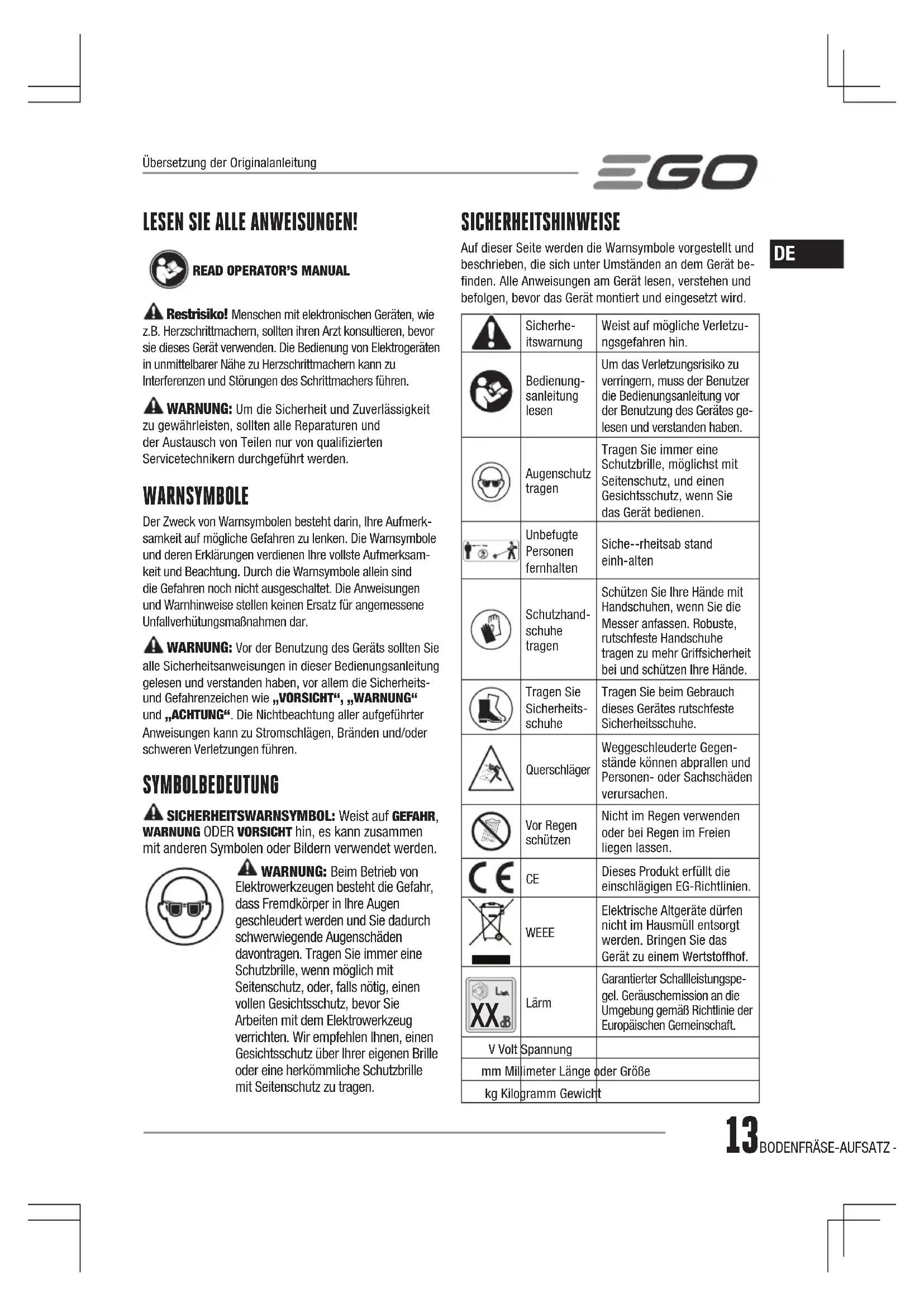 Restrisiko! Menschen mit elektronischen Geräten, wie z.B. Herzschrittmachern, sollten ihren Arzt konsultieren, bevor sie dieses Gerät verwenden. Die Bedienung von Elektrogeräten in unmittelbarer Nähe zu Herzschrittmachern kann zu Interferenzen und Störungen des Schrittmachers führen. WARNUNG: Um die Sicherheit und Zuverlässigkeit zu gewährleisten, sollten alle Reparaturen und der Austausch von Teilen nur von qualifizierten Servicetechnikern durchgeführt werden. WARNSYMBOLE Der Zweck von Warnsymbolen besteht darin, Ihre Aufmerk-samkeit auf mögliche Gefahren zu lenken. Die Warnsymbole und deren Erklärungen verdienen Ihre vollste Aufmerksam-keit und Beachtung. Durch die Warnsymbole allein sind die Gefahren noch nicht ausgeschaltet. Die Anweisungen und Warnhinweise stellen keinen Ersatz für angemessene Unfallverhütungsmaßnahmen dar. WARNUNG: Vor der Benutzung des Geräts sollten Sie alle Sicherheitsanweisungen in dieser Bedienungsanleitung gelesen und verstanden haben, vor allem die Sicherheits- und Gefahrenzeichen wie „VORSICHT“, „WARNUNG“ und „ACHTUNG“. Die Nichtbeachtung aller aufgeführter Anweisungen kann zu Stromschlägen, Bränden und/oder schweren Verletzungen führen. SYMBOLBEDEUTUNG SICHERHEITSWARNSYMBOL: Weist auf GEFAHR, WARNUNG ODER VORSICHT hin, es kann zusammen mit anderen Symbolen oder Bildern verwendet werden. WARNUNG: Beim Betrieb von Elektrowerkzeugen besteht die Gefahr, dass Fremdkörper in Ihre Augen geschleudert werden und Sie dadurch schwerwiegende Augenschäden davontragen. Tragen Sie immer eine Schutzbrille, wenn möglich mit Seitenschutz, oder, falls nötig, einen vollen Gesichtsschutz, bevor Sie Arbeiten mit dem Elektrowerkzeug verrichten. Wir empfehlen Ihnen, einen Gesichtsschutz über Ihrer eigenen Brille oder eine herkömmliche Schutzbrille mit Seitenschutz zu tragen. SICHERHEITSHINWEISE Auf dieser Seite werden die Warnsymbole vorgestellt und beschrieben, die sich unter Umständen an dem Gerät be-finden. Alle Anweisungen am Gerät lesen, verstehen und befolgen, bevor das Gerät montiert und eingesetzt wird.Sicherhe-itswarnungWeist auf mögliche Verletzu-ngsgefahren hin.Bedienung-sanleitung lesenUm das Verletzungsrisiko zu verringern, muss der Benutzer die Bedienungsanleitung vor der Benutzung des Gerätes ge-lesen und verstanden haben.Augenschutz tragenTragen Sie immer eine Schutzbrille, möglichst mit Seitenschutz, und einen Gesichtsschutz, wenn Sie das Gerät bedienen.Unbefugte Personen fernhaltenSiche--rheitsab stand einh-altenSchutzhand-schuhe tragenSchützen Sie Ihre Hände mit Handschuhen, wenn Sie die Messer anfassen. Robuste, rutschfeste Handschuhe tragen zu mehr Griffsicherheit bei und schützen Ihre Hände.Tragen Sie Sicherheits-schuheTragen Sie beim Gebrauch dieses Gerätes rutschfeste Sicherheitsschuhe.QuerschlägerWeggeschleuderte Gegen-stände können abprallen und Personen- oder Sachschäden verursachen.Vor Regen schützenNicht im Regen verwenden oder bei Regen im Freien liegen lassen. Dieses Produkt erfüllt die einschlägigen EG-Richtlinien. WEEE Elektrische Altgeräte dürfen nicht im Hausmüll entsorgt werden. Bringen Sie das Gerät zu einem Wertstoffhof.