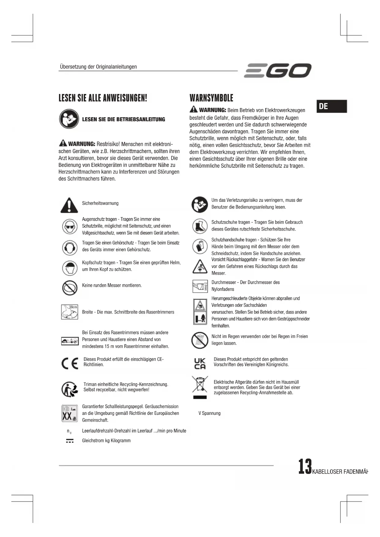 WARNUNG: Restrisiko! Menschen mit elektroni- schen Geräten, wie z.B. Herzschrittmachern, sollten ihren Arzt konsultieren, bevor sie dieses Gerät verwenden. Die Bedienung von Elektrogeräten in unmittelbarer Nähe zu Herzschrittmachern kann zu Interferenzen und Störungen des Schrittmachers führen. SicherheitswarnungUm das Verletzungsrisiko zu verringern, muss der Benutzer die Bedienungsanleitung lesen.Augenschutz tragen - Tragen Sie immer eine Schutzbrille, möglichst mit Seitenschutz, und einen Vollgesichtsschutz, wenn Sie mit diesem Gerät arbeiten.Schutzschuhe tragen - Tragen Sie beim Gebrauch dieses Gerätes rutschfeste Sicherheitsschuhe.Tragen Sie einen Gehörschutz - Tragen Sie beim Einsatz des Geräts immer einen Gehörschutz.Schutzhandschuhe tragen - Schützen Sie Ihre Hände beim Umgang mit dem Messer oder dem Schneidschutz, indem Sie Handschuhe anziehen.Kopfschutz tragen - Tragen Sie einen geprüften Helm, um Ihren Kopf zu schützen.Vorsicht Rückschlaggefahr - Warnen Sie den Benutzer vor den Gefahren eines Rückschlags durch das Messer.Keine runden Messer montieren. 2.0mmDurchmesser - Der Durchmesser des Nylonfadens 38cm Breite - Die max. Schnittbreite des RasentrimmersHerumgeschleuderte Objekte können abprallen und Verletzungen oder Sachschäden verursachen. Stellen Sie bei Betrieb sicher, dass andere Personen und Haustiere sich von dem Gestrüppschneider fernhalten. 15m Bei Einsatz des Rasentrimmers müssen andere Personen und Haustiere einen Abstand von mindestens 15 m vom Rasentrimmer einhalten.Nicht im Regen verwenden oder bei Regen im Freien liegen lassen.Dieses Produkt erfüllt die einschlägigen CE-Richtlinien.Dieses Produkt entspricht den geltenden Vorschriften des Vereinigten Königreichs.Triman einheitliche Recycling-Kennzeichnung. Selbst recycelbar, nicht wegwerfen!Elektrische Altgeräte dürfen nicht im Hausmüll entsorgt werden. Geben Sie das Gerät bei einer zugelassenen Recycling-Annahmestelle ab.