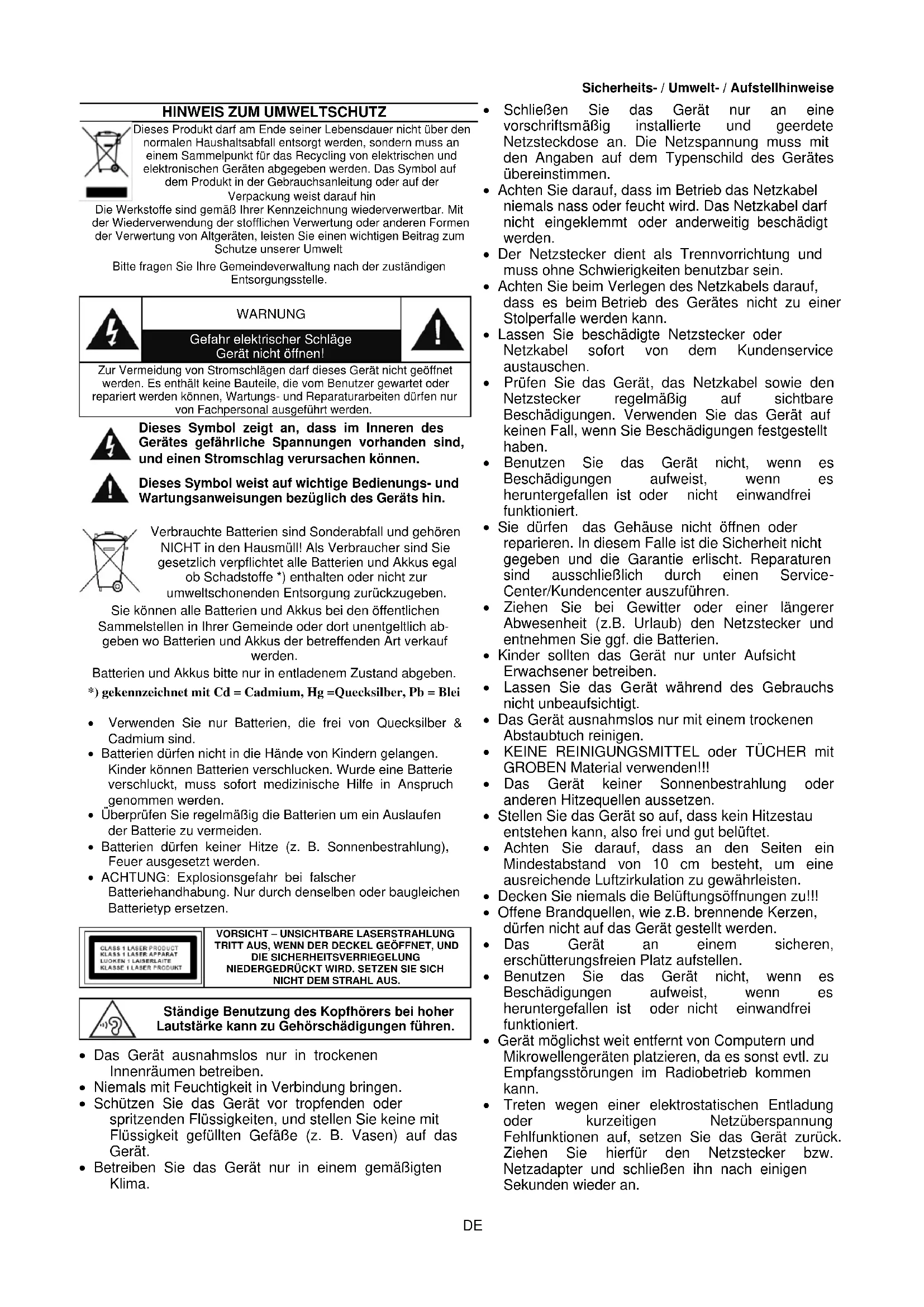 Das Gerät ausnahmslos nur in trockenen Innenräumen betreiben. Niemals mit Feuchtigkeit in Verbindung bringen. Schützen Sie das Gerät vor tropfenden oder spritzenden Flüssigkeiten, und stellen Sie keine mit Flüssigkeit gefüllten Gefäße (z. B. Vasen) auf das Gerät. Betreiben Sie das Gerät nur in einem gemäßigten Klima. Schließen Sie das Gerät nur an eine vorschriftsmäßig installierte und geerdete Netzsteckdose an. Die Netzspannung muss mit den Angaben auf dem Typenschild des Gerätes übereinstimmen. Achten Sie darauf, dass im Betrieb das Netzkabel niemals nass oder feucht wird. Das Netzkabel darf nicht eingeklemmt oder anderweitig beschädigt werden. Der Netzstecker dient als Trennvorrichtung und muss ohne Schwierigkeiten benutzbar sein. Achten Sie beim Verlegen des Netzkabels darauf, dass es beim Betrieb des Gerätes nicht zu einer Stolperfalle werden kann. Lassen Sie beschädigte Netzstecker oder Netzkabel sofort von dem Kundenservice austauschen. Prüfen Sie das Gerät, das Netzkabel sowie den Netzstecker regelmäßig auf sichtbare Beschädigungen. Verwenden Sie das Gerät auf keinen Fall, wenn Sie Beschädigungen festgestellt haben. Benutzen Sie das Gerät nicht, wenn es Beschädigungen aufweist, wenn es heruntergefallen ist oder nicht einwandfrei funktioniert. Sie dürfen das Gehäuse nicht öffnen oder reparieren. In diesem Falle ist die Sicherheit nicht gegeben und die Garantie erlischt. Reparaturen sind ausschließlich durch einen Service- Center/Kundencenter auszuführen. Ziehen Sie bei Gewitter oder einer längerer Abwesenheit (z.B. Urlaub) den Netzstecker und entnehmen Sie ggf. die Batterien. Kinder sollten das Gerät nur unter Aufsicht Erwachsener betreiben. Lassen Sie das Gerät während des Gebrauchs nicht unbeaufsichtigt. Das Gerät ausnahmslos nur mit einem trockenen Abstaubtuch reinigen. KEINE REINIGUNGSMITTEL oder TÜCHER mit GROBEN Material verwenden!!! Das Gerät keiner Sonnenbestrahlung oder anderen Hitzequellen aussetzen. Stellen Sie das Gerät so auf, dass kein Hitzestau entstehen kann, also frei und gut belüftet. Achten Sie darauf, dass an den Seiten ein Mindestabstand von 10 cm besteht, um eine ausreichende Luftzirkulation zu gewährleisten. Decken Sie niemals die Belüftungsöffnungen zu!!! Offene Brandquellen, wie z.B. brennende Kerzen, dürfen nicht auf das Gerät gestellt werden. Das Gerät an einem sicheren, erschütterungsfreien Platz aufstellen. Benutzen Sie das Gerät nicht, wenn es Beschädigungen aufweist, wenn es heruntergefallen ist oder nicht einwandfrei funktioniert. Gerät möglichst weit entfernt von Computern und Mikrowellengeräten platzieren, da es sonst evtl. zu Empfangsstörungen im Radiobetrieb kommen kann. Treten wegen einer elektrostatischen Entladung oder kurzeitigen Netzüberspannung Fehlfunktionen auf, setzen Sie das Gerät zurück. Ziehen Sie hierfür den Netzstecker bzw. Netzadapter und schließen ihn nach einigen Sekunden wieder an.CD9250 / Deutsche Bedienungsanleitung