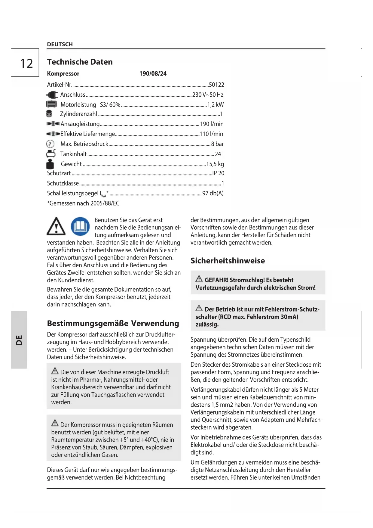 digte Netzanschlussleitung durch den Hersteller ersetzt werden. Führen Sie unter keinen Umständen Technische Daten Kompressor 190/08/2413 lichst Unfallschutzkleidungtragen. Zwischen dem Kompressor und dem Arbeitsbereich immer einenSicherheitsabstand von mindestens 4 Metern einhalten. Achtung! Peitschender Druckluftschlauch beimÖ