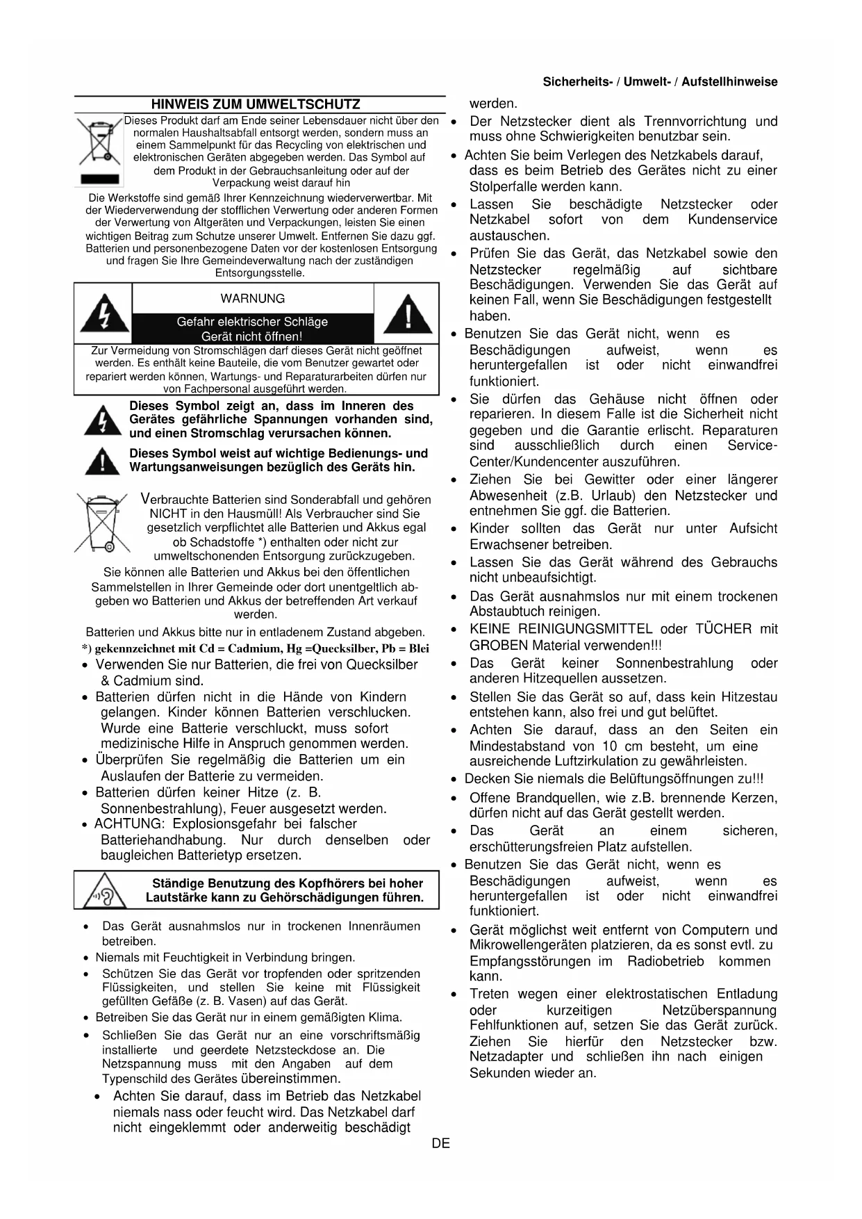 Ständige Benutzung des Kopfhörers bei hoher Lautstärke kann zu Gehörschädigungen führen.
