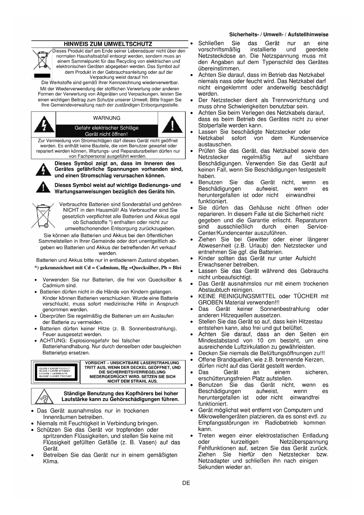 WICHTIGER HINWEIS Automatische Standby-Schaltung Um die ErP2 Richtlinie (Ökodesignrichtlinie) zu erfüllen und Energie zu sparen, schaltet das Gerät nach ca. 15 Minuten Innaktivität (z.B. im CD-Stop Modus) automatisch in den Standby-Modus, ohne vorherige Ankündigung. Um das Gerät wieder einzuschalten, schalten Sie es wie in der Bedienungsanleitung beschrieben wieder ein.