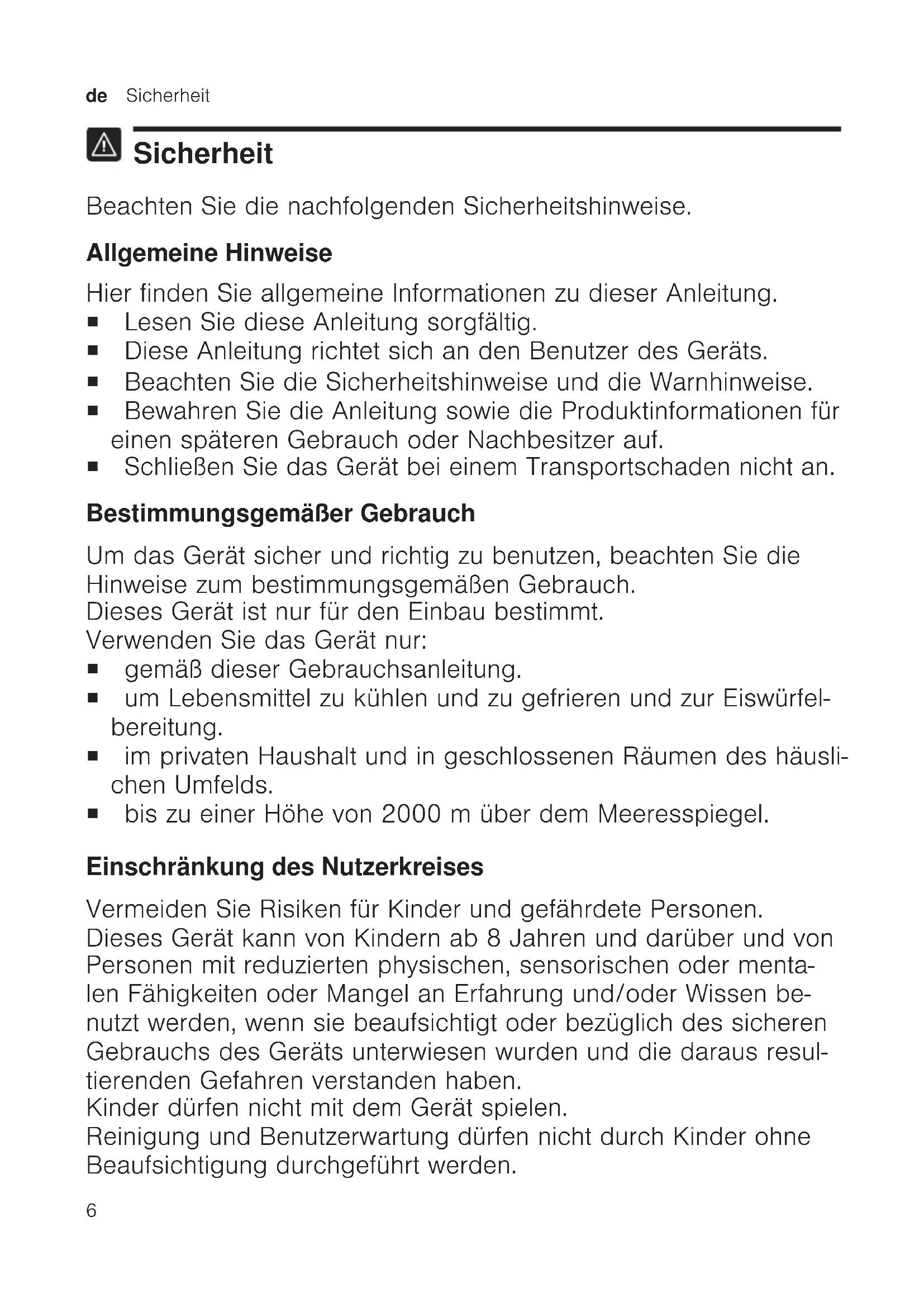Sicherheit Beachten Sie die nachfolgenden Sicherheitshinweise. Allgemeine Hinweise Hier finden Sie allgemeine Informationen zu dieser Anleitung. ¡ Lesen Sie diese Anleitung sorgfältig. ¡ Diese Anleitung richtet sich an den Benutzer des Geräts. ¡ Beachten Sie die Sicherheitshinweise und die Warnhinweise. ¡ Bewahren Sie die Anleitung sowie die Produktinformationen für einen späteren Gebrauch oder Nachbesitzer auf. ¡ Schließen Sie das Gerät bei einem Transportschaden nicht an. Bestimmungsgemäßer Gebrauch Um das Gerät sicher und richtig zu benutzen, beachten Sie die Hinweise zum bestimmungsgemäßen Gebrauch. Dieses Gerät ist nur für den Einbau bestimmt. Verwenden Sie das Gerät nur: ¡ gemäß dieser Gebrauchsanleitung. ¡ um Lebensmittel zu kühlen und zu gefrieren und zur Eiswürfel- bereitung. ¡ im privaten Haushalt und in geschlossenen Räumen des häusli- chen Umfelds. ¡ bis zu einer Höhe von 2000m über dem Meeresspiegel. Einschränkung des Nutzerkreises Vermeiden Sie Risiken für Kinder und gefährdete Personen. Dieses Gerät kann von Kindern ab 8 Jahren und darüber und von Personen mit reduzierten physischen, sensorischen oder menta- len Fähigkeiten oder Mangel an Erfahrung und/oder Wissen be- nutzt werden, wenn sie beaufsichtigt oder bezüglich des sicheren Gebrauchs des Geräts unterwiesen wurden und die daraus resul- tierenden Gefahren verstanden haben. Kinder dürfen nicht mit dem Gerät spielen. Reinigung und Benutzerwartung dürfen nicht durch Kinder ohne Beaufsichtigung durchgeführt werden.Sicherheit de
