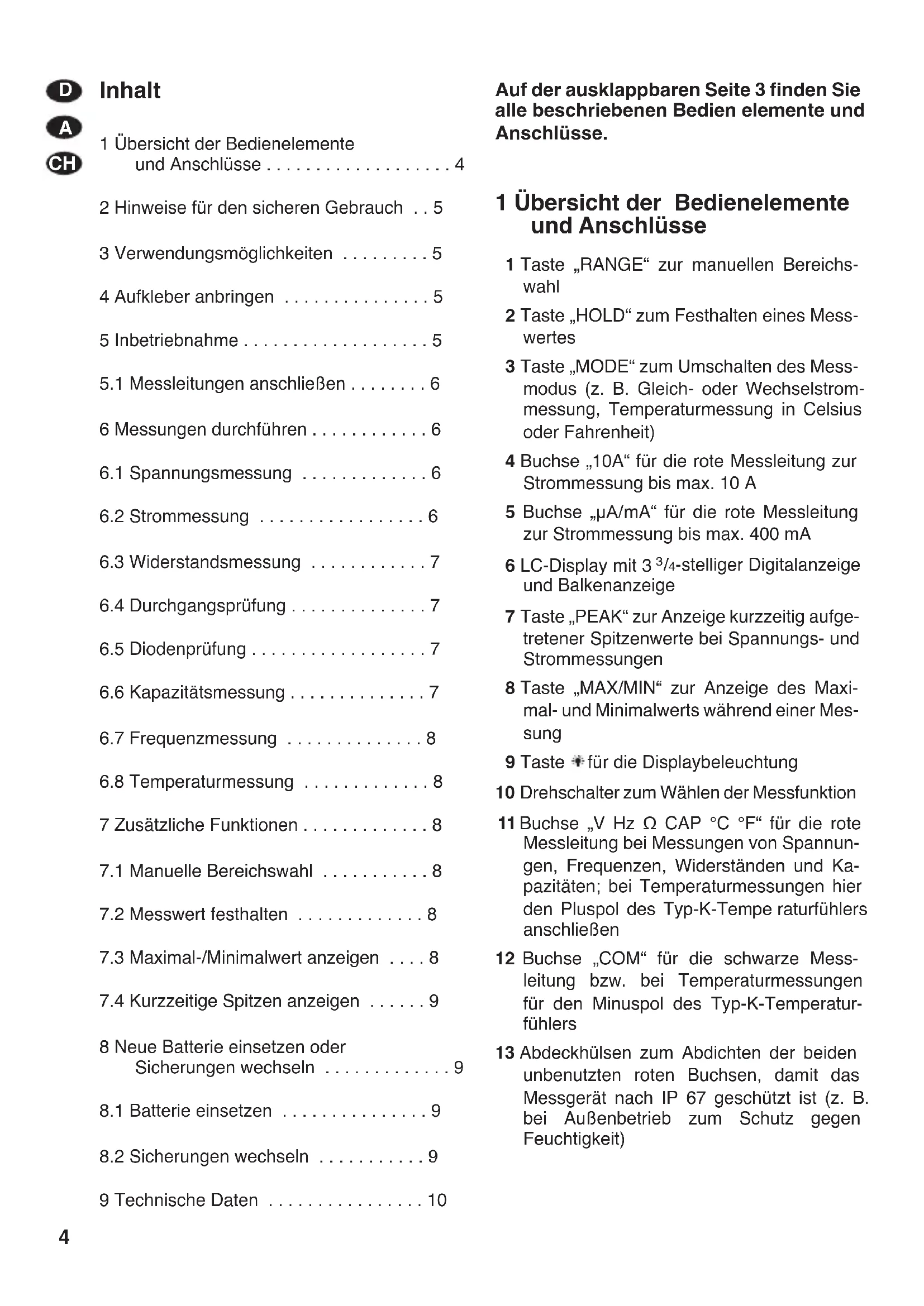 20 °C bis +760 °C. Außerdem lassen sich Dioden überprüfen. Zur Durchgangsprüfung ist ein Summer vorhanden. 4 Aufkleber anbringen Dem Gerät liegen Aufkleber mit wichtigen Hinweisen in acht Sprachen bei. Kleben Sie vor der Inbetriebnahme die Hinweise in Ihrer Landes- sprache auf das vorgesehe - ne Feld des Batteriefach - deckels! 5 Inbetriebnahme