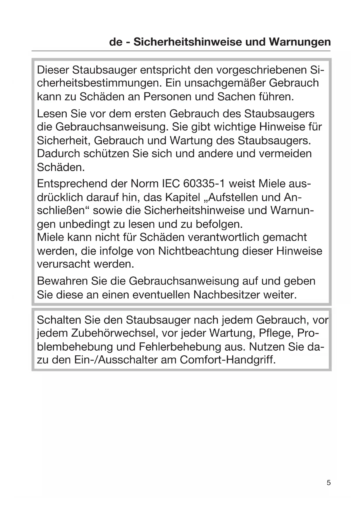 Dieser Staubsauger entspricht den vorgeschriebenen Si- cherheitsbestimmungen. Ein unsachgemäßer Gebrauch kann zu Schäden an Personen und Sachen führen. Lesen Sie vor dem ersten Gebrauch des Staubsaugers die Gebrauchsanweisung. Sie gibt wichtige Hinweise für Sicherheit, Gebrauch und Wartung des Staubsaugers. Dadurch schützen Sie sich und andere und vermeiden Schäden. Entsprechend der Norm IEC 60335-1 weist Miele aus- drücklich darauf hin, das Kapitel „Aufstellen und An- schließen“ sowie die Sicherheitshinweise und Warnun- gen unbedingt zu lesen und zu befolgen. Miele kann nicht für Schäden verantwortlich gemacht werden, die infolge von Nichtbeachtung dieser Hinweise verursacht werden. Bewahren Sie die Gebrauchsanweisung auf und geben Sie diese an einen eventuellen Nachbesitzer weiter. Schalten Sie den Staubsauger nach jedem Gebrauch, vor jedem Zubehörwechsel, vor jeder Wartung, Pflege, Pro- blembehebung und Fehlerbehebung aus. Nutzen Sie da- zu den Ein-/Ausschalter am Comfort-Handgriff.de - Sicherheitshinweise und Warnungen