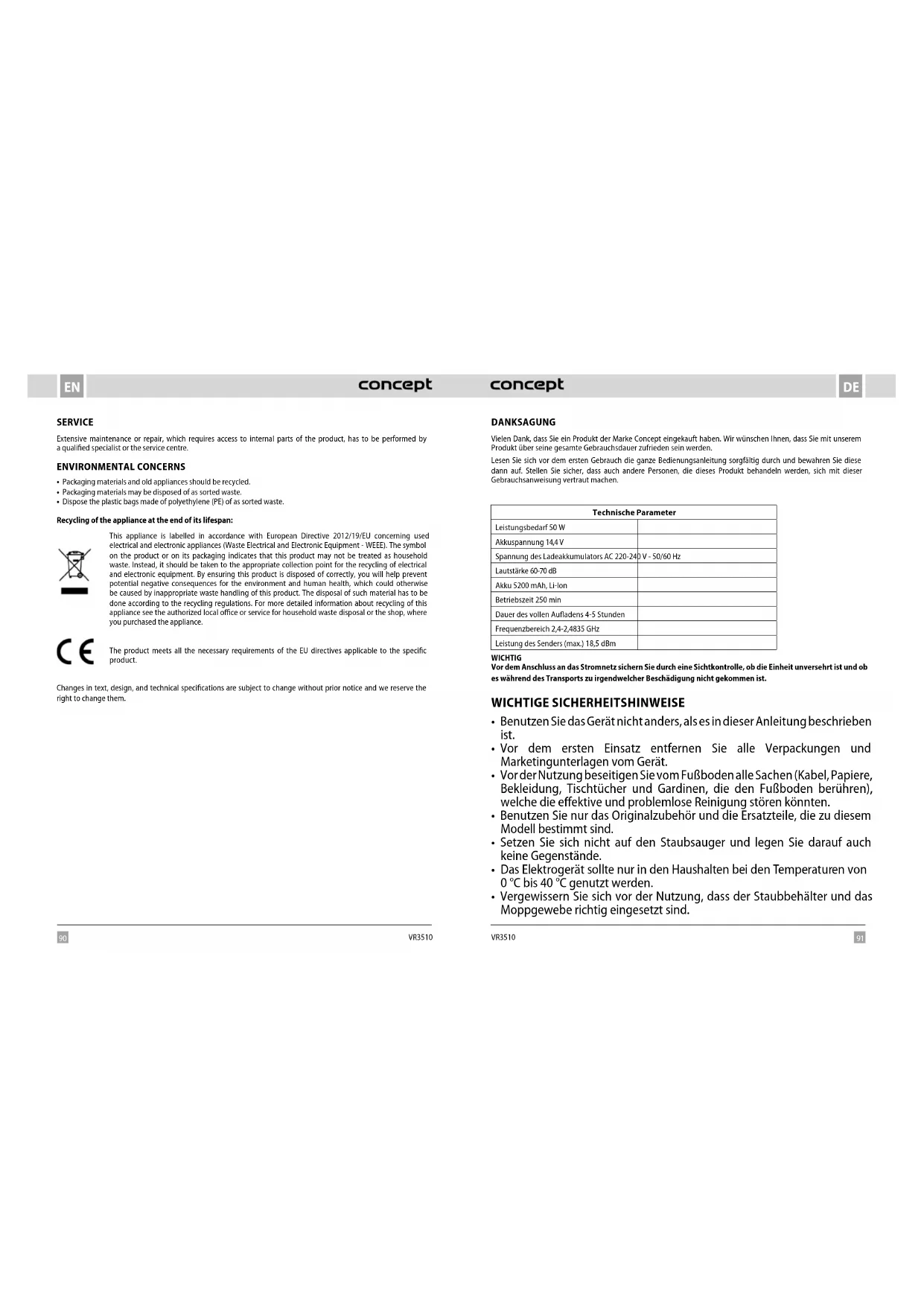 - Dispose the plastic bags made of polyethylene (PE) of as sorted waste. Recycling of the appliance at the end of its lifespan: This appliance is labelled in accordance with European Directive 2012/19/EU concerning used electrical and electronic appliances (Waste Electrical and Electronic Equipment - WEEE). The symbol on the product or on its packaging indicates that this product may not be treated as household waste. Instead, it should be taken to the appropriate collection point for the recycling of electrical and electronic equipment. By ensuring this product is disposed of correctly, you will help prevent potential negative consequences for the environment and human health, which could otherwise be caused by inappropriate waste handling of this product. The disposal of such material has to be done according to the recycling regulations. For more detailed information about recycling of this appliance see the authorized local office or service for household waste disposal or the shop, where you purchased the appliance. The product meets all the necessary requirements of the EU directives applicable to the specific product. Changes in text, design, and technical specifications are subject to change without prior notice and we reserve the right to change them. DANKSAGUNG Vielen Dank, dass Sie ein Produkt der Marke Concept eingekauft haben. Wir wünschen Ihnen, dass Sie mit unserem Produkt über seine gesamte Gebrauchsdauer zufrieden sein werden. Lesen Sie sich vor dem ersten Gebrauch die ganze Bedienungsanleitung sorgfältig durch und bewahren Sie diese dann auf. Stellen Sie sicher, dass auch andere Personen, die dieses Produkt behandeln werden, sich mit dieser Gebrauchsanweisung vertraut machen. Technische Parameter Leistungsbedarf 50 W Akkuspannung 14,4 V Spannung des Ladeakkumulators AC 220-240 V - 50/60 Hz Lautstärke 60-70 dB Akku 5200 mAh, Li-Ion Betriebszeit 250 min Dauer des vollen Aufladens 4-5 Stunden Frequenzbereich 2,4-2,4835 GHz Leistung des Senders (max.) 18,5 dBm WICHTIG Vor dem Anschluss an das Stromnetz sichern Sie durch eine Sichtkontrolle, ob die Einheit unversehrt ist und ob es während des Transports zu irgendwelcher Beschädigung nicht gekommen ist. WICHTIGE SICHERHEITSHINWEISE
