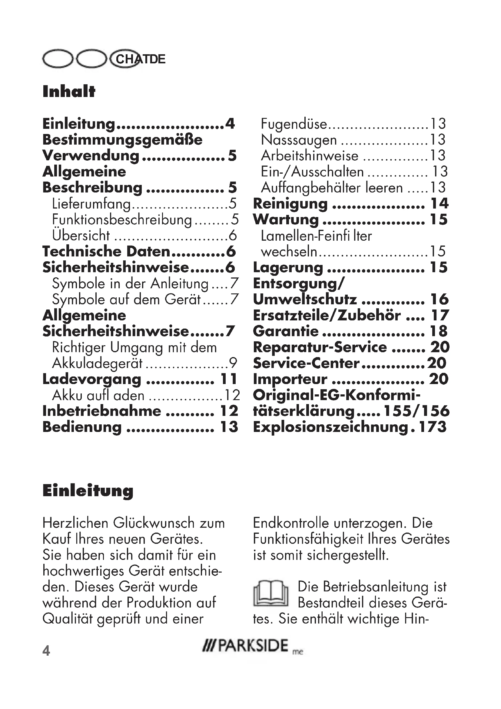 - /156 Explosionszeichnung . 173 Endkontrolle unterzogen. Die Funktionsfähigkeit Ihres Gerätes ist somit sichergestellt. Die Betriebsanleitung ist Bestandteil dieses Gerä- tes. Sie enthält wichtige Hin- Inhalt Einleitung p. 4