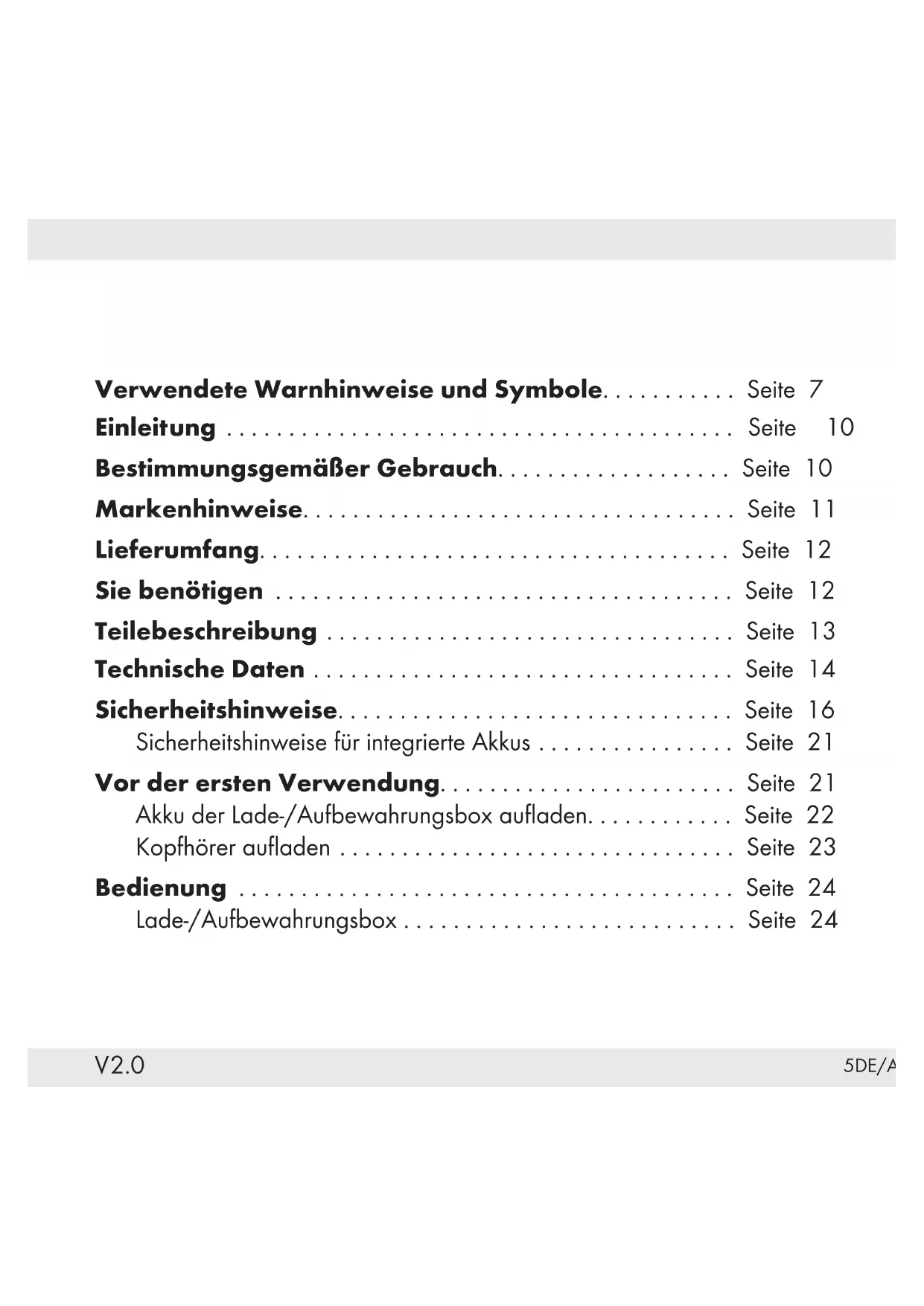 2bB5DE/AT/CH Verwendete Warnhinweise und Symbole........... Seite 7 Einleitung ......................................... Seite 10 Bestimmungsgemäßer Gebrauch................... Seite 10 Markenhinweise................................... Seite 11 Lieferumfang...................................... Seite 12 Sie benötigen ..................................... Seite 12 Teilebeschreibung ................................. Seite 13 Technische Daten .................................. Seite 14 Sicherheitshinweise................................ Seite 16 Sicherheitshinweise für integrierte Akkus ................ Seite 21 Vor der ersten Verwendung........................ Seite 21 Akku der Lade-/Aufbewahrungsbox aufladen............ Seite 22 Kopfhörer aufladen ................................ Seite 23 Bedienung ........................................ Seite 24 Lade-/Aufbewahrungsbox ........................... Seite 24 V 2.06 DE/AT/CH Kopfhörer ......................................... Seite 25 Kopfhörer einschalten .............................. Seite 25 Kopfhörer ausschalten . . . . . . . . . . . . . . . . . . . . . . . . . . . . . . Seite 25 Kopfhörer manuell ausschalten ....................... Seite 25 LED-Status ....................................... Seite 26 Kopfhörer miteinander koppeln . . . . . . . . . . . . . . . . . . . . . . . Seite 26 Kopfhörer mit einem Bluetooth-Gerät koppeln............ Seite 27 Zurücksetzen ..................................... Seite 28 Funktionen der Kopfhörertasten für Musikwiedergabe ..... Seite 28 Headset für Anrufe / Wiedergabesteuerung............. Seite 30 Sprachsteuerungsfunktion mit Siri / Google Assistant ...... Seite 31 Reinigung und Pflege .............................. Seite 32 Lagerung bei Nichtbenutzung ........................ Seite 33 Fehlerbehebung ................................... Seite 33 Entsorgung ........................................ Seite 35 Vereinfachte EU‑Konformitätserklärung ............ Seite 36 Garantie .......................................... Seite 37 Abwicklung im Garantiefall .......................... Seite 38 Service ............................................ Seite 397DE/AT/CH Verwendete Warnhinweise und Symbole In dieser Bedienungsanleitung, auf der Verpackung und auf dem Produkt werden folgende Warnhinweise verwendet: GEFAHR! Dieses Symbol mit dem Signalwort „Gefahr“ bezeichnet eine Gefährdung mit einem hohen Risikograd, die, wenn sie nicht vermieden wird, eine schwere Verletzung oder den Tod zur Folge hat. WARNUNG! Dieses Symbol mit dem Signalwort „Warnung“ bezeichnet eine Gefährdung mit einem mittleren Risikograd, die, wenn sie nicht vermieden wird, eine schwere Verletzung oder den Tod zur Folge haben kann. VORSICHT! Dieses Symbol mit dem Signalwort „Vorsicht“ bezeichnet eine Gefährdung mit einem niedrigen Risikograd, die, wenn sie nicht vermieden wird, eine geringe oder mäßige Verletzung zur Folge haben kann.8 DE/AT/CH ACHTUNG! Dieses Symbol mit dem Signalwort „Achtung“ zeigt die Gefahr einer möglichen Sachbeschädigung an. HINWEIS: Dieses Symbol mit dem Signalwort „Hinweis“ bietet weitere nützliche Informationen. WARNUNG! EXPLOSIONSGEFAHR! Eine Warnung, welche mit diesem Zeichen und den Worten „WARNUNG! EXPLOSIONSGEFAHR!“ versehen ist, weist auf eine mögliche Explosionsgefahr hin. Wird ein solcher Warnhinweis nicht befolgt, kann das ernsthafte Verletzungen nach sich ziehen oder tödlich enden und möglichen Sachschaden nach sich ziehen. Folgen Sie den Anweisungen in dieser Warnung, um schwere Verletzungen, Lebensgefahr oder die Gefahr von Sachschäden zu verhindern!9DE/AT/CH Dieses Gebotszeichen weist darauf hin, geeignete Schutzhandschuhe zu tragen! Folgen Sie diesem Warnhinweis, um Handverletzungen durch Gegenstände oder Kontakt mit heißen oder chemischen Materialien zu vermeiden! Ein Warnhinweis mit diesem Symbol informiert den Benutzer über mögliche Hörschaden. Vermeiden Sie es, über längere Zeiträume hohe Lautstärken zu hören. Gleichstrom/-spannung Dieses Symbol bedeutet, dass vor der Verwendung des Produkts die Betriebsanleitung zu lesen ist. Das CE-Zeichen bestätigt Konformität mit den für das Produkt zutreffenden EU-Richtlinien.10 DE/AT/CH