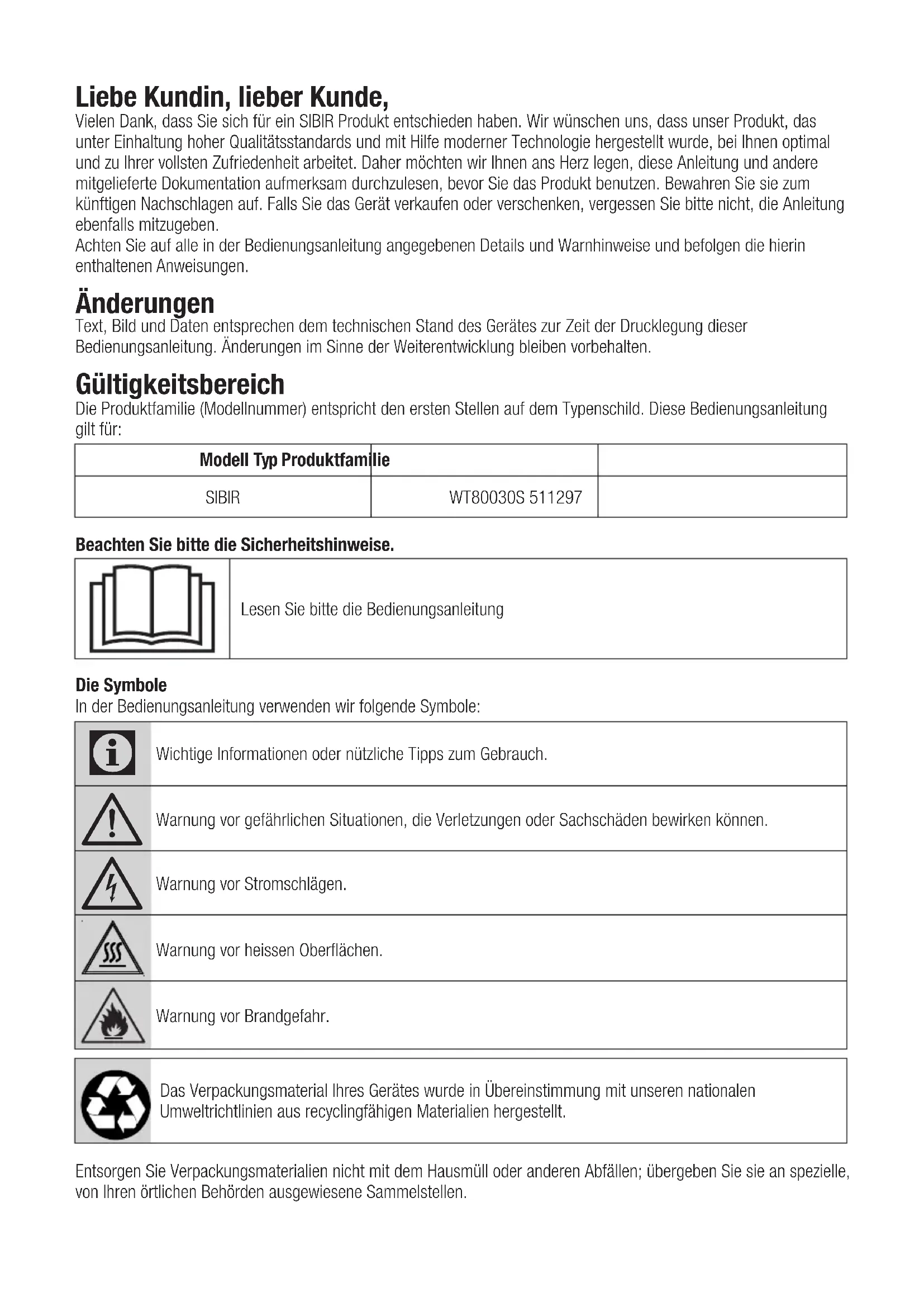Tumble dryerLiebe Kundin, lieber Kunde, Vielen Dank, dass Sie sich für ein SIBIR Produkt entschieden haben. Wir wünschen uns, dass unser Produkt, das unter Einhaltung hoher Qualitätsstandards und mit Hilfe moderner Technologie hergestellt wurde, bei Ihnen optimal und zu Ihrer vollsten Zufriedenheit arbeitet. Daher möchten wir Ihnen ans Herz legen, diese Anleitung und andere mitgelieferte Dokumentation aufmerksam durchzulesen, bevor Sie das Produkt benutzen. Bewahren Sie sie zum künftigen Nachschlagen auf. Falls Sie das Gerät verkaufen oder verschenken, vergessen Sie bitte nicht, die Anleitung ebenfalls mitzugeben. Achten Sie auf alle in der Bedienungsanleitung angegebenen Details und Warnhinweise und befolgen die hierin enthaltenen Anweisungen. Änderungen Text, Bild und Daten entsprechen dem technischen Stand des Gerätes zur Zeit der Drucklegung dieser Bedienungsanleitung. Änderungen im Sinne der Weiterentwicklung bleiben vorbehalten. Gültigkeitsbereich Die Produktfamilie (Modellnummer) entspricht den ersten Stellen auf dem Typenschild. Diese Bedienungsanleitung gilt für: Modell Typ Produktfamilie SIBIR WT80030S 511297 Beachten Sie bitte die Sicherheitshinweise. Lesen Sie bitte die Bedienungsanleitung Die Symbole In der Bedienungsanleitung verwenden wir folgende Symbole: