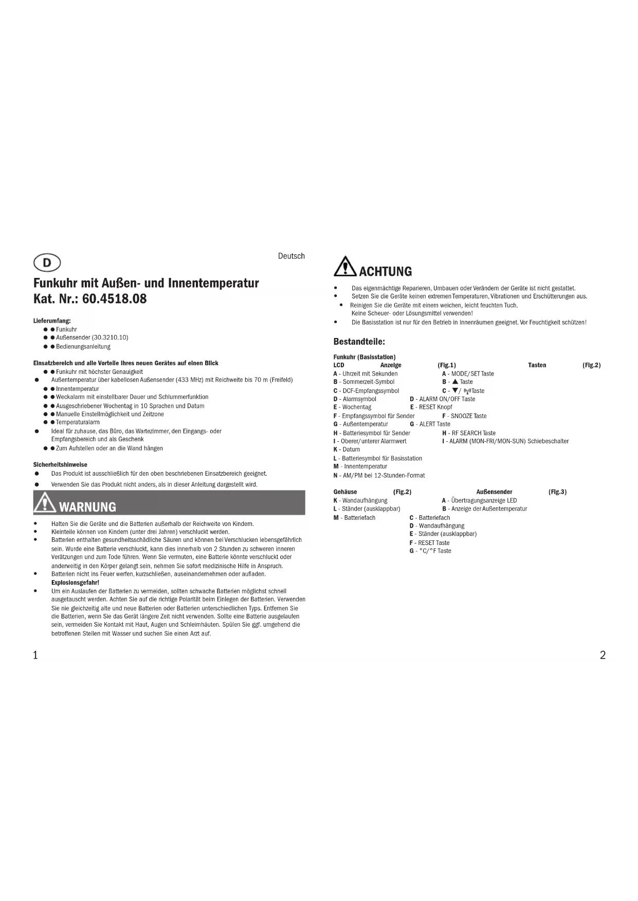 RESET °C /°F X-III X-IVDeutsch Funkuhr mit Außen- und Innentemperatur Kat. Nr.: 60.4518.08 Lieferumfang: Funkuhr Außensender (30.3210.10) BedienungsanleitungEinsatzbereich und alle Vorteile Ihres neuen Gerätes auf einen Blick Funkuhr mit höchster Genauigkeit Außentemperatur über kabellosen Außensender (433 MHz) mit Reichweite bis 70 m (Freifeld) Innentemperatur Weckalarm mit einstellbarer Dauer und Schlummerfunktion Ausgeschriebener Wochentag in 10 Sprachen und Datum Manuelle Einstellmöglichkeit und Zeitzone Temperaturalarm Ideal für zuhause, das Büro, das Wartezimmer, den Eingangs- oder Empfangsbereich und als Geschenk Zum Aufstellen oder an die Wand hängenSicherheitshinweise Das Produkt ist ausschließlich für den oben beschriebenen Einsatzbereich geeignet. Verwenden Sie das Produkt nicht anders, als in dieser Anleitung dargestellt wird. WARNUNG y Halten Sie die Geräte und die Batterien außerhalb der Reichweite von Kindern. y Kleinteile können von Kindern (unter drei Jahren) verschluckt werden. y Batterien enthalten gesundheitsschädliche Säuren und können bei Verschlucken lebensgefährlich sein. Wurde eine Batterie verschluckt, kann dies innerhalb von 2 Stunden zu schweren inneren Verätzungen und zum Tode führen. Wenn Sie vermuten, eine Batterie könnte verschluckt oder anderweitig in den Körper gelangt sein, nehmen Sie sofort medizinische Hilfe in Anspruch. y Batterien nicht ins Feuer werfen, kurzschließen, auseinandernehmen oder auaden. Explosionsgefahr! y Um ein Auslaufen der Batterien zu vermeiden, sollten schwache Batterien möglichst schnell ausgetauscht werden. Achten Sie auf die richtige Polarität beim Einlegen der Batterien. Verwenden Sie nie gleichzeitig alte und neue Batterien oder Batterien unterschiedlichen Typs. Entfernen Sie die Batterien, wenn Sie das Gerät längere Zeit nicht verwenden. Sollte eine Batterie ausgelaufen sein, vermeiden Sie Kontakt mit Haut, Augen und Schleimhäuten. Spülen Sie ggf. umgehend die betroffenen Stellen mit Wasser und suchen Sie einen Arzt auf. ACHTUNG y Das eigenmächtige Reparieren, Umbauen oder Verändern der Geräte ist nicht gestattet. y Setzen Sie die Geräte keinen extremen Temperaturen, Vibrationen und Erschütterungen aus. y Reinigen Sie die Geräte mit einem weichen, leicht feuchten Tuch. Keine Scheuer- oder Lösungsmittel verwenden! y Die Basisstation ist nur für den Betrieb in Innenräumen geeignet. Vor Feuchtigkeit schützen! Bestandteile: Funkuhr (Basisstation) LCD Anzeige (Fig.1) Tasten (Fig.2) A - Uhrzeit mit Sekunden A - MODE/SET Taste B - Sommerzeit-Symbol B - Taste C - DCF-Empfangssymbol C - / Taste D - Alarmsymbol D - ALARM ON/OFF TasteE - Wochentag E - RESET Knopf F - Empfangssymbol für Sender F - SNOOZE Taste G - Außentemperatur G - ALERT Taste H - Batteriesymbol für Sender H - RF SEARCH Taste I - Oberer/unterer Alarmwert I - ALARM (MON-FRI/MON-SUN) Schiebeschalter K - Datum L - Batteriesymbol für Basisstation M - Innentemperatur N - AM/PM bei 12-Stunden-FormatGehäuse (Fig.2) Außensender (Fig.3) K - Wandaufhängung A - Übertragungsanzeige LED L - Ständer (ausklappbar) B - Anzeige der Außentemperatur M - Batteriefach C - Batteriefach D - Wandaufhängung E - Ständer (ausklappbar) F - RESET Taste G - °C/°F Taste 1 21. Inbetriebnahme Batterien einlegen Öffnen Sie das Batteriefach der Basisstation (Fig.2-M) und legen Sie vier neue Batterien 1,5 V AA polrichtig ein. Ein Signalton ertönt und alle LCD-Segmente werden kurz angezeigt. Schließen Sie den Batteriedeckel wieder. Öffnen Sie das Batteriefach des Außensenders (Fig.3-C) und legen Sie zwei neue Batterien 1,5 V AAA polrichtig ein. Das Kontrolllicht (Fig.3-A) leuchtet kurz auf. Die Außentemperatur wird angezeigt. Drücken Sie die °C/°F Taste im Batteriefach (Fig.3-G) des Senders, um Celsius (°C) oder Fahrenheit (°F) als Temperaturanzeige auszuwählen. Schließen Sie den Batteriedeckel wieder. Empfang der Außenwerte Die Basisstation versucht nun, die Außentemperatur zu empfangen und das Empfangssymbol (Fig.1-F) blinkt. Wird die Außentemperatur (Fig.1-G) nicht empfangen, erscheint „- -. -“ auf dem Display der Basisstation. Prüfen Sie die Batterien und starten Sie einen weiteren Versuch. Sie können die Sendersuche zu einem späteren Zeitpunkt auch manuell starten (z.B. bei Verlust des Senders oder Batteriewechsel). Halten Sie die RF SEARCH Taste (Fig.2-H) auf der Basisstation für drei Sekunden gedrückt. Drücken Sie dann die RESET Taste (Fig.3-F) im Batteriefach des Außensenders. Empfang der Funkzeit Die Uhr versucht nun, das Funksignal zu empfangen und das DCF-Empfangssymbol (Fig.1-C) blinkt. Wenn der Zeitcode nach einigen Minuten empfangen wurde, werden die funkgesteuerte Zeit und das DCF-Empfangssymbol ständig im Display angezeigt. Während der Sommerzeit erscheint DST (Fig.1-B) auf dem Display. Ist kein Funkempfang erfolgt, können Sie die Initialisierung auch manuell starten. Halten Sie die / Taste (Fig.2-C) für drei Sekunden gedrückt. Das DCF-Empfangssymbol (Fig.1-C) blinkt. Unterbrechen Sie den Empfangsversuch, indem Sie die / Taste noch einmal für drei Sekun- den gedrückt halten. Das DCF-Empfangssymbol verschwindet. Der DCF-Signalempfang ndet täglich um 3:00 Uhr morgens statt. Falls die Funkuhr kein DCF-Funksignal empfangen kann (z.B. wegen Störungen, Übertragungsdistanz, etc.), kann die Zeit manuell eingestellt werden.
