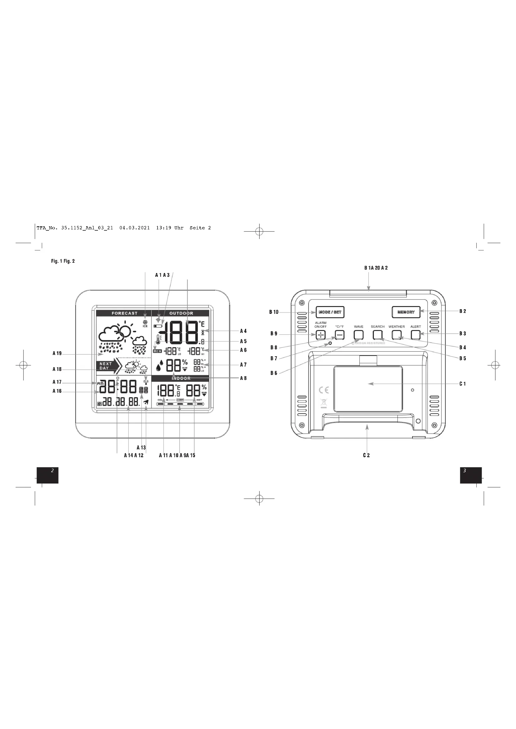 A: Display-Anzeige (Fig. 1): A 1: Funksymbol Außensender A 2: Batteriesymbol für den Sender A 3: Außentemperatur A 4: Temperaturalarm Hi/Lo A 5: Max.-Min.-Speicher mit manueller Rückstellung A 6: Höchst- und Tiefstwerte der Außentemperatur A 7: Höchst- und Tiefstwerte der Außenluftfeuchtigkeit A 8: Außenluftfeuchtigkeit A 9: Innenluftfeuchtigkeit A 10: Komfortzonenindikator A 11: Innentemperatur A 12: Alarmsymbol A 13: Wochentag/Sekunden A 14: Datum A 15: DST-Symbol A 16: Uhrzeit/Alarmzeit A 17: AM/PM bei 12-Stunden-System A 18: DCF Empfangssignal A 19: Wettervorhersage mit Symbolen A 20: Frostsymbol B: Tasten (Fig. 2): B 1: SNOOZE/LIGHT Taste B 2: MEMORY Taste B 3: ALERT Taste B 4: WEATHER Taste B 5: SEARCH Taste B 6: WAVE Taste B 7: RESET Taste B 8: °C/°F – Taste B 9: ALARM ON/OFF + Taste B 10: MODE/SET Taste C: Gehäuse (Fig. 2): C 1: Batteriefach C 2: Ständer TFA_No. 35.1152_Anl_03_21 04.03.2021 13:19 Uhr Seite 498 SKY– Funk-Wetterstation