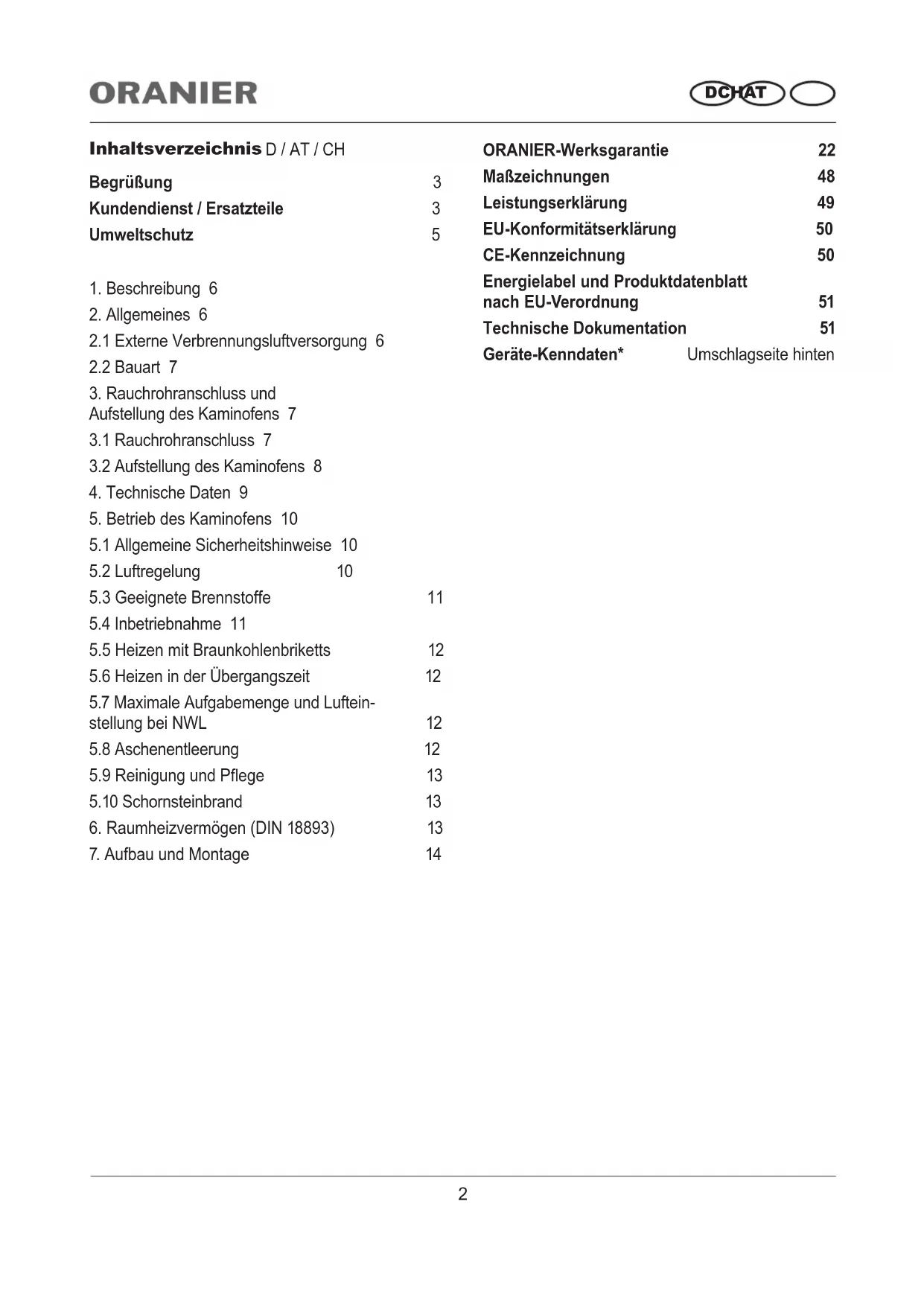 ORANIER Club W+ II2 D CHAT Inhaltsverzeichnis D / AT / CH Begrüßung 3 Kundendienst / Ersatzteile 3 Umweltschutz 5