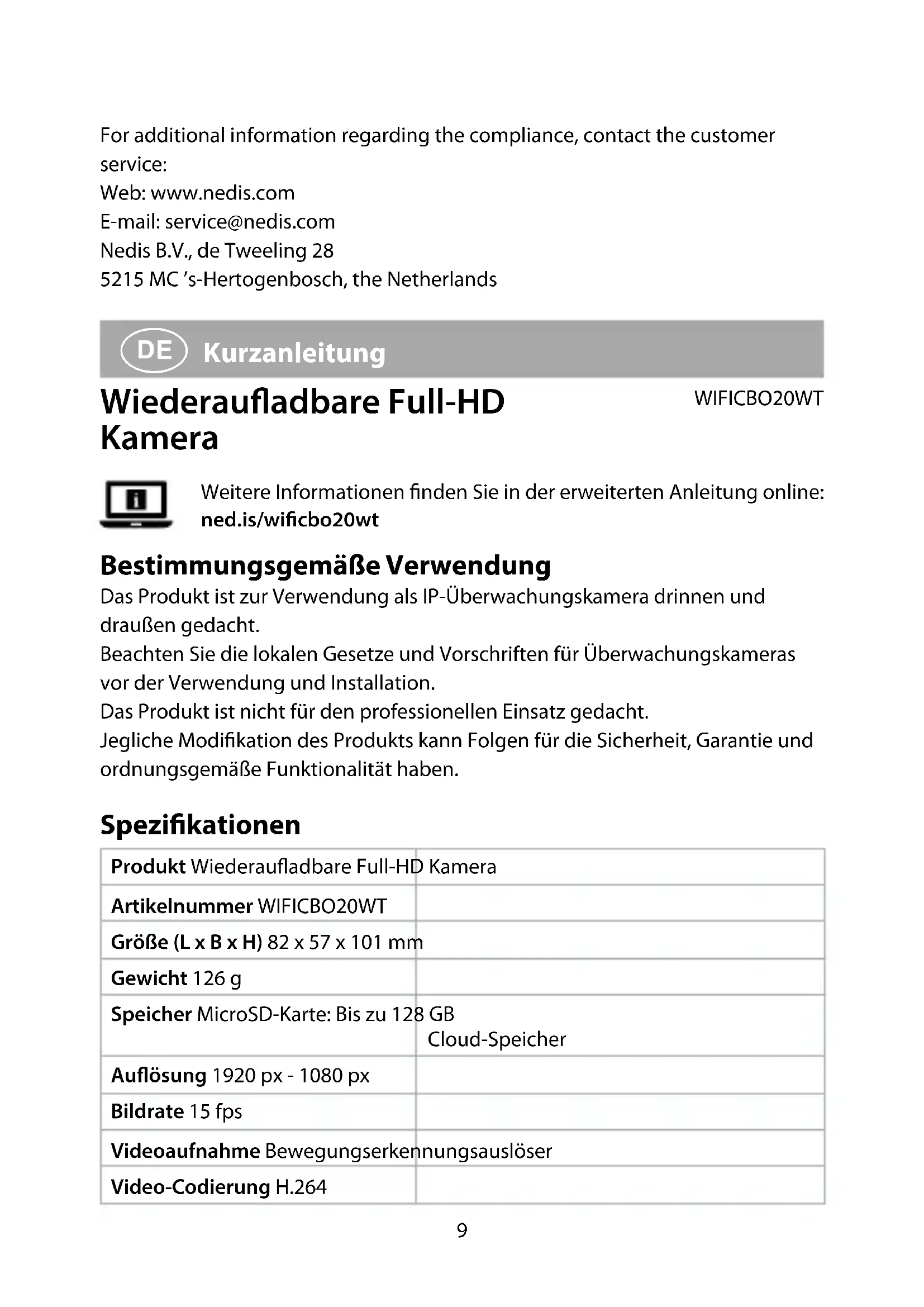 Einstellungen Tippen Sie auf die Einstellungsschaltäche , um den Einstellungsbildschirm zu önen. Produktnamen ändern Hier können Sie den Namen der Überwachungskamera ändern. Produkte teilen Teilen Sie den Zugang zu dem Produkt mit anderen. Produktinformationen Anzeigen von Informationen zum Produkt. Energieverwaltung Anzeigen des Batteriestatus und Einstellen des Signals für niedrigen Ladezustand. Grundlegende Funktionseinstellungen Änderung der Kameraeinstellungen. PIR-Schalter Anpassung der Empndlichkeit der Bewegungserkennung. SD-Karteneinstellungen Anzeigen der Einstellungen der microSD-Karte und Festlegen der Aufnahmeeinstellungen. Feedback Produktbezogenes Feedback an Nedis senden. Firmware-Info Zeigt die Version der Software an. Produkt entfernen Entfernt das Produkt aus der Nedis SmartLife-App. Konformitätserklärung Wir, Nedis B.V., erklären als Hersteller, dass das Produkt WIFICBO20WT unserer Marke Nedis®, produziert in China, nach allen geltenden CE-Standards und Vorschriften getestet wurde und alle diese Tests erfolgreich bestanden hat. Dies gilt unter anderem auch für die Richtlinie RED 2014/53/EU. Die vollständige Konformitätserklärung (und das Sicherheitsdatenblatt, falls zutreend) steht zum Download zur Verfügung unter: nedis.de/WIFICBO20WT#support Weiterführende Informationen zur Compliance erhalten Sie über den Kundenservice:15 Web: www.nedis.com E-Mail: service@nedis.com Nedis B.V., de Tweeling 28 5215 MC ’s-Hertogenbosch, Niederlande