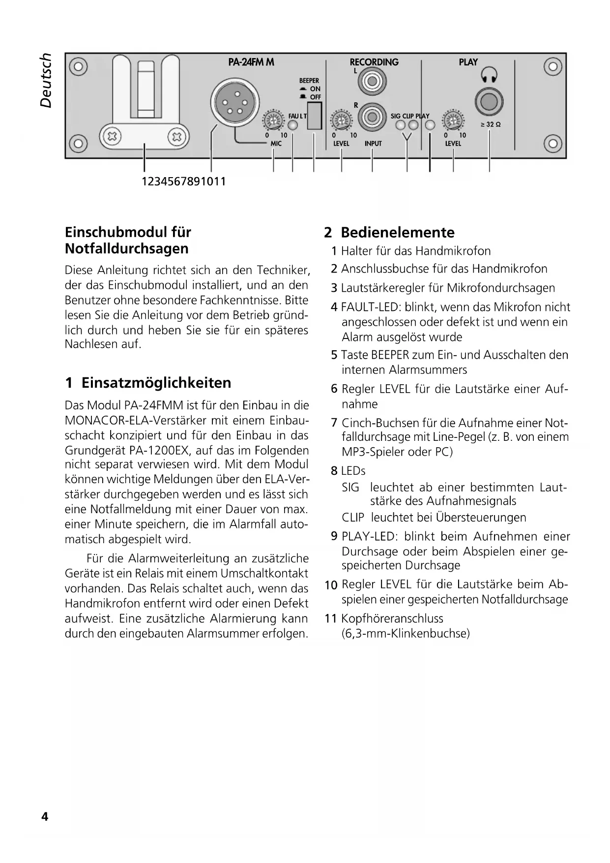 Deutsch Deutsch Seite Einschubmodul für Notfalldurchsagen Diese Anleitung richtet sich an den Techniker, der das Einschubmodul installiert, und an den Benutzer ohne besondere Fachkenntnisse. Bitte lesen Sie die Anleitung vor dem Betrieb gründ- lich durch und heben Sie sie für ein späteres Nachlesen auf. 1 Einsatzmöglichkeiten Das Modul PA-24FMM ist für den Einbau in die MONACOR-ELA-Verstärker mit einem Einbau- schacht konzipiert und für den Einbau in das Grundgerät PA-1200EX, auf das im Folgenden nicht separat verwiesen wird. Mit dem Modul können wichtige Meldungen über den ELA-Ver- stärker durchgegeben werden und es lässt sich eine Notfallmeldung mit einer Dauer von max. einer Minute speichern, die im Alarmfall auto- matisch abgespielt wird. Für die Alarmweiterleitung an zusätzliche Geräte ist ein Relais mit einem Umschaltkontakt vorhanden. Das Relais schaltet auch, wenn das Handmikrofon entfernt wird oder einen Defekt aufweist. Eine zusätzliche Alarmierung kann durch den eingebauten Alarmsummer erfolgen. 2 Bedienelemente 1 Halter für das Handmikrofon 2 Anschlussbuchse für das Handmikrofon 3 Lautstärkeregler für Mikrofondurchsagen 4 FAULT-LED: blinkt, wenn das Mikrofon nicht angeschlossen oder defekt ist und wenn ein Alarm ausgelöst wurde 5 Taste BEEPER zum Ein- und Ausschalten den internen Alarmsummers
