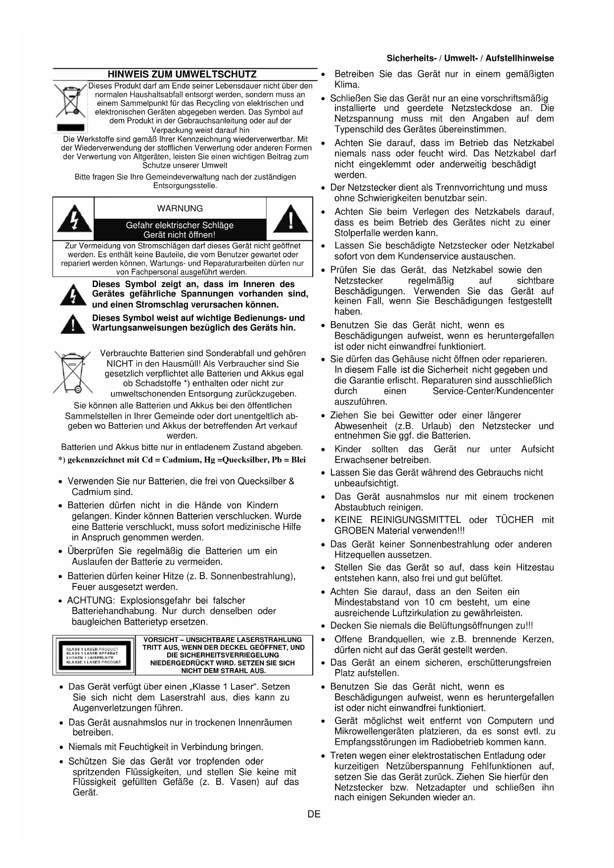 Das Gerät verfügt über einen „Klasse 1 Laser“. Setzen Sie sich nicht dem Laserstrahl aus, dies kann zu Augenverletzungen führen. Das Gerät ausnahmslos nur in trockenen Innenräumen betreiben. Niemals mit Feuchtigkeit in Verbindung bringen. Schützen Sie das Gerät vor tropfenden oder spritzenden Flüssigkeiten, und stellen Sie keine mit Flüssigkeit gefüllten Gefäße (z. B. Vasen) auf das Gerät. Betreiben Sie das Gerät nur in einem gemäßigten Klima. Schließen Sie das Gerät nur an eine vorschriftsmäßig installierte und geerdete Netzsteckdose an. Die Netzspannung muss mit den Angaben auf dem Typenschild des Gerätes übereinstimmen. Achten Sie darauf, dass im Betrieb das Netzkabel niemals nass oder feucht wird. Das Netzkabel darf nicht eingeklemmt oder anderweitig beschädigt werden. Der Netzstecker dient als Trennvorrichtung und muss ohne Schwierigkeiten benutzbar sein. Achten Sie beim Verlegen des Netzkabels darauf, dass es beim Betrieb des Gerätes nicht zu einer Stolperfalle werden kann. Lassen Sie beschädigte Netzstecker oder Netzkabel sofort von dem Kundenservice austauschen. Prüfen Sie das Gerät, das Netzkabel sowie den Netzstecker regelmäßig auf sichtbare Beschädigungen. Verwenden Sie das Gerät auf keinen Fall, wenn Sie Beschädigungen festgestellt haben. Benutzen Sie das Gerät nicht, wenn es Beschädigungen aufweist, wenn es heruntergefallen ist oder nicht einwandfrei funktioniert. Sie dürfen das Gehäuse nicht öffnen oder reparieren. In diesem Falle ist die Sicherheit nicht gegeben und die Garantie erlischt. Reparaturen sind ausschließlich durch einen Service-Center/Kundencenter auszuführen. Ziehen Sie bei Gewitter oder einer längerer Abwesenheit (z.B. Urlaub) den Netzstecker und entnehmen Sie ggf. die Batterien. Kinder sollten das Gerät nur unter Aufsicht Erwachsener betreiben. Lassen Sie das Gerät während des Gebrauchs nicht unbeaufsichtigt. Das Gerät ausnahmslos nur mit einem trockenen Abstaubtuch reinigen. KEINE REINIGUNGSMITTEL oder TÜCHER mit GROBEN Material verwenden!!! Das Gerät keiner Sonnenbestrahlung oder anderen Hitzequellen aussetzen. Stellen Sie das Gerät so auf, dass kein Hitzestau entstehen kann, also frei und gut belüftet. Achten Sie darauf, dass an den Seiten ein Mindestabstand von 10 cm besteht, um eine ausreichende Luftzirkulation zu gewährleisten. Decken Sie niemals die Belüftungsöffnungen zu!!! Offene Brandquellen, wie z.B. brennende Kerzen, dürfen nicht auf das Gerät gestellt werden. Das Gerät an einem sicheren, erschütterungsfreien Platz aufstellen. Benutzen Sie das Gerät nicht, wenn es Beschädigungen aufweist, wenn es heruntergefallen ist oder nicht einwandfrei funktioniert. Gerät möglichst weit entfernt von Computern und Mikrowellengeräten platzieren, da es sonst evtl. zu Empfangsstörungen im Radiobetrieb kommen kann. Treten wegen einer elektrostatischen Entladung oder kurzeitigen Netzüberspannung Fehlfunktionen auf, setzen Sie das Gerät zurück. Ziehen Sie hierfür den Netzstecker bzw. Netzadapter und schließen ihn nach einigen Sekunden wieder an.NR917 / Deutsche Bedienungsanleitung