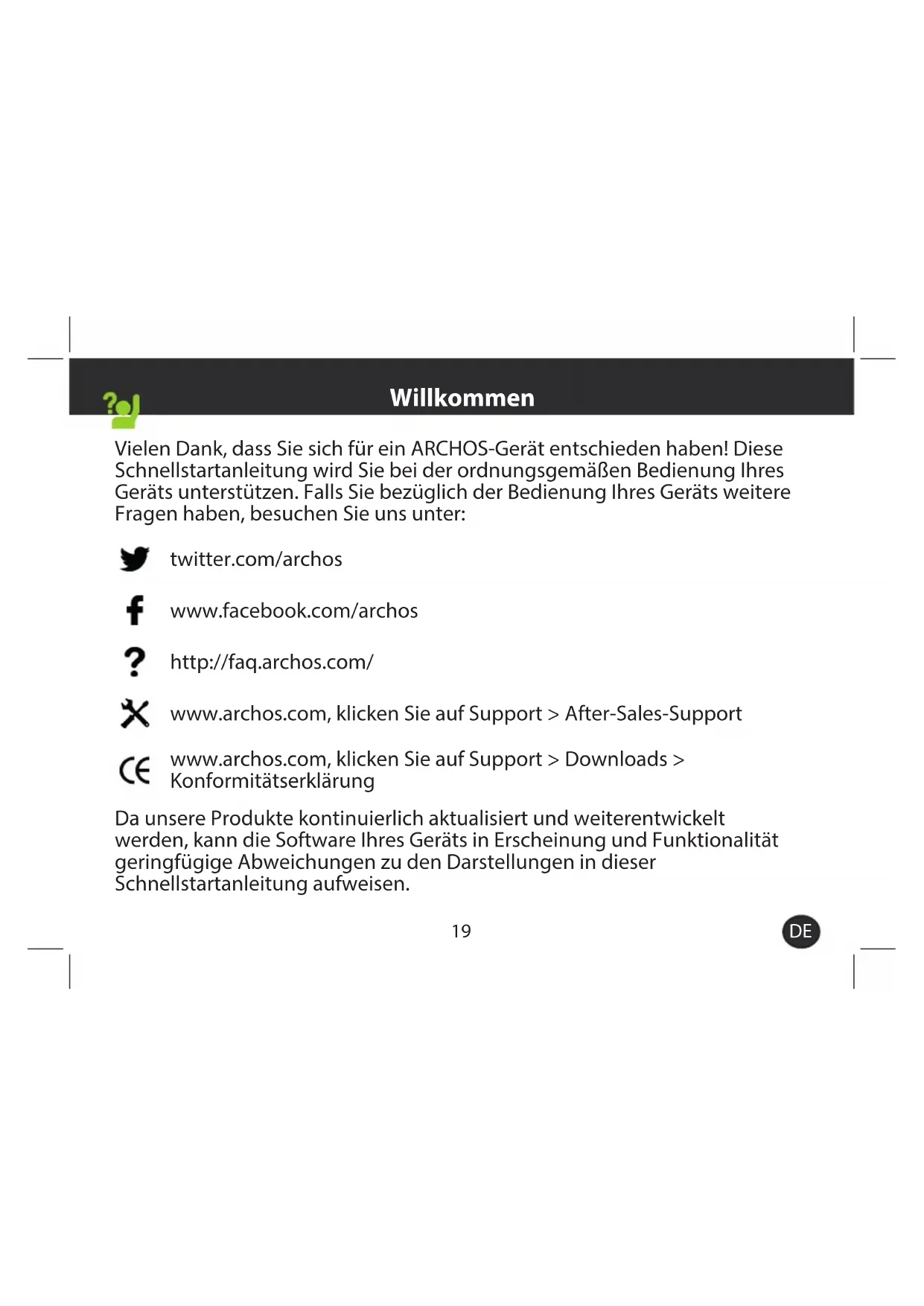 Vielen Dank, dass Sie sich für ein ARCHOS-Gerät entschieden haben! Diese Schnellstartanleitung wird Sie bei der ordnungsgemäßen Bedienung Ihres Geräts unterstützen. Falls Sie bezüglich der Bedienung Ihres Geräts weitere Fragen haben, besuchen Sie uns unter: twitter.com/archos www.facebook.com/archos http://faq.archos.com/ www.archos.com, klicken Sie auf Support > After-Sales-Support www.archos.com, klicken Sie auf Support > Downloads > Konformitätserklärung Da unsere Produkte kontinuierlich aktualisiert und weiterentwickelt werden, kann die Software Ihres Geräts in Erscheinung und Funktionalität geringfügige Abweichungen zu den Darstellungen in dieser Schnellstartanleitung aufweisen. Willkommen20