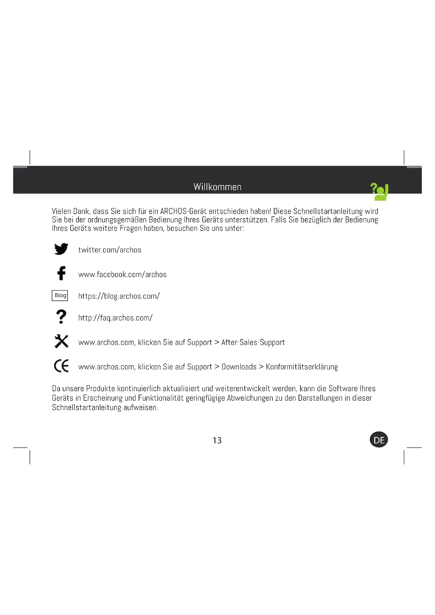 Vielen Dank, dass Sie sich für ein ARCHOS-Gerät entschieden haben! Diese Schnellstartanleitung wird Sie bei der ordnungsgemäßen Bedienung Ihres Geräts unterstützen. Falls Sie bezüglich der Bedienung Ihres Geräts weitere Fragen haben, besuchen Sie uns unter: twitter.com/archos www.facebook.com/archos Blog https://blog.archos.com/ http://faq.archos.com/ www.archos.com, klicken Sie auf Support > After-Sales-Support www.archos.com, klicken Sie auf Support > Downloads > Konformitätserklärung Da unsere Produkte kontinuierlich aktualisiert und weiterentwickelt werden, kann die Software Ihres Geräts in Erscheinung und Funktionalität geringfügige Abweichungen zu den Darstellungen in dieser Schnellstartanleitung aufweisen. WillkommenINPUT: 5V 1.5AModel: AC101AS3GV2MADE IN PRCARCHOS SA. 12 rue Ampère 91430 Igny France Access 101