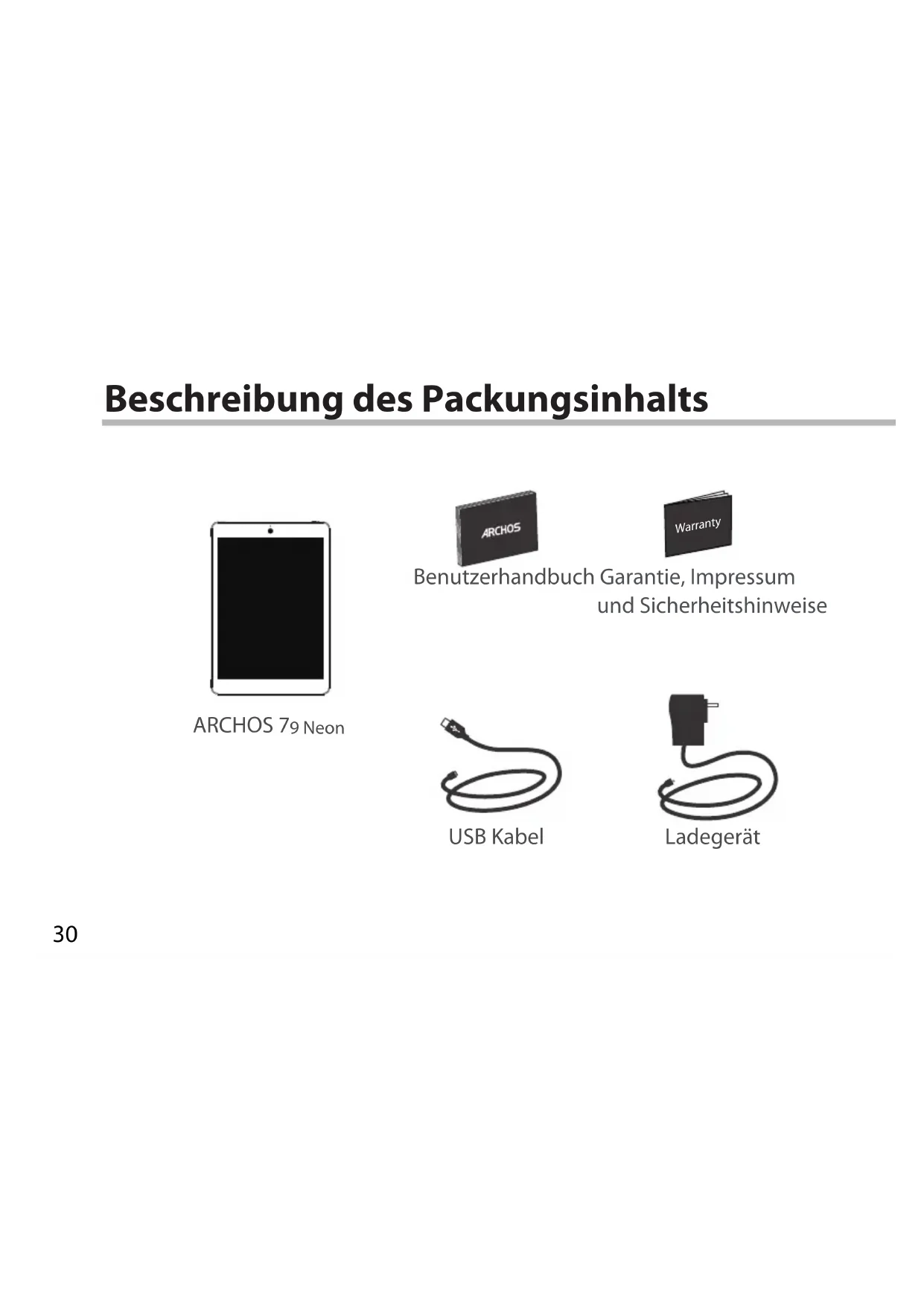 Warranty Warranty Beschreibung des Packungsinhalts Ladegerät Benutzerhandbuch Garantie, Impressum und Sicherheitshinweise USB Kabel ARCHOS 7 9 Neon31