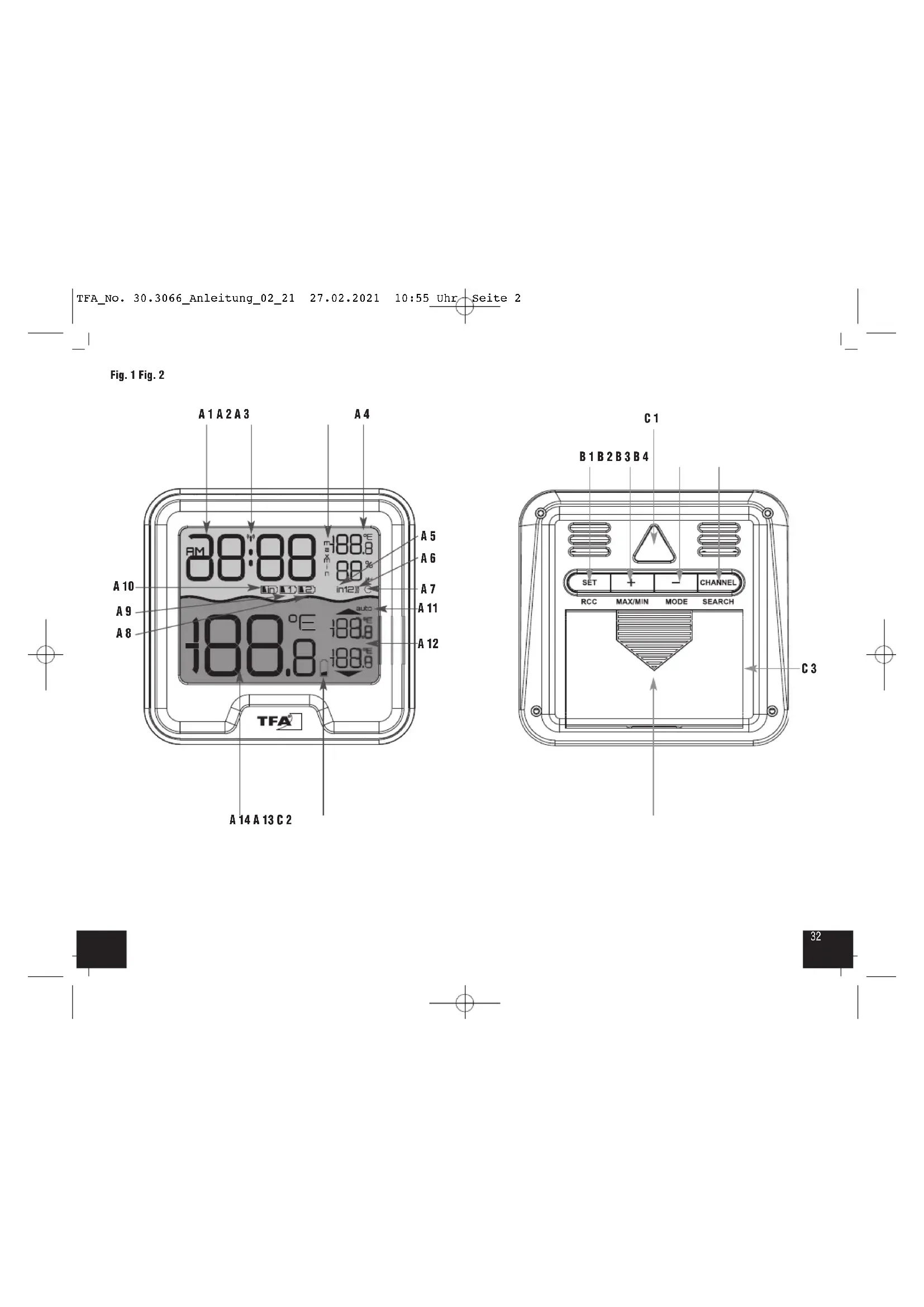 A 3: Höchst- und Tiefstwerte A 4: Temperatur und Luftfeuchtigkeit A 5: Symbol für Innenwerte, Kanal 1 oder 2 A 6: Empfangssymbol für Sender A 7: Kreissymbol für automatischen Kanalwechsel A 8: Batteriesymbol für Sender 2 (optional) A 9: Batteriesymbol für Sender 1 (optional) A 10: Batteriesymbol für die Basisstation Unteres Display Anzeige für den Poolsender A 11: Symbol für automatische Rückstellung der maximalen und minimalen Werte A 12: Maximale und minimale Wassertemperatur A 13: Batteriesymbol für den Poolsender A 14: Wassertemperatur B: Tasten (Fig. 2): B 1: SET/RCC Taste B 2: + MAX/MIN Taste B 3: – MODE Taste B 4: CHANNEL/SEARCH Taste C: Gehäuse (Fig. 2): C 1: Wandaufhängung C 2: Batteriefach C 3: Ständer (ausklappbar)