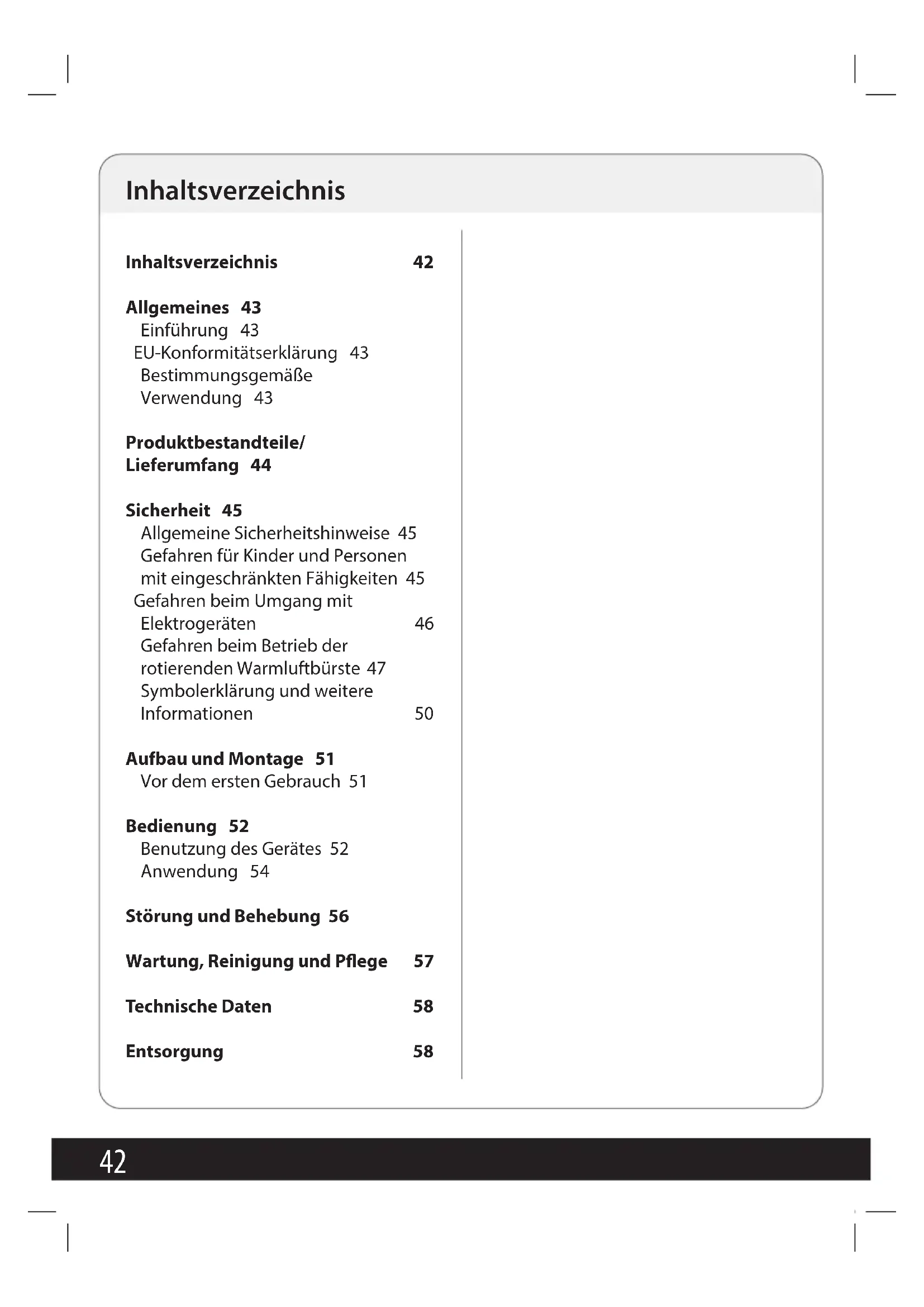 C45 Sicherheit Lesen und beachten Sie alle nachfolgend auf- geführten Sicherheits- hinweise. Bei Nichtbe- achten bestehen erheb- liche Unfall- und Ver- letzungsrisiken sowie die Gefahr von Sach- und Geräteschäden. Allgemeine Sicherheitshinweise Gefahren für Kinder und Per- sonen mit eingeschränkten Fähigkeiten - Dieses Produkt kann von Kindern ab 8Jahren sowie von Personen mit redu- zierten physischen, sen- sorischen oder mentalen Fähigkeiten oder Mangel an Erfahrung und/oder Wissen benutzt werden, wenn sie beaufsichtigt werden oder bezüglich des sicheren Gebrauchs des Produktes unterwiesen wurden und die daraus resultierten Ge- fahren verstanden haben. - Reinigung und die Wartung durch den Benutzer dürfen nicht durch Kinder vorge- nommen werden, es sei denn sie sind 8Jahre oder älter und werden beaufsich- tigt. Das Gerät und seine Anschlussleitung sind von Kindern jünger als 8Jahre fernzuhalten. - Kinder dürfen nicht mit dem Gerät spielen. Kinder erkennen nicht die Gefahr, die beim Umgang mit elek- trischen Geräten entstehen kann. Deshalb das Gerät außerhalb der Reichweite von Kindern unter 8Jahren benutzen und aufbewah- ren. Lassen Sie das Verbin- dungskabel nicht herunter- hängen, damit nicht daran gezogen wird. - Halten Sie Verpackungs- material von Kindern fern – Erstickungsgefahr!46 Gefahren beim Umgang mit Elektrogeräten - Schließen Sie das Gerät nur an eine vorschriftsmäßig installierte Schutzkontakt- Steckdose mit einer Netz- spannung gemäß Typen- schild an. - Bei der Beschädigung des Netzkabels darf dieses nur durch eine vom Hersteller benannte Fachwerkstatt ersetzt werden, um Verlet- zungs- und Unfallgefahren sowie Schäden am Gerät zu vermeiden. - Achten Sie darauf, dass sich die Steckdose in der Nähe des Gerätes bendet und frei zugänglich ist, um das Gerät im Störfall schnell vom Netz zu trennen. - Reparaturen dürfen nur von zugelassenen Fach- werkstätten ausgeführt werden. Nicht fachgerecht reparierte Geräte stellen eine Gefahr für den Benut- zer dar. - Das Gerät während des Betriebes nicht ohne Auf- sicht lassen, um Unfälle zu vermeiden. - Um Unfälle zu vermeiden, sollten niemals mehrere Haushaltsgeräte gleich- zeitig (z.B. über einen 3er-Steckdosenverteiler) an dieselbe Schutzkontakt- Steckdose angeschlossen werden. - Tauchen Sie das Gerät nie in Wasser und benutzen Sie es nicht im Freien, da es weder Regen noch anderer Feuch- tigkeit ausgesetzt werden darf - Stromschlaggefahr! - Sollte das Gerät doch ein- mal ins Wasser gefallen sein, ziehen Sie erst den Netzstecker und nehmen Sie das Gerät dann heraus! Nehmen Sie das Gerät da- nach nicht mehr in Betrieb, sondern lassen Sie es erst von einer zugelassenen Servicestelle überprüfen. Dies gilt auch, wenn das Netzkabel oder das Gerät beschädigt sind oder wenn das Gerät heruntergefallen ist. Stromschlaggefahr!47 - Ziehen Sie immer den Netz- stecker, wenn das Gerät nicht in Gebrauch ist und vor jeder Reinigung oder bei Betriebsstörungen! Nie- mals am Netzkabel ziehen! Stromschlaggefahr! - Achten Sie darauf, dass das Netzkabel oder das Gerät nie auf heißen Oberächen oder in der Nähe von Wär- mequellen platziert wer- den. Verlegen Sie das Netz- kabel so, dass es nicht mit heißen oder scharfkantigen Gegenständen in Berüh- rung kommt. Stromschlaggefahr! - Knicken Sie das Netzkabel keinesfalls und wickeln Sie es nicht um das Gerät, da dies zu einem Kabelbruch führen kann. Stromschlaggefahr! - Benutzen Sie das Gerät nicht, wenn Sie sich auf feuchtem Boden benden oder wenn Ihre Hände oder das Gerät nass sind. Stromschlaggefahr! - Önen Sie das Gerät nie und versuchen Sie keines- falls mit Metallgegenstän- den in das Innere zu gelan- gen. Stromschlaggefahr! Gefahren beim Betrieb der rotierenden Warmluftbürste - Das Lufteintrittsgitter während des Betriebes nicht abdecken und von Zeit zu Zeit von außen mit einer Bürste reinigen. Dabei darauf achten, dass keine Haare oder Sonstiges in das Gerät gelangen. Wird der Lufteintritt doch einmal behindert, tritt der Über- hitzungsschutz in Funktion und schaltet das Gerät aus. Ziehen Sie in diesem Fall den Netzstecker und lassen Sie das Gerät abkühlen. Da- nach ist die Warmluftbürste wieder einsatzbereit. - Schalten Sie das Gerät aus und ziehen den Netzste- cker, wenn Sie es aus der Hand legen. - Die Warmluftbürste nicht für Perücken oder Haarteile48 aus synthetischem Material verwenden. - Das Gerät beim Frisieren der Haare nur am Griteil anfassen. - Die Aufsätze (Rundbürs- ten) während des Betriebes nicht berühren! (Verbren- nungsgefahr) - Gerät bestenfalls bei mäßig feuchtem Haar verwenden, nie bei ganz nassen Haaren. - Die Warmluftbürste aus- schließlich zum Frisieren von menschlichen Haaren verwenden, keinesfalls für andere Zwecke. - Wenn die Warmluftbürs- te in einem Badezimmer verwendet wird, ist nach Gebrauch der Stecker zu ziehen, da die Nähe von Wasser eine Gefahr darstellt, auch wenn das Gerät ausgeschaltet ist. Als zusätzlicher Schutz wird die Installation einer Fehlerstrom-Schutzeinrich- tung (FI/RCD) mit einem Bemessungsauslösestrom von nicht mehr als 30 mA im Badezimmerstromkreis empfohlen. Fragen Sie Ihren Installateur um Rat. - Benutzen Sie das Gerät keinesfalls in oder in der Nähe von Badewannen, Duschen, Waschbecken oder anderen Gefäßen, die Wasser oder andere Flüs- sigkeiten enthalten. Ge- fahr eines Stromschlages besteht auch bei ausge- schaltetem Gerät. Deshalb nach Gebrauch immer den Netzstecker ziehen! - Das Gerät muss vor dem Abnehmen oder Anbrin- gen von Zubehörteilen stets abgeschaltet und vom Netz getrennt wer- den. Lassen Sie das Gerät und alle Zubehörteile auf Raumtemperatur abküh- len, bevor Sie diese anbrin- gen oder abnehmen. Gerät und Zubehörteile können beim Betrieb sehr heiß werden. Verbrennungsgefahr! - Sollten sich Haare während der Nutzung der Rotations-4949 funktion an den Aufsätzen (Rundbürsten) verknoten, schalten Sie das Gerät um- gehend