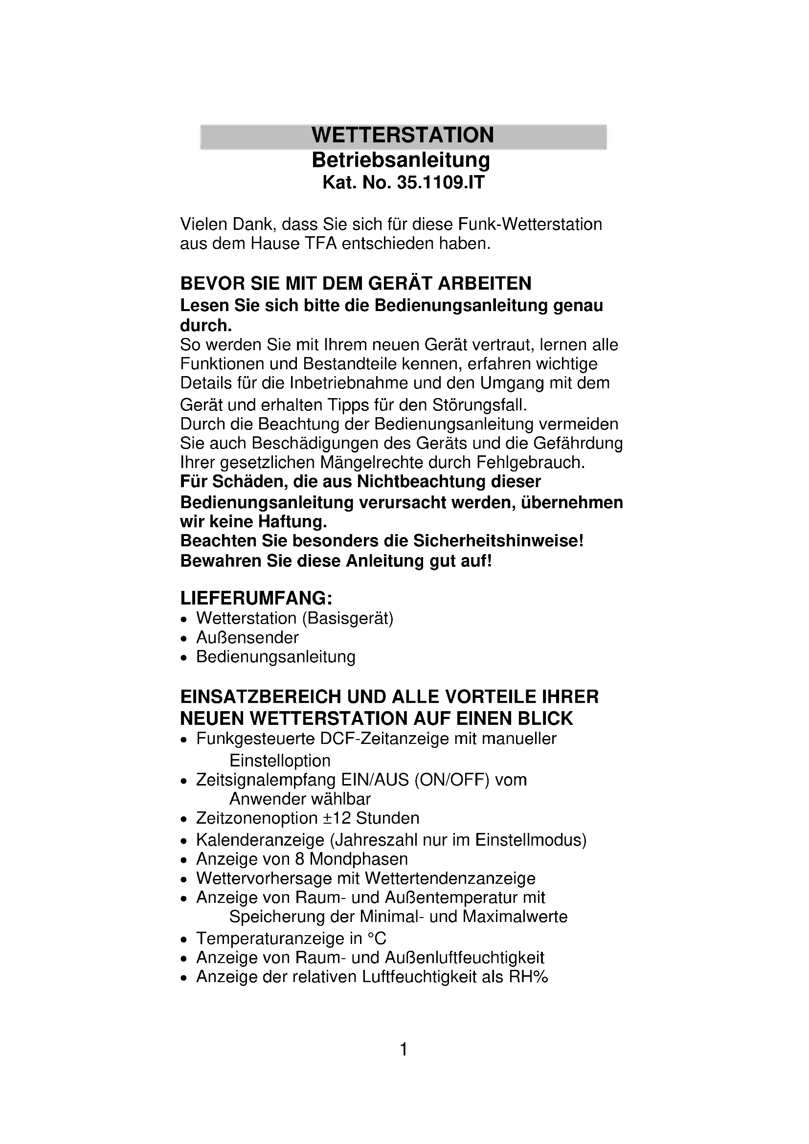 85*135mm1 WETTERSTATION Betriebsanleitung Kat. No. 35.1109.IT Vielen Dank, dass Sie sich für diese Funk-Wetterstation aus dem Hause TFA entschieden haben. BEVOR SIE MIT DEM GERÄT ARBEITEN Lesen Sie sich bitte die Bedienungsanleitung genau durch. So werden Sie mit Ihrem neuen Gerät vertraut, lernen alle Funktionen und Bestandteile kennen, erfahren wichtige Details für die Inbetriebnahme und den Umgang mit dem Gerät und erhalten Tipps für den Störungsfall. Durch die Beachtung der Bedienungsanleitung vermeiden Sie auch Beschädigungen des Geräts und die Gefährdung Ihrer gesetzlichen Mängelrechte durch Fehlgebrauch. Für Schäden, die aus Nichtbeachtung dieser Bedienungsanleitung verursacht werden, übernehmen wir keine Haftung. Beachten Sie besonders die Sicherheitshinweise! Bewahren Sie diese Anleitung gut auf! LIEFERUMFANG: Wetterstation (Basisgerät) Außensender Bedienungsanleitung