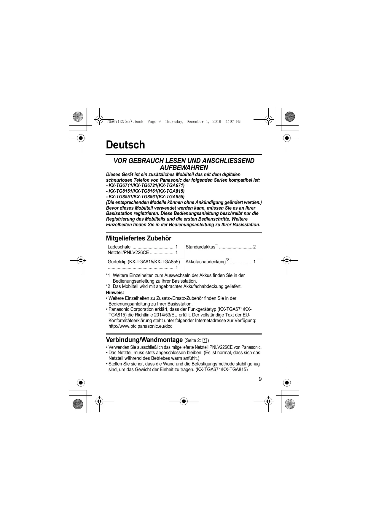 - Panasonic Corporation erklärt, dass der Funkgerätetyp (KX-TGA671/KXTGA815) die Richtlinie 2014/53/EU erfüllt. Der vollständige Text der EUKonformitätserklärung steht unter folgender Internetadresse zur Verfügung: http://www.ptc.panasonic.eu/doc Verbindung/Wandmontage (Seite 2: 1)